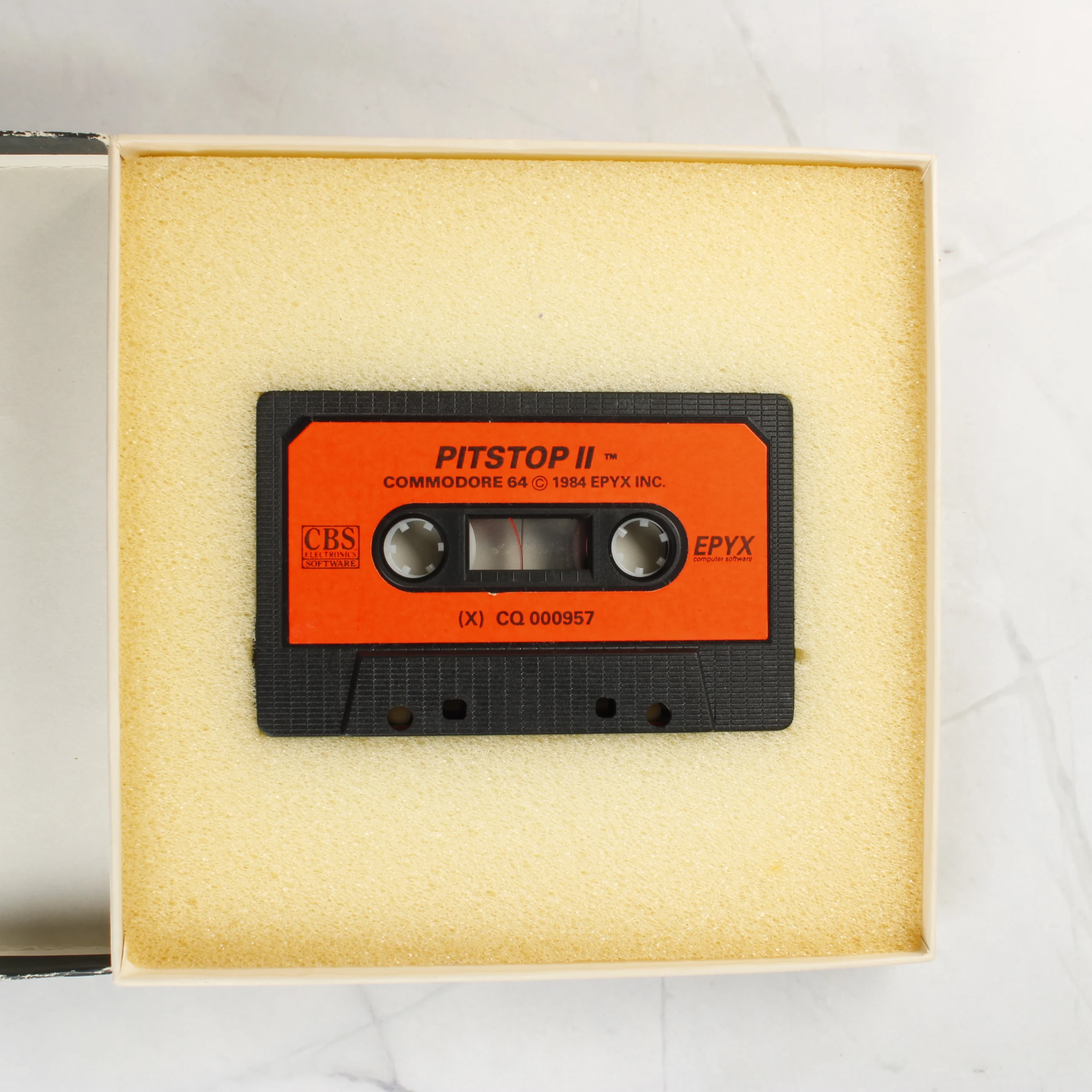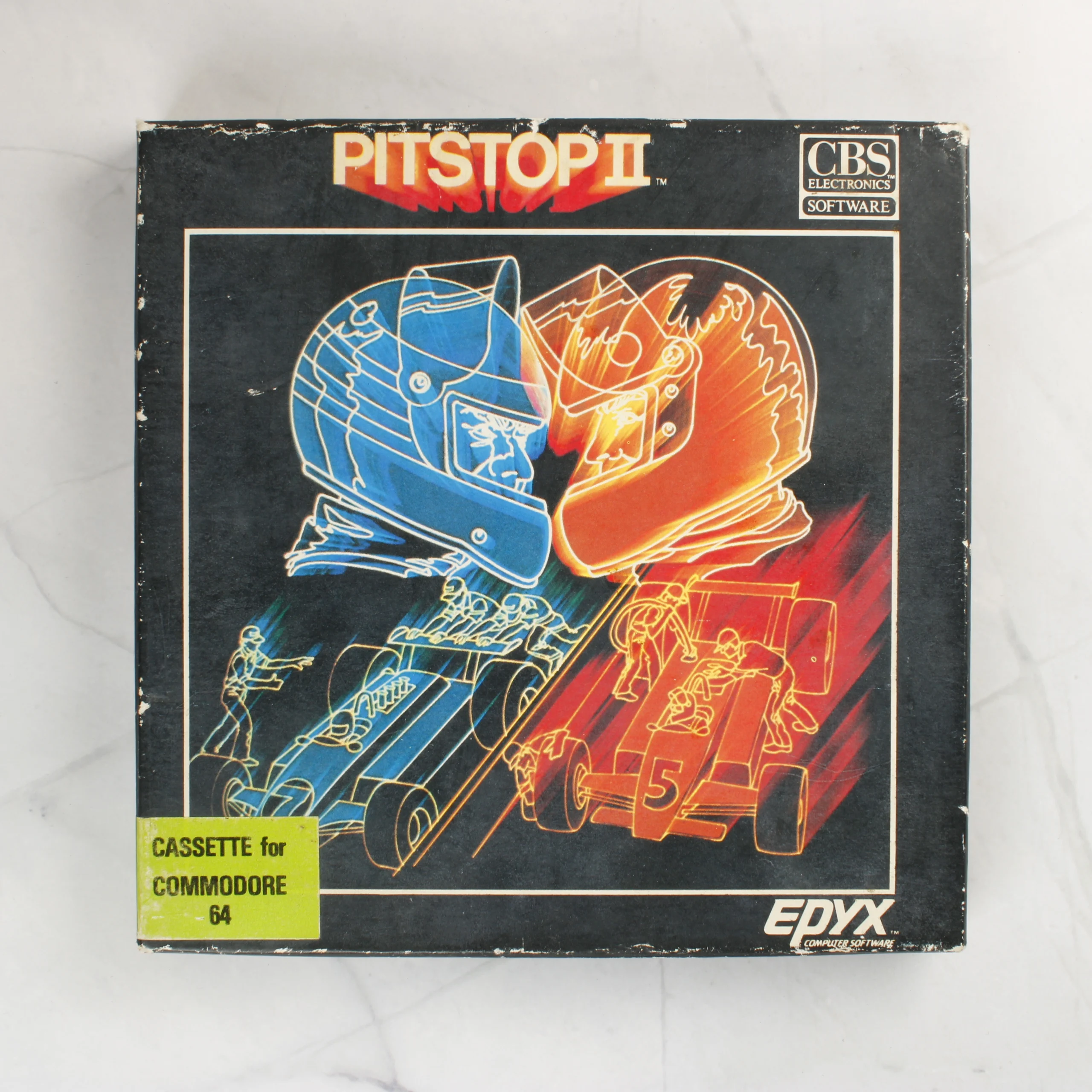 A Pitstop II című videójáték Commodore 64 platformra készült kiadása. A csomag egy eredeti kartondobozt és egy adathordozó kazettát tartalmaz. A fekete alapszínű doboz elején két versenyzői sisak és versenyautók stilizált grafikája látható kék és narancssárga színekben. A doboz bal alsó sarkában egy sárga matrica jelzi a kazettás formátumot. A hátoldalon angol nyelvű leírás, egy képernyőkép és a technikai adatok szerepelnek. A belső részben egy sárga szivacságyban helyezkedik el a fekete műanyag házas kazetta, amelyen narancssárga címke található a játék címével és a kiadók logóival. A doboz élei mentén látható kopások és fehér foltok jelzik a használatot és az idő múlását.