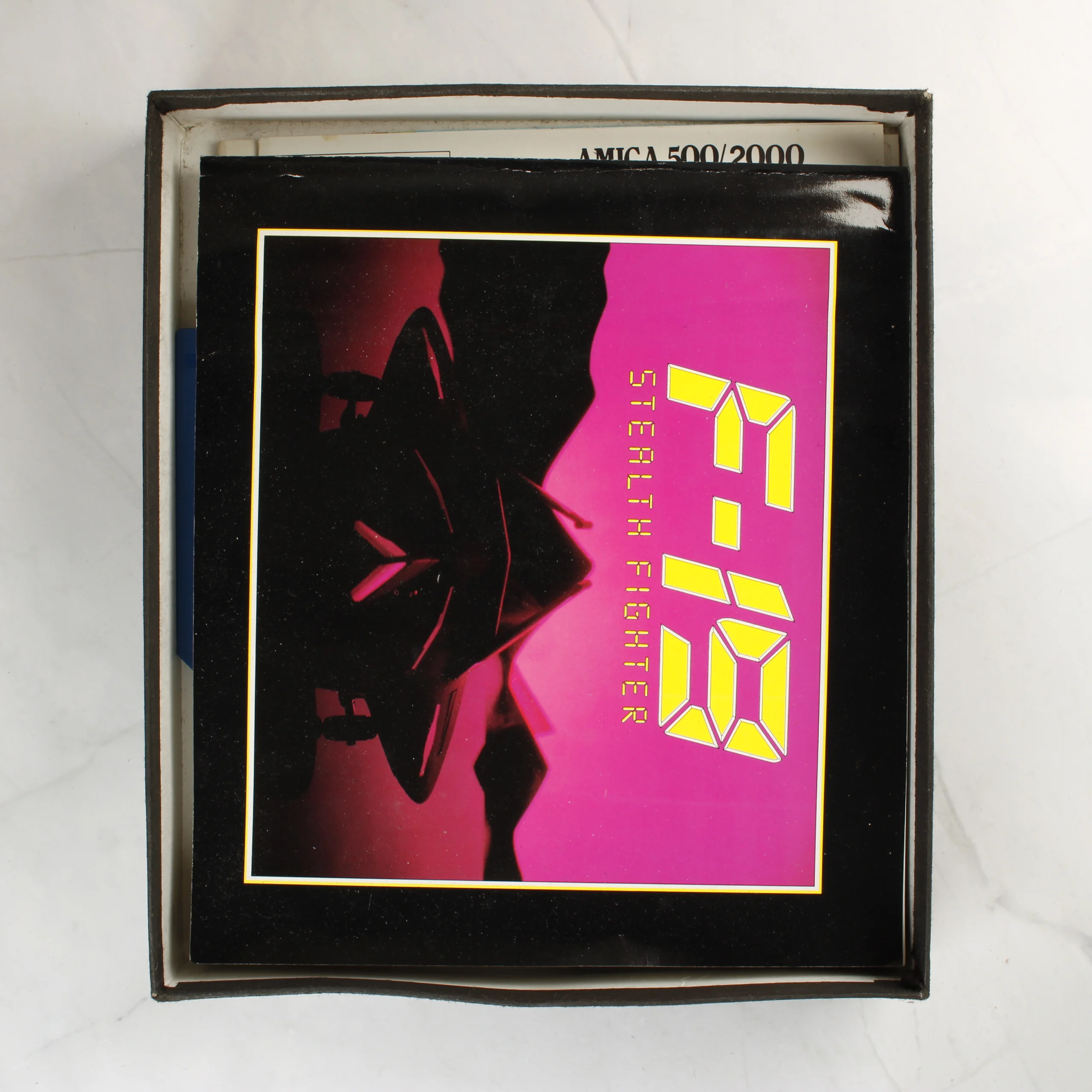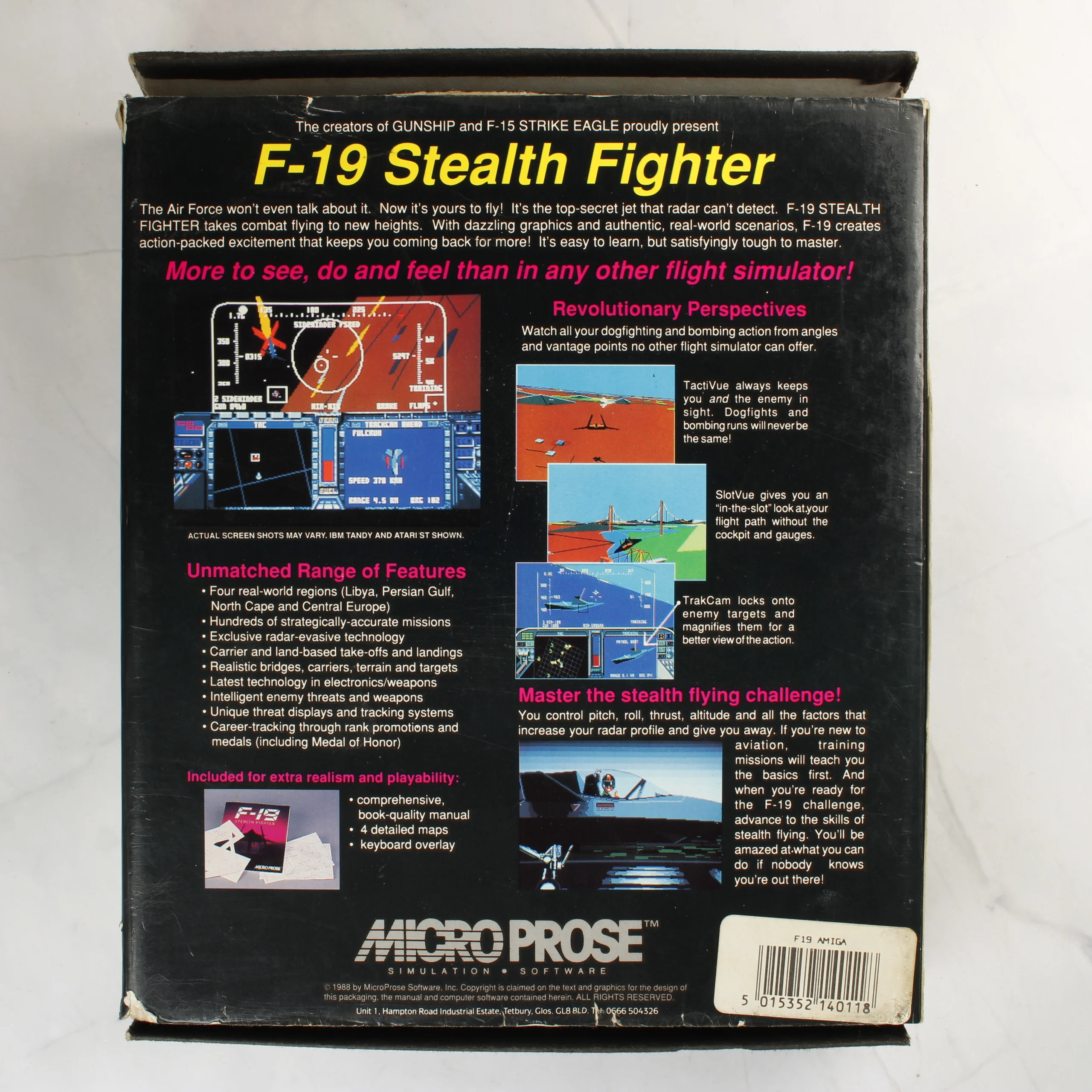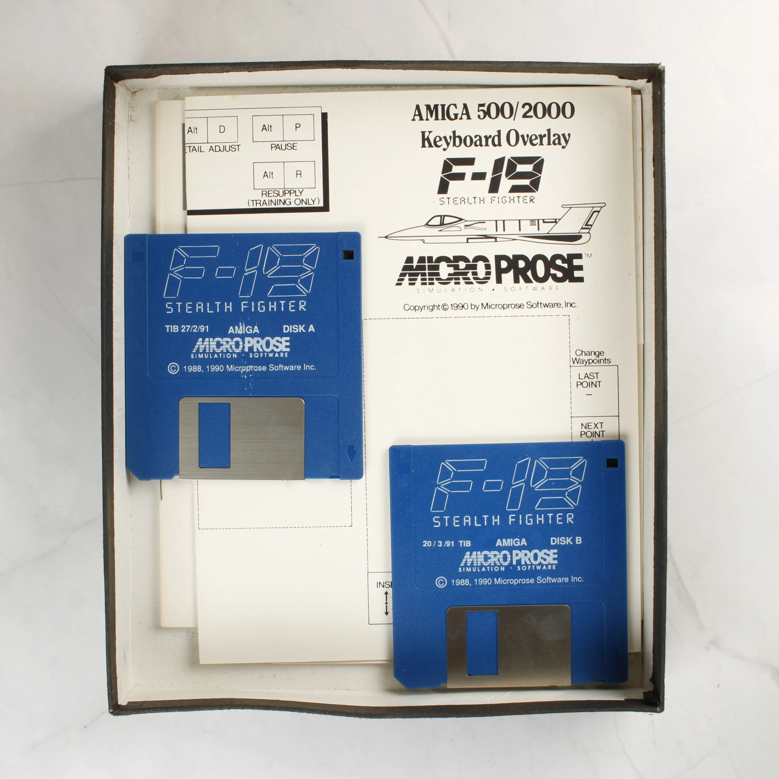 Az F-19 Stealth Fighter egy klasszikus repülőgép-szimulátor videójáték Amiga platformra, a MicroProse gondozásában. A csomag tartalmazza az eredeti, nagyméretű kartondobozt, amelyen egy lopakodó vadászgép sziluettje látható lila háttér előtt. A doboz belsejében két darab kék színű, 3,5 colos floppy lemez található, melyek a játék szoftverét tartalmazzák. Mellékelve van továbbá egy részletes, fekete borítós kézikönyv, egy billentyűzet-sablon az Amiga 500/2000 modellekhez, valamint egyéb nyomtatott dokumentációk. A doboz hátoldalán színes képernyőmentések és a játék főbb jellemzőinek leírása látható angol nyelven. A kiadás PAL rendszerű, amit a dobozon elhelyezett kerek matrica is jelez.