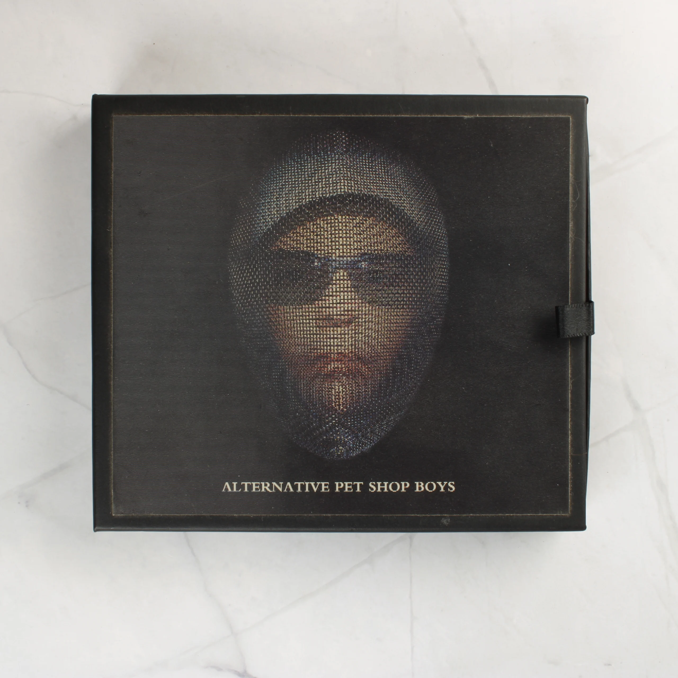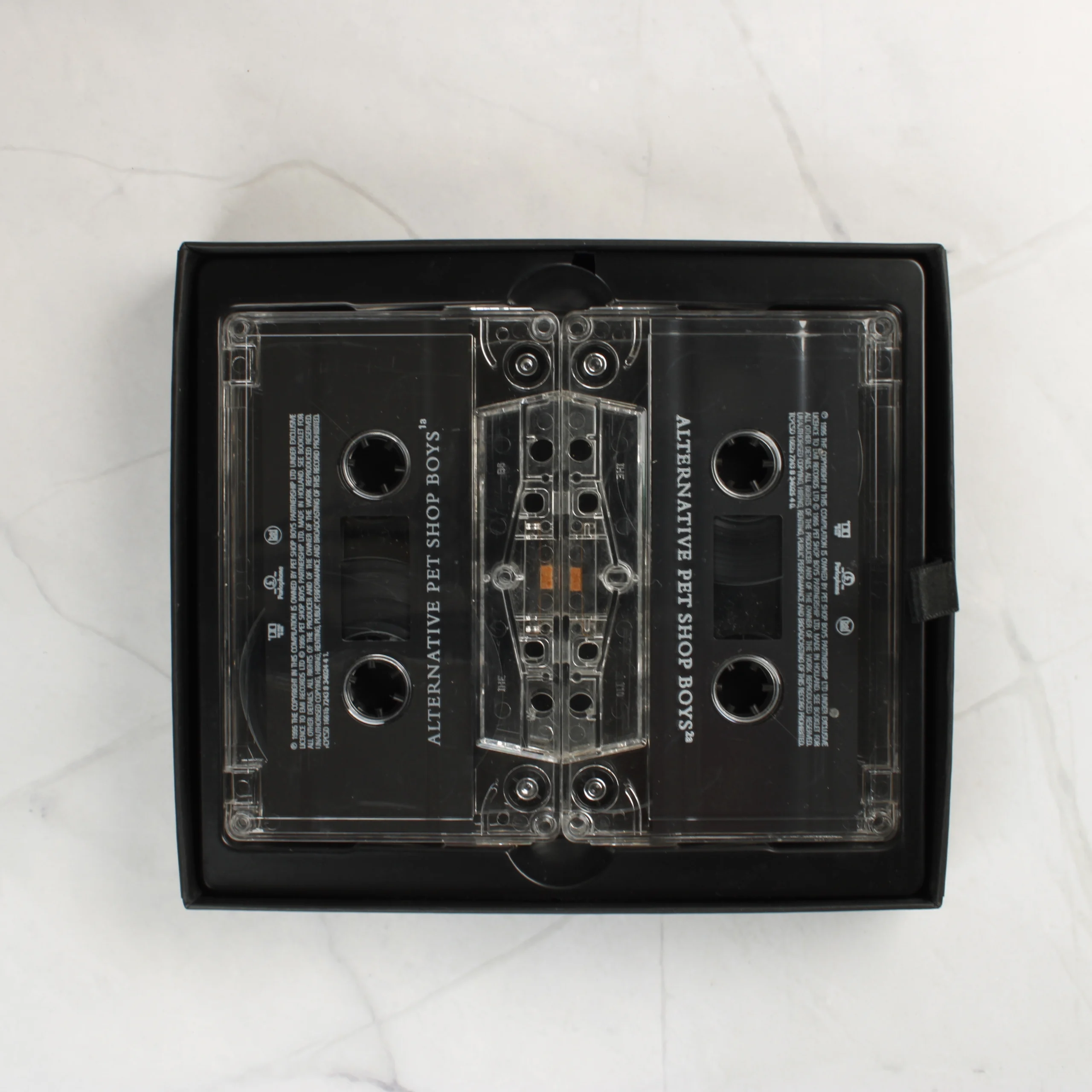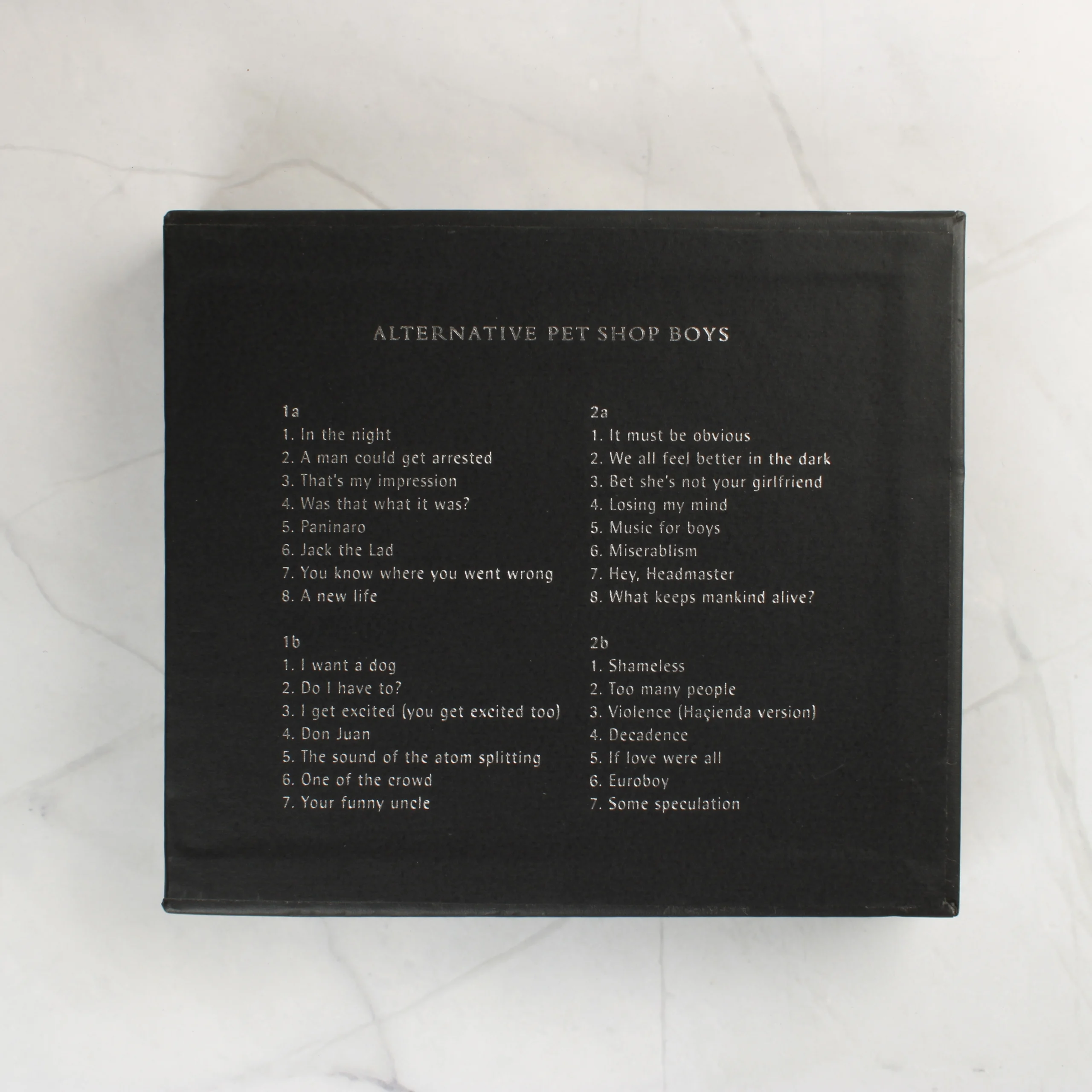 A Pet Shop Boys együttes Alternative című válogatásalbumának díszdobozos kiadása. A fekete színű, texturált felületű keménykarton doboz elején egy rácsos maszkot viselő arc látható, alatta az album címe olvasható. A készlet két darab átlátszó műanyag házas magnókazettát tartalmaz, amelyek egy fekete tálcában helyezkednek el. A csomag részét képezi egy többoldalas kísérőfüzet is, amely színes illusztrációkat és részletes dallistát tartalmaz. A doboz hátoldalán a kazetták oldalai szerint csoportosított számcímek szerepelnek fehér felirattal. A kiadvány a Parlophone és az EMI Records gondozásában jelent meg. A doboz oldalán egy kis fekete textilfül segíti a nyitást. A külső csomagoláson és a füzeten minimális használati nyomok, enyhe élkopások láthatóak, de az összkép megkímélt állapotot tükröz.