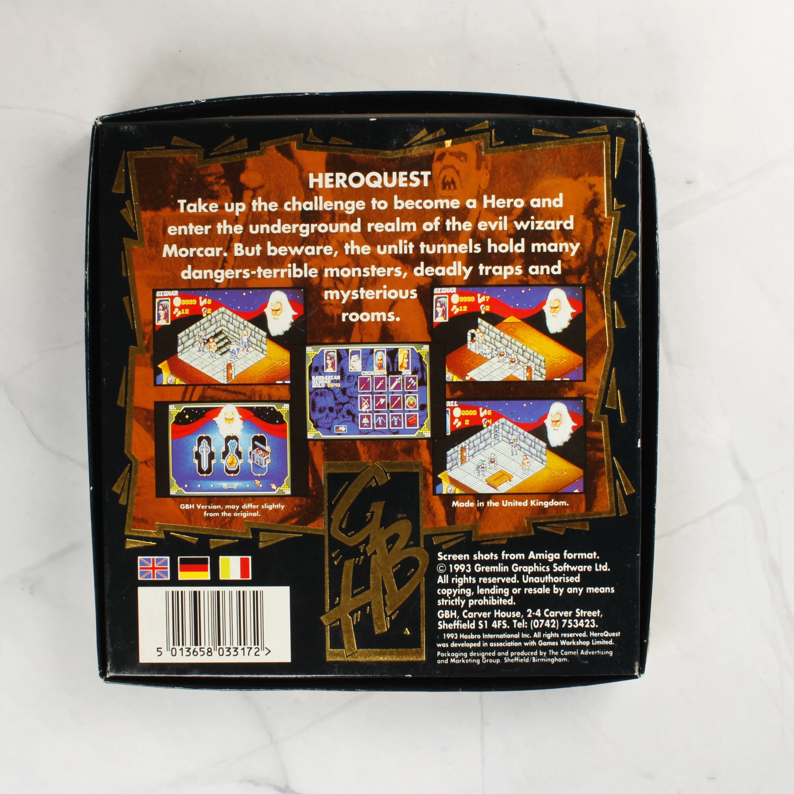 A HeroQuest videójáték Amiga platformra készült kiadása eredeti dobozban. A csomag tartalmazza a kék színű 3,5 colos floppy lemezt, a fekete-fehér illusztrációkkal ellátott használati útmutatót és egy regisztrációs kártyát. A doboz elején a klasszikus fantasy illusztráció látható egy barbár harcossal, valamint a GBH Gold sorozat logója és kritikai értékelések. A hátoldalon angol nyelvű leírás és játékmenet-képek találhatók. A kiadvány a Gremlin Graphics Software gondozásában jelent meg 1993-ban. A doboz sarkai és élei enyhén kopottak, de a grafika jól kivehető és a színek élénkek. A belső tartalom tiszta és hiánytalannak tűnik.
