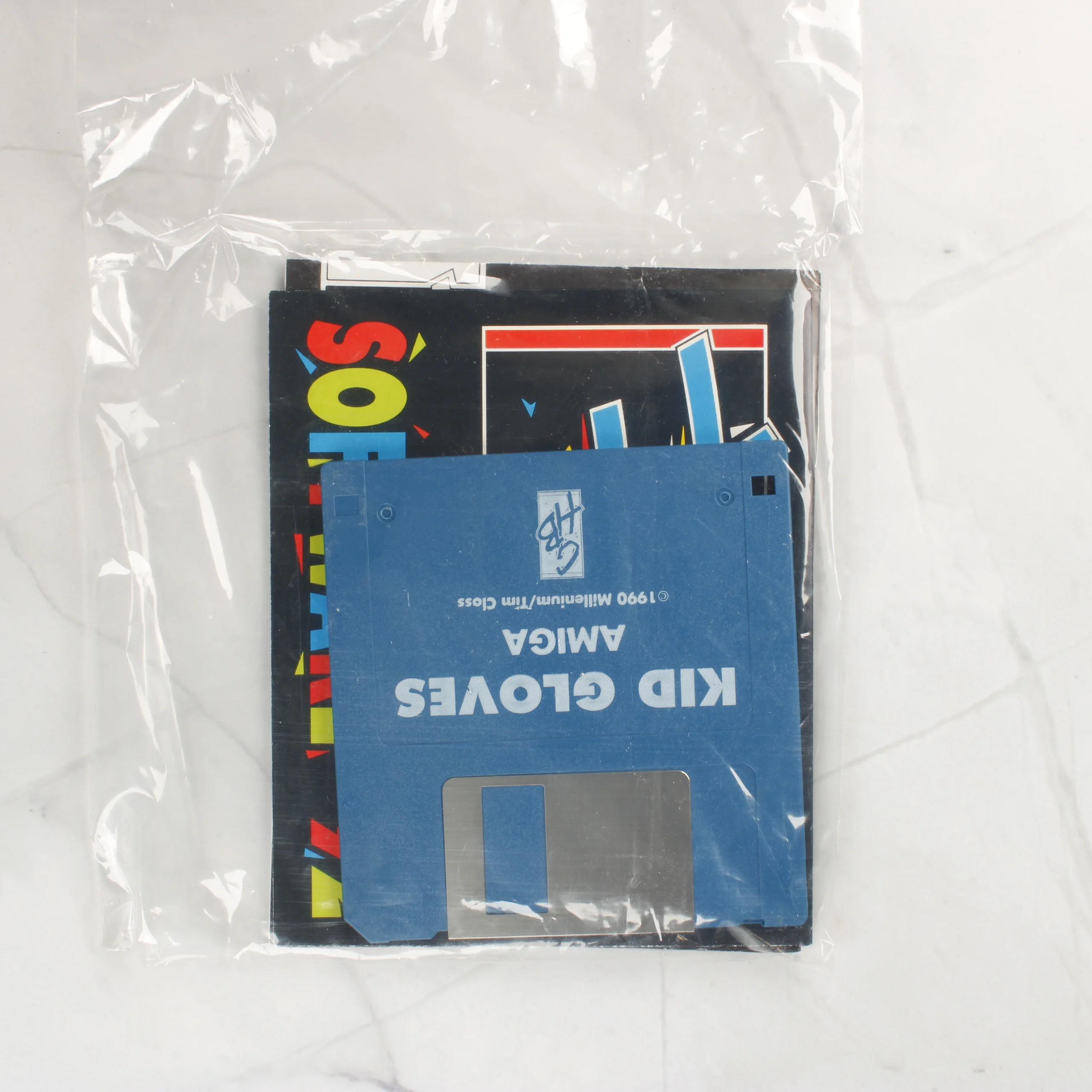 A Kid Gloves című videójáték Amiga platformra készült kiadása eredeti kartondobozban. A csomag tartalmaz egy 3,5 colos kék színű floppy lemezt és a hozzá tartozó nyomtatott dokumentációt, amelyek egy átlátszó védőtasakban találhatók. A doboz előlapján színes illusztráció látható egy bokszkesztyűt viselő karakterrel, egy kígyóval és egy ősemberrel, valamint különböző játékmagazinokból származó idézetekkel. A hátoldalon a játékmenetből vett képernyőfotók és egy rövid angol nyelvű leírás olvasható. A dobozon több helyen régi árcímkék és ragasztómaradványok láthatók, a sarkoknál és éleknél pedig enyhe kopás tapasztalható. A GBH logó hangsúlyosan megjelenik mind a dobozon, mind a lemezen.