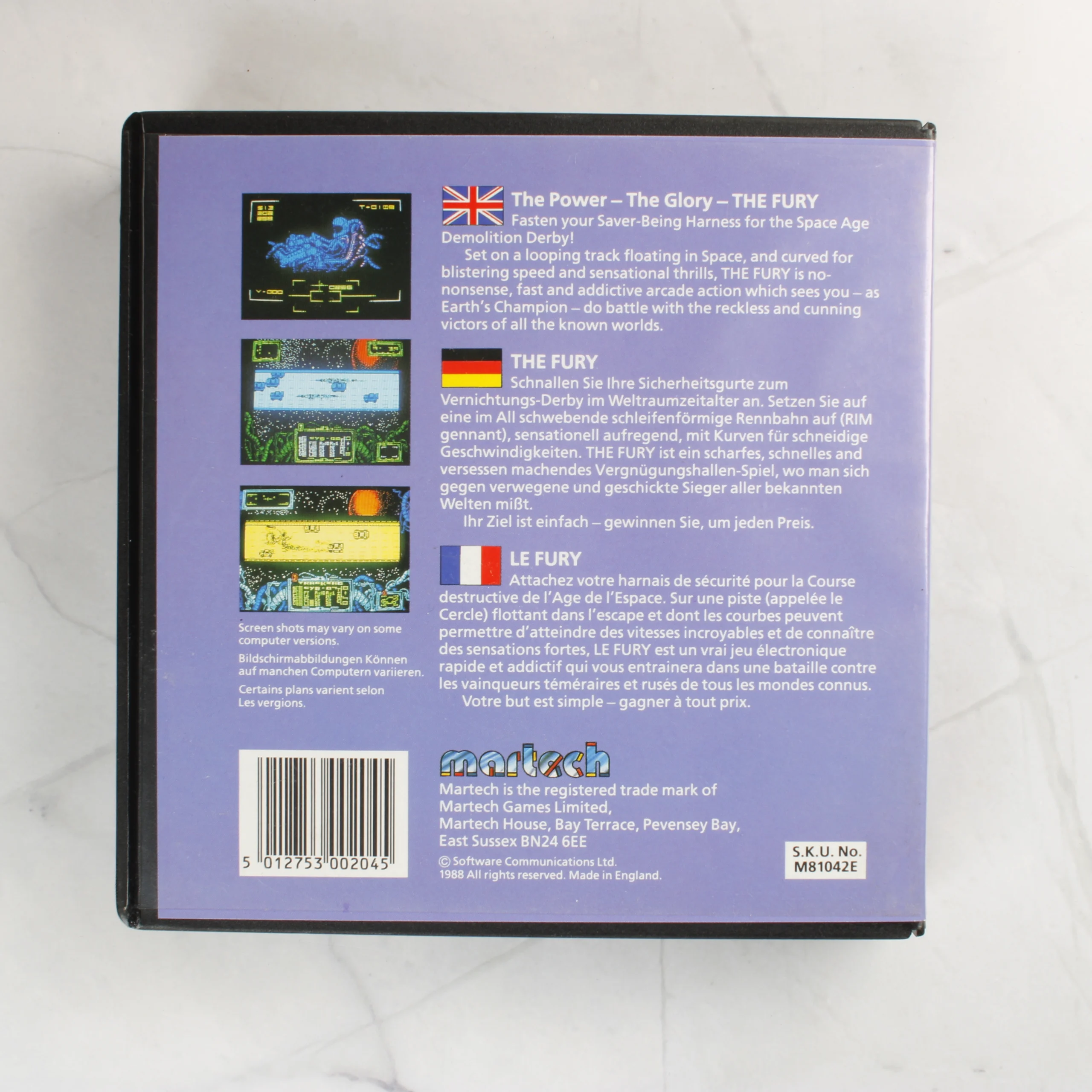 A The Fury című videójáték Commodore 64 és 128 számítógépekhez készült kiadása. A csomag tartalmazza az eredeti fekete műanyag tokot, amelyben a színes illusztrációval ellátott borító található. A borítón futurisztikus versenyautók láthatók egy űrbéli pályán. A hátoldalon angol, német és francia nyelvű leírás olvasható, valamint három képernyőkép látható a játékmenetből. A készlet része maga az adathordozó kazetta is, amely fekete műanyag házban van, fehér címkével. A címkén a játék címe, a Martech logója és a betöltési utasítások szerepelnek. A tok és a kazetta állapota megkímélt, a borító színei élénkek, a műanyag felületeken csak minimális használati nyomok fedezhetők fel.