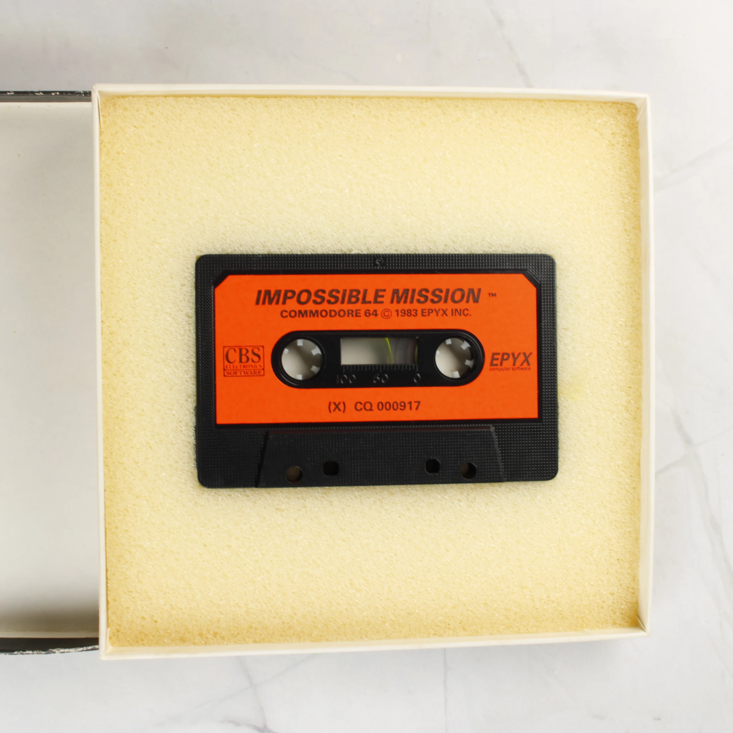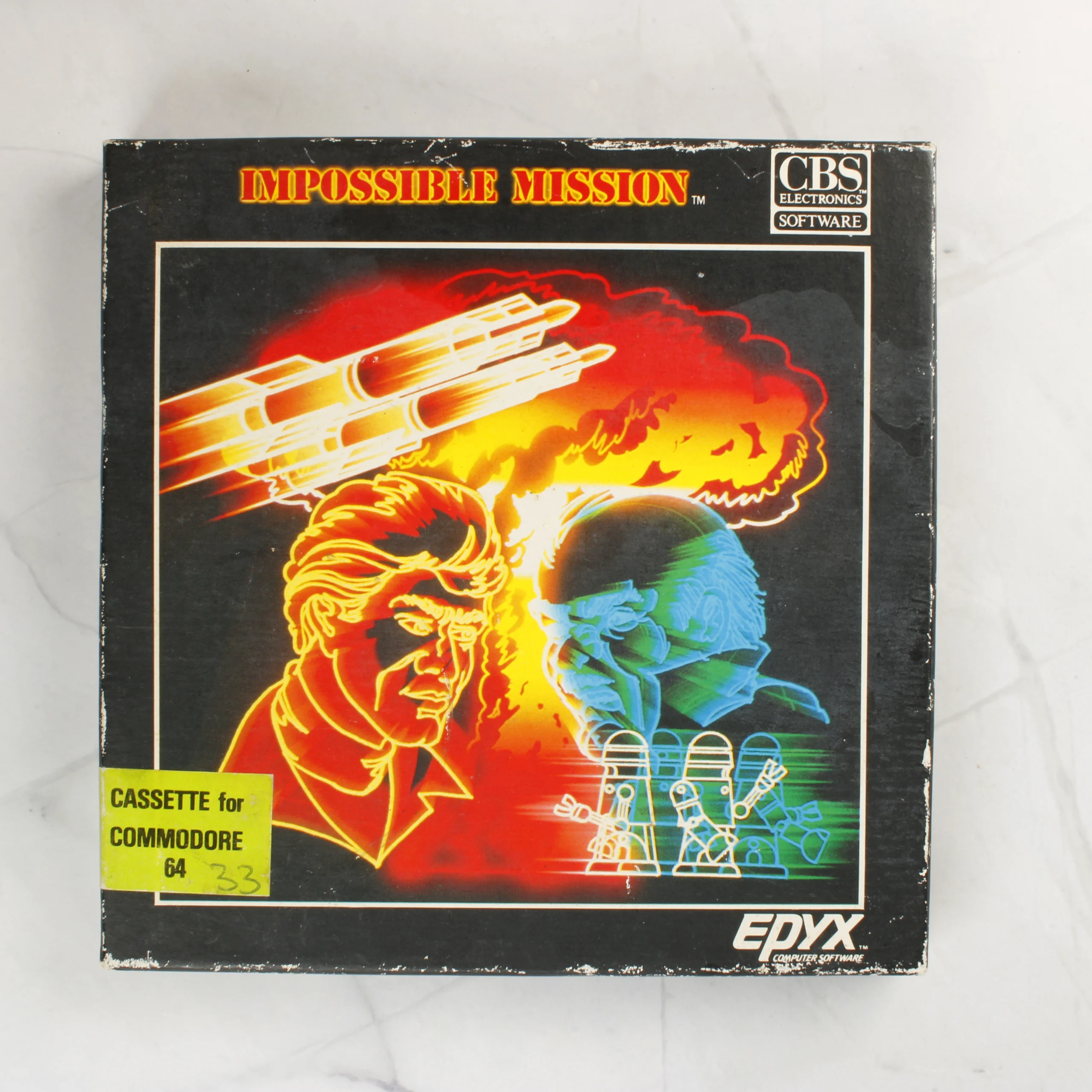Az Impossible Mission című videójáték Commodore 64 platformra készült kiadása. A csomag egy fekete kartondobozt tartalmaz, amelynek elején színes, neonstílusú grafika látható két karakterrel és egy robbanással. A dobozban egy fekete színű, narancssárga címkés kazetta található, amely sárgás szivacságyban fekszik. A mellékelt dokumentáció egy fehér papírlap, amelyen piros betűkkel olvashatók a betöltési útmutatók. A doboz hátoldalán a játék leírása, egy képernyőkép és a technikai adatok szerepelnek. A kiadvány az Epyx és a CBS Electronics gondozásában jelent meg.