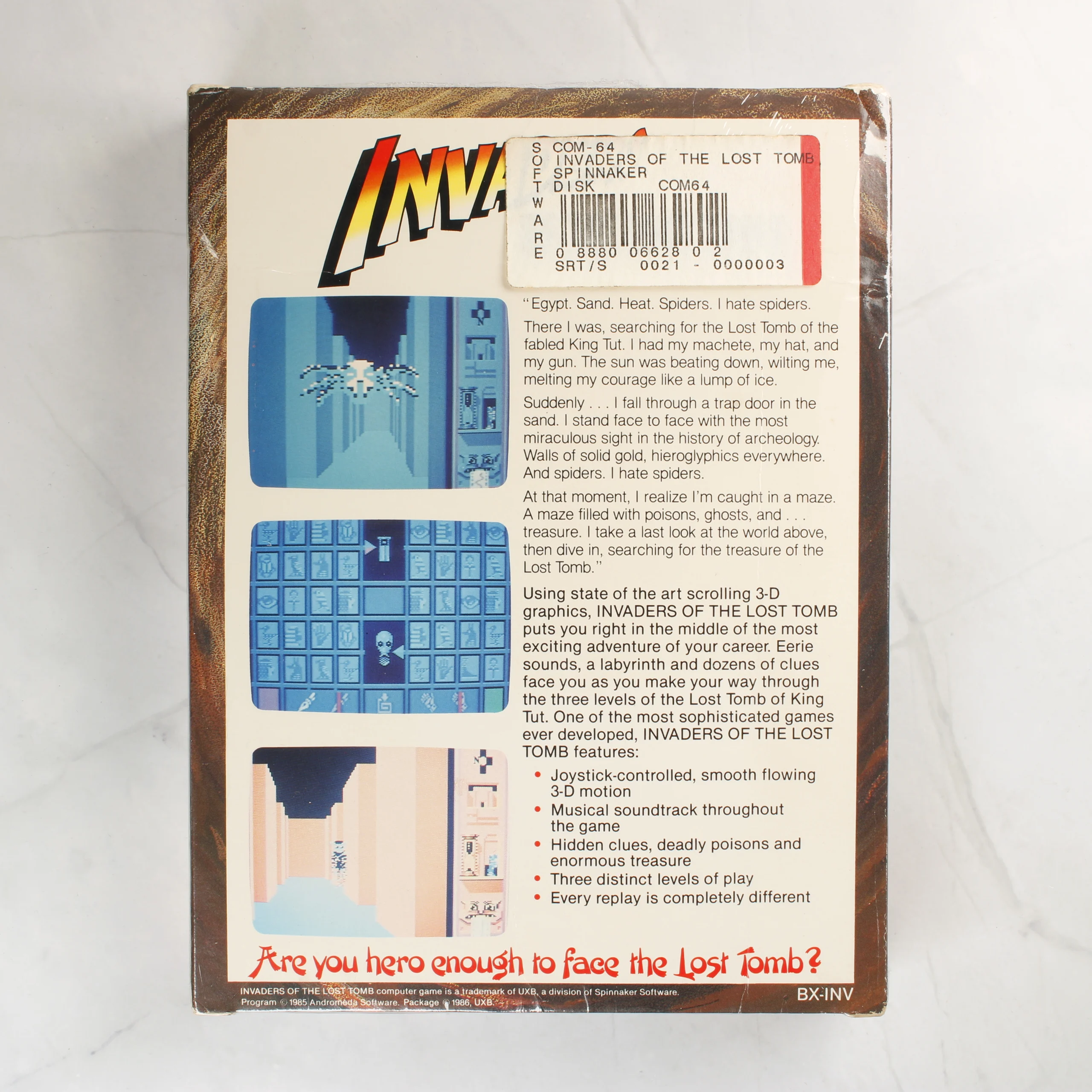Az Invaders of the Lost Tomb egy Commodore 64 platformra megjelent videójáték, amely eredeti kartondobozos csomagolásban látható. A doboz előlapján egy kalandor látható fáklyával és bozótvágó késsel egy barlangban, a háttérben piramisokkal. A hátoldalon három képernyőkép mutatja be a játékmenetet, mellette angol nyelvű leírás és a funkciók felsorolása olvasható. A csomagolás alsó sarkában a Commodore 64 Disk felirat jelzi az adathordozó típusát. A hátoldalon egy fehér alapú vonalkódos matrica található a felső részen.