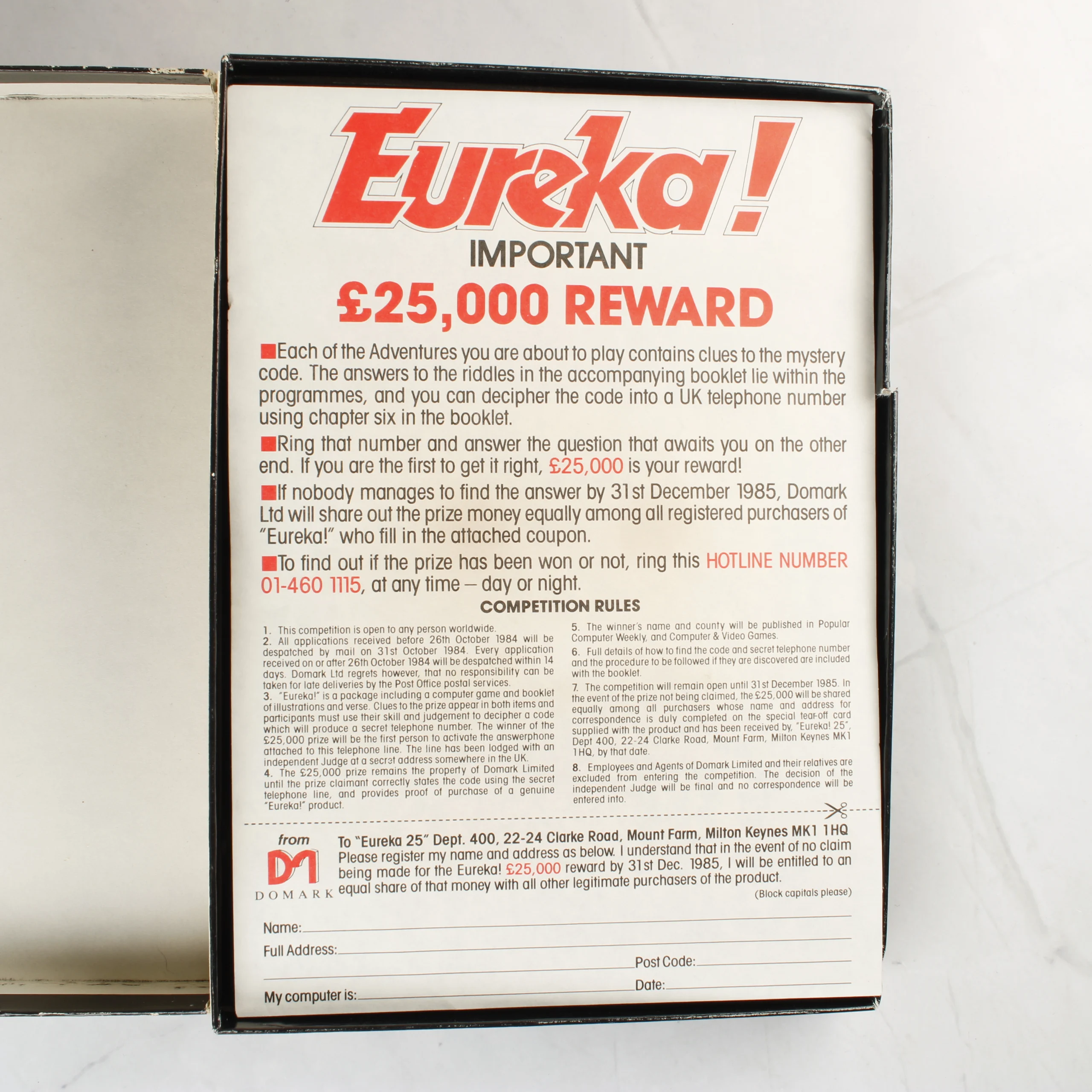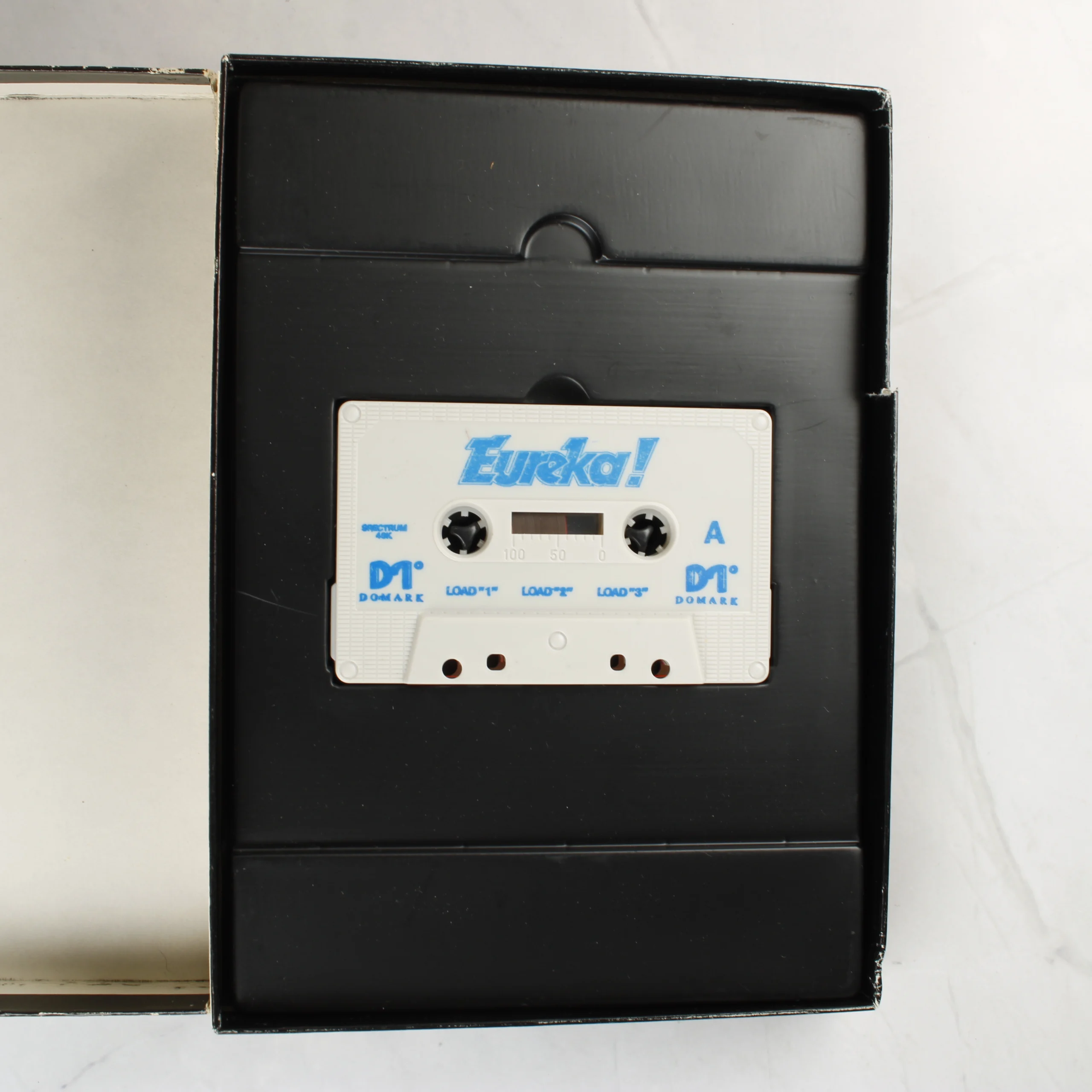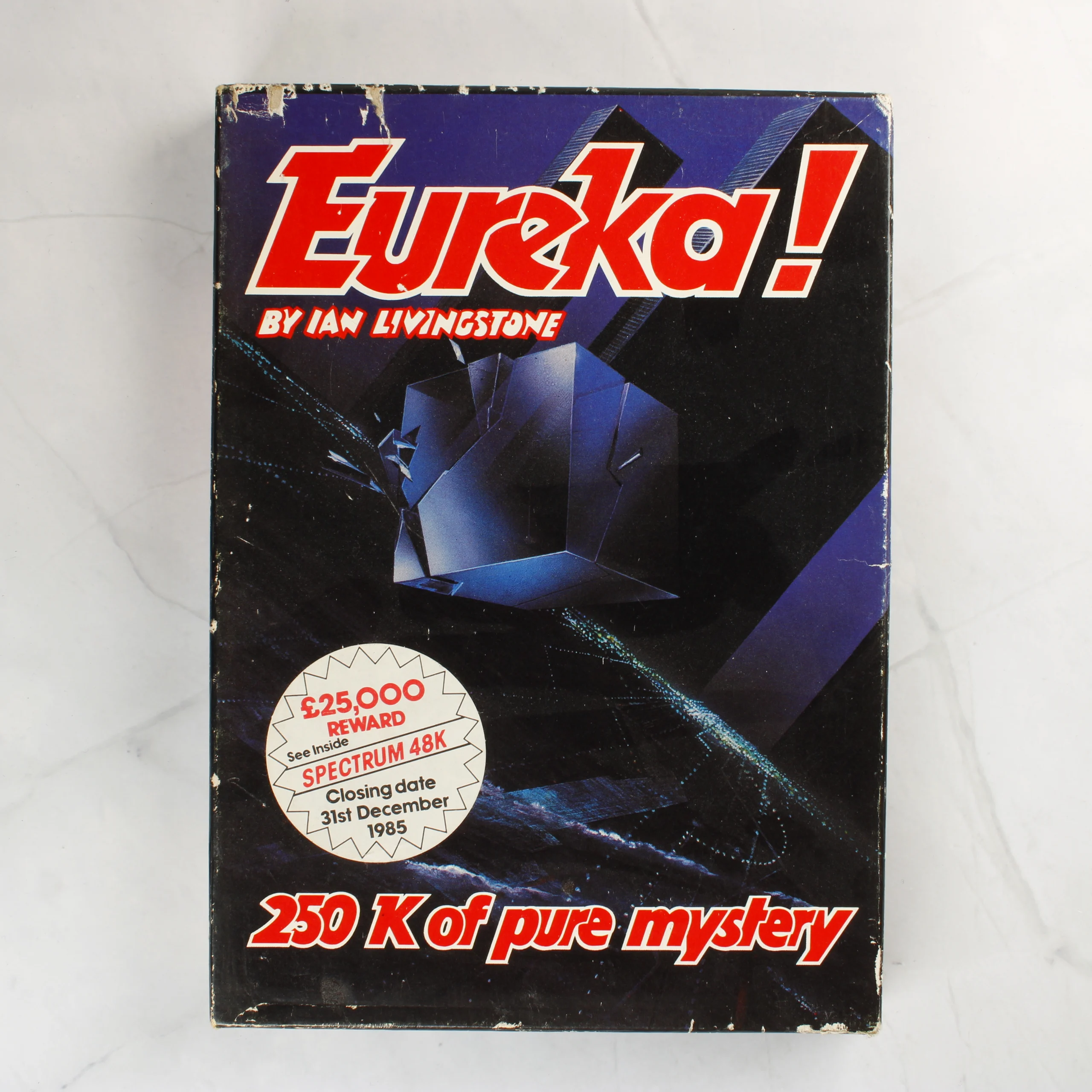 A termék egy eredeti dobozos Eureka! videójáték ZX Spectrum 48K számítógéphez, Ian Livingstone tollából. A csomag tartalmazza a fekete alapszínű, illusztrált kartondobozt, egy színes borítójú füzetet, egy fehér színű magnókazettát és egy információs lapot a nyereményjátékról. A doboz elején piros és fehér feliratok láthatók, valamint egy futurisztikus, kék tónusú grafika. A hátoldalon a Domark kiadó logója és címe szerepel. A belső fekete műanyag tálca rögzíti a kazettát, amelyen kék feliratok és a Domark logója látható. A mellékelt dokumentáció részletezi a 25 000 fontos jutalommal kapcsolatos szabályokat és egy kitölthető szelvényt is tartalmaz. A csomagolás és a papírok állapota korának megfelelő, látható kopásokkal a széleken.