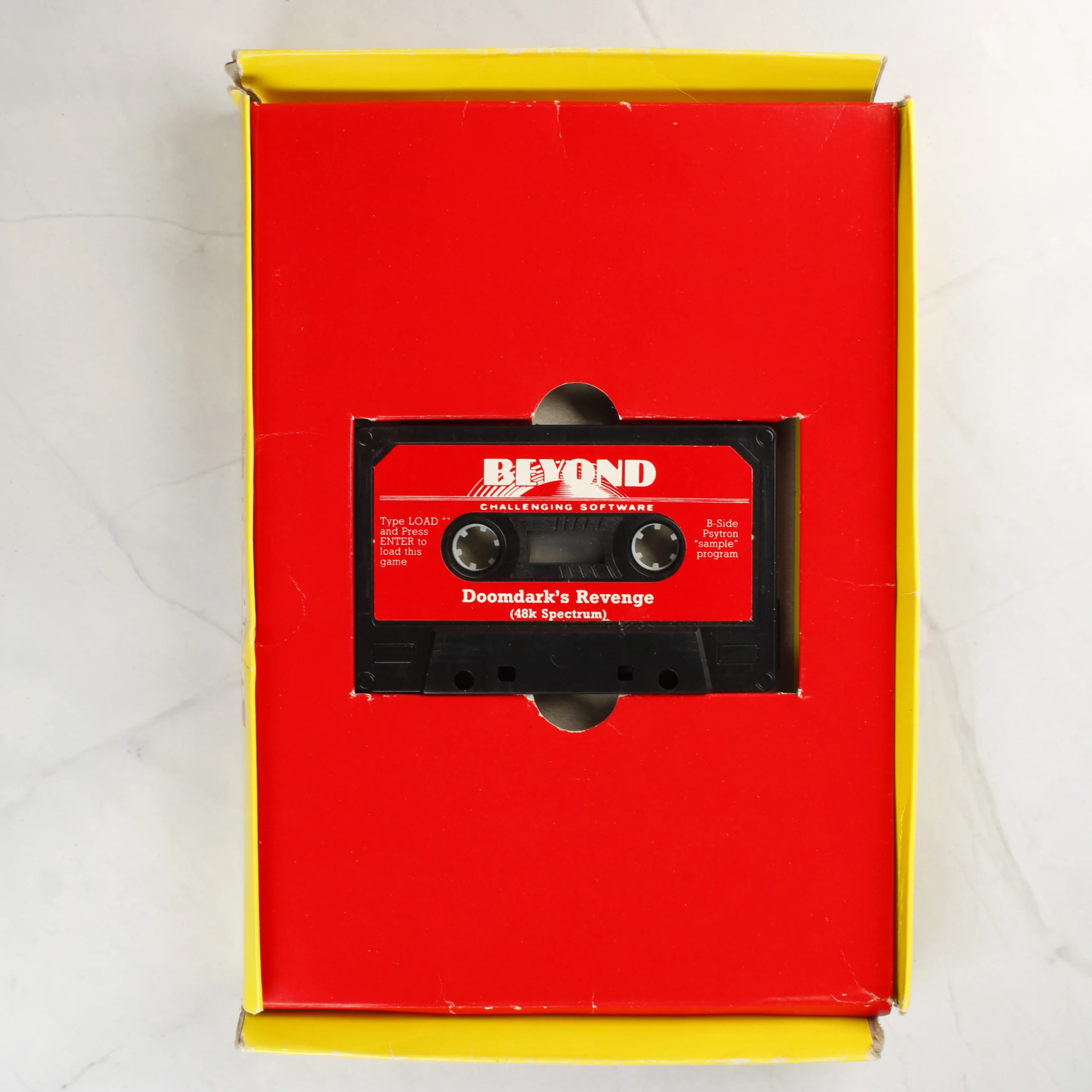 A Beyond Software által kiadott Doomdark's Revenge videójáték ZX Spectrum 48K platformra. A csomag tartalmazza az eredeti kartondobozt, egy műanyag tokos Lords of Midnight borítót, egy Elite irányítási útmutatót és a Doomdark's Revenge szoftvert tartalmazó magnókazettát. A kazetta fekete műanyag házas, piros címkével, amelyen fehér feliratok láthatóak. A doboz grafikája színes, fantasy stílusú illusztrációkkal díszített, Mike Singleton alkotása. A papíralapú kiegészítők és a doboz élei mentén használatból eredő kopások, enyhe gyűrődések és sárgulás tapasztalható. A belső piros kartonbetét, amely a kazettát tartja, jó állapotban maradt meg.