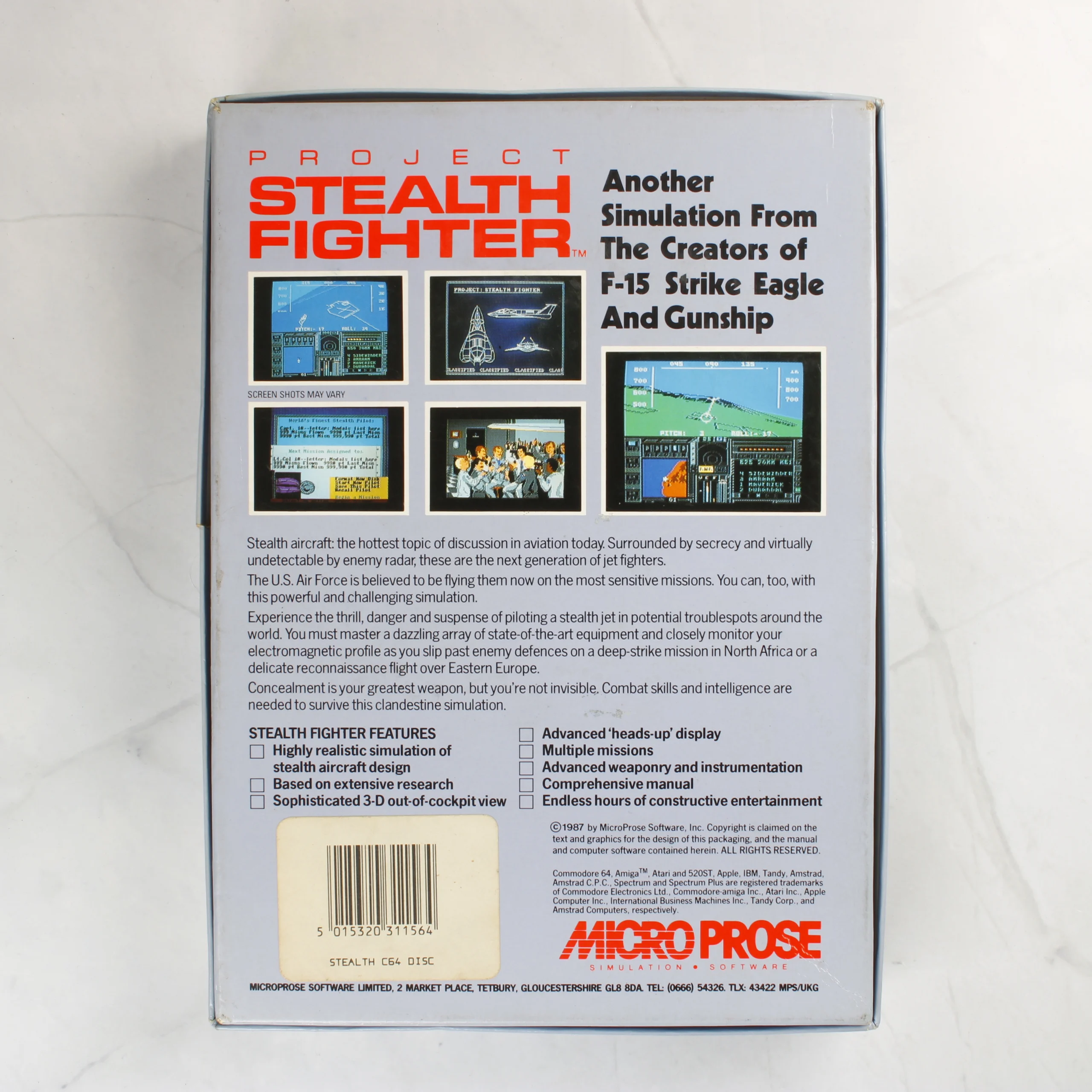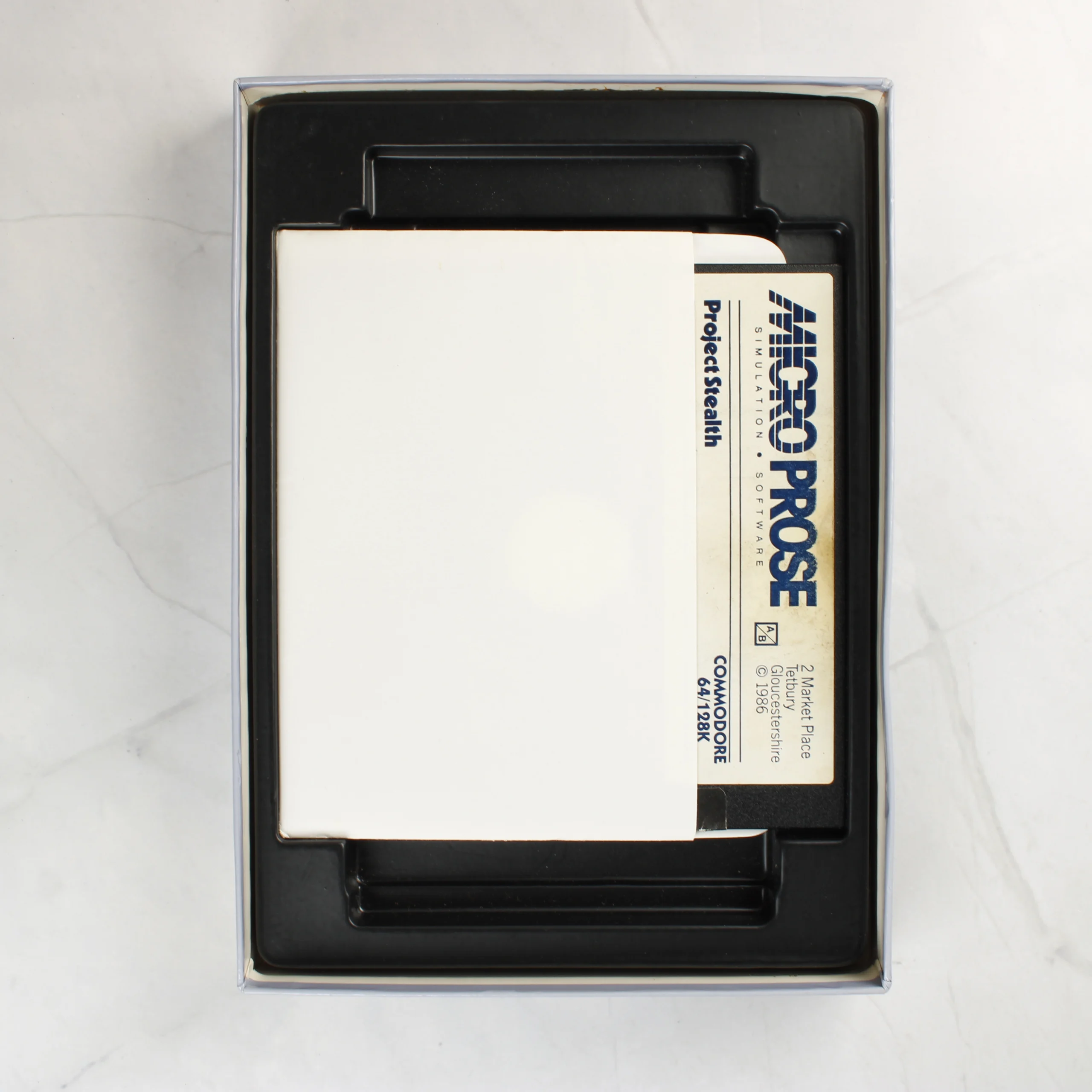 A Project Stealth Fighter egy klasszikus repülőgép-szimulátor videójáték Commodore 64/128 platformra. A csomag tartalmazza az eredeti, nagyméretű kartondobozt, amelyen egy lopakodó vadászgép látható bevetés közben. A doboz belsejében megtalálható a részletes, angol nyelvű műveleti kézikönyv (Operations Manual), egy térképmelléklet Líbia és Görögország térségéről, valamint egy 5,25 colos floppy lemez papírtokban, fekete műanyag belső tálcában elhelyezve. A doboz hátoldalán képernyőmentések és a játék jellemzőinek leírása látható. A MicroProse által kiadott szoftver korabeli, eredeti kiadás.