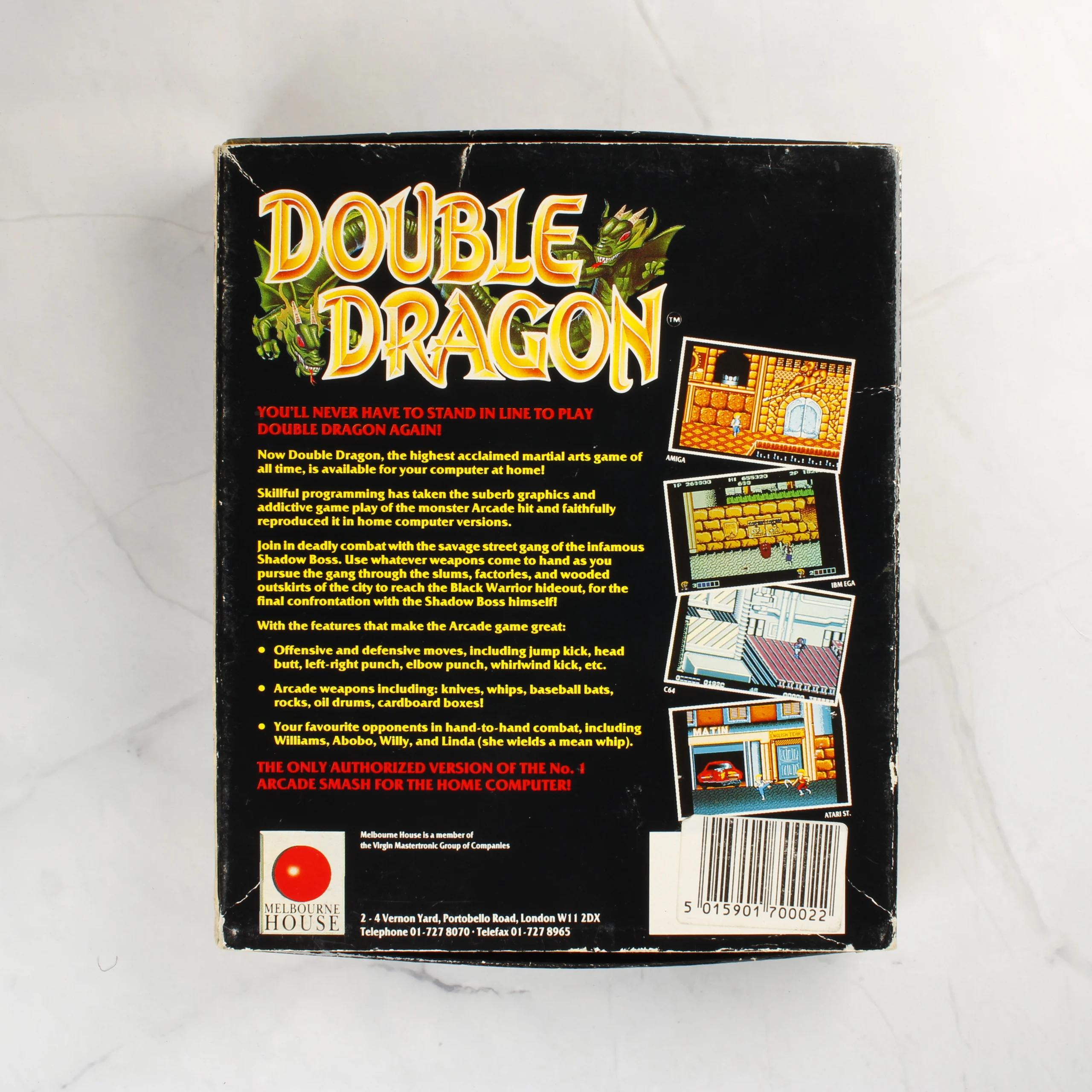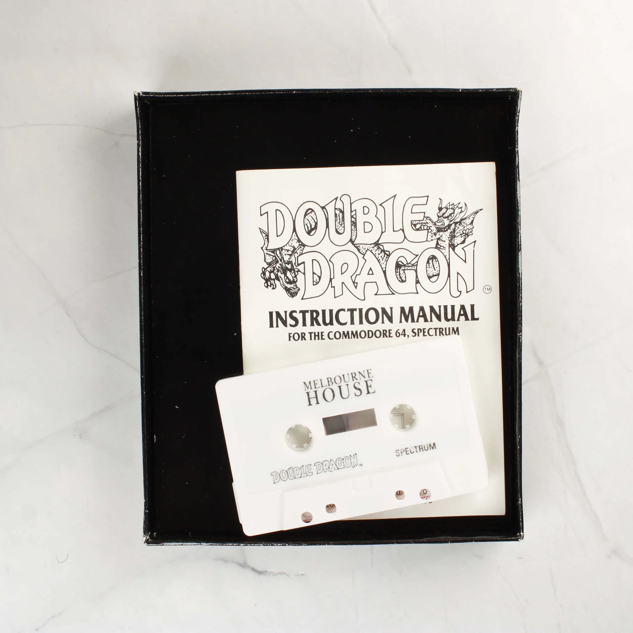 A Double Dragon videójáték ZX Spectrum 48K/128K platformra készült kiadása. A csomag tartalmazza az eredeti színes kartondobozt, egy fekete-fehér használati útmutatót és egy fehér színű műanyag kazettát. A doboz elején a játék jellegzetes illusztrációja látható két harcművésszel és sárkányokkal, piros háttér előtt. A hátoldalon angol nyelvű leírás és képernyőképek találhatók a különböző számítógépes változatokból. A kazetta felirata szerint Melbourne House kiadás. A papíralapú összetevőkön és a doboz élein használatból eredő kopások és kisebb benyomódások láthatók.