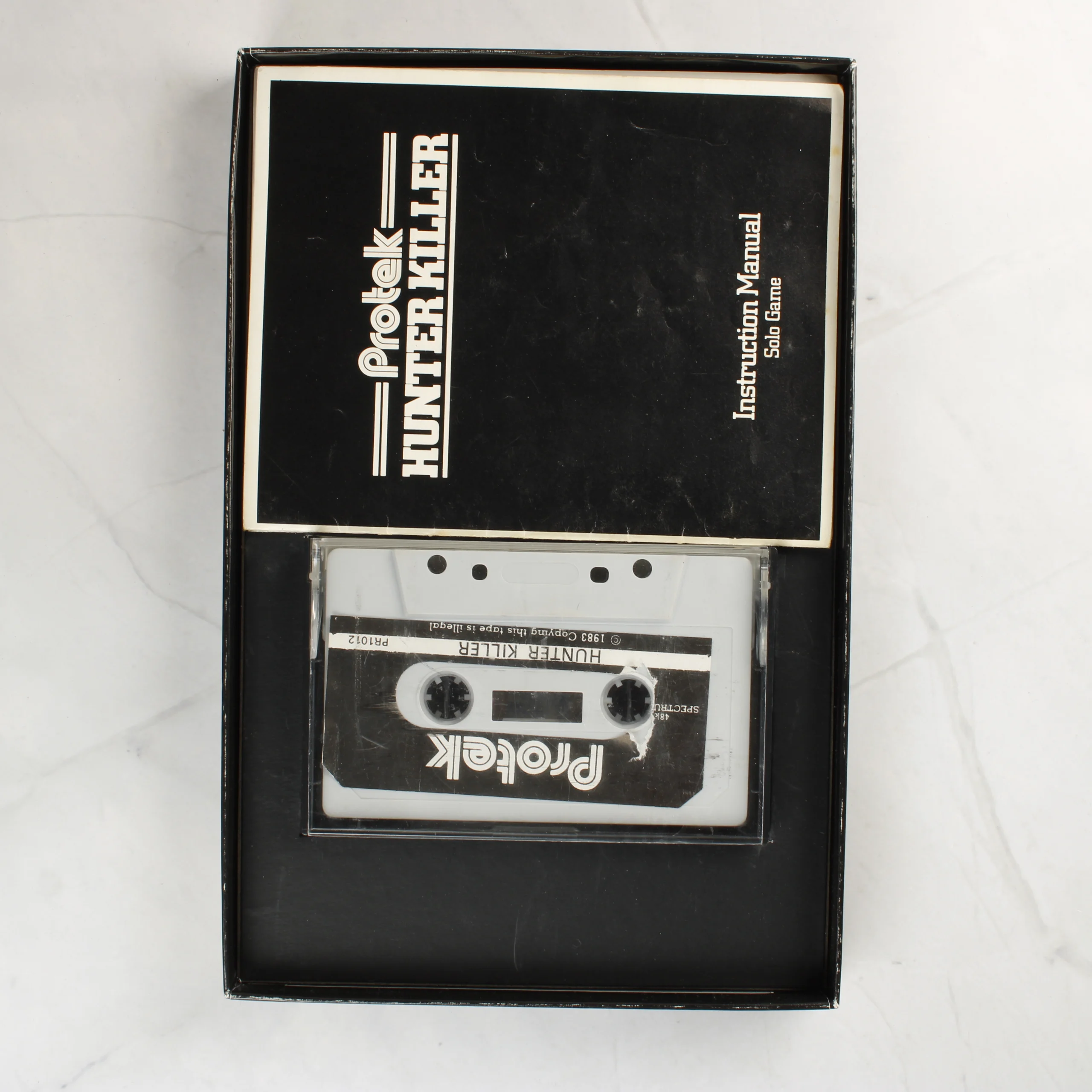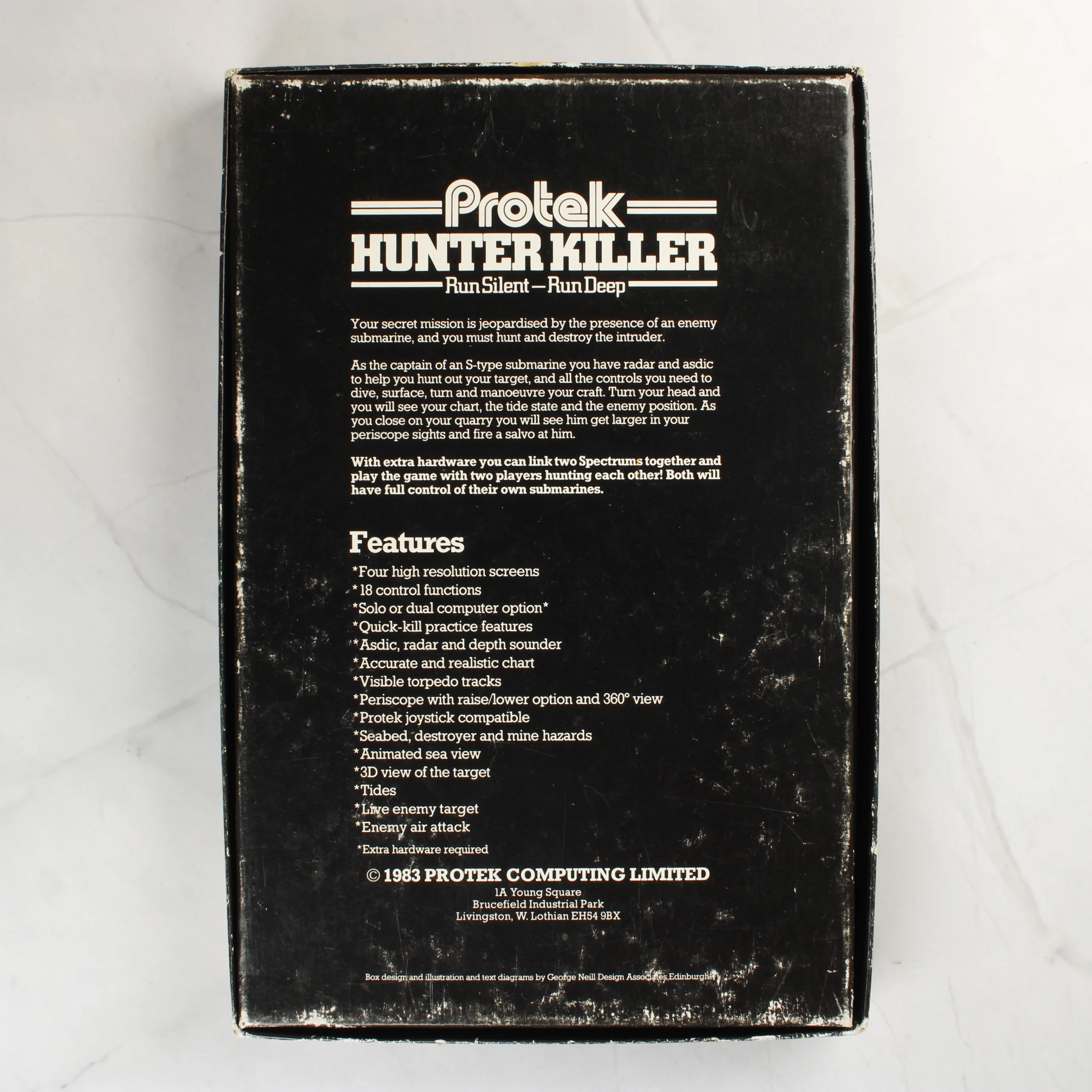 A Protek Hunter Killer című videójáték ZX Spectrum 48k számítógépre kiadott változata. A csomag tartalmazza az eredeti kartondobozt, egy fekete-fehér használati útmutatót és egy magnókazettát. A doboz elején egy tengeralattjárót ábrázoló grafika látható, felette a sárga Protek logóval és a játék címével. A hátoldalon a játék jellemzői és a Protek Computing Limited 1983-as szerzői jogi adatai olvashatóak. A kazetta szürke műanyag házas, fekete-fehér címkével ellátva, amelyen a Protek felirat és a játék címe szerepel. A belső fekete tálca rögzíti a kazettát és a füzetet.
