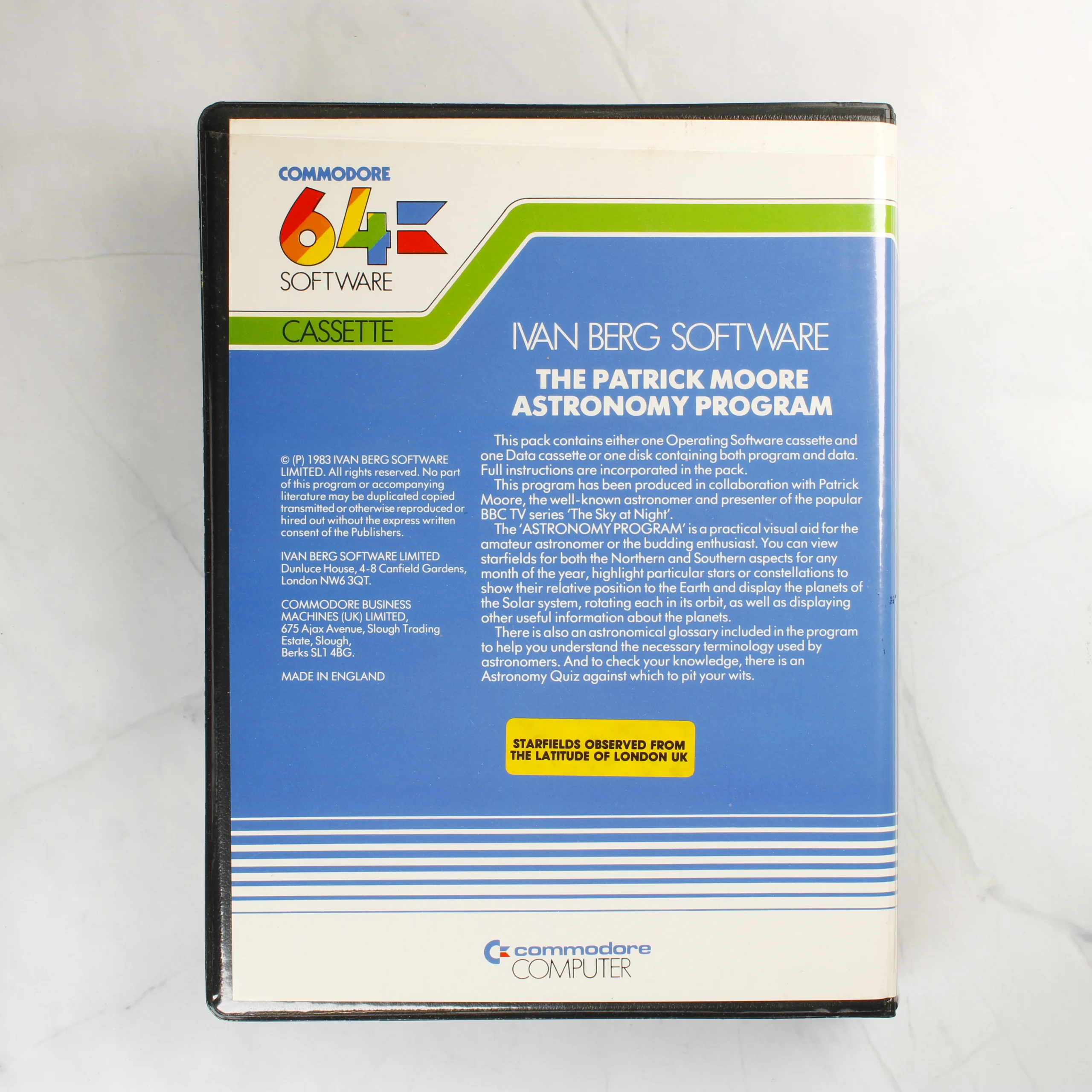Ez a Commodore 64 platformra készült csillagászati szoftvercsomag a The Patrick Moore Astronomy Program címet viseli. A kiadvány egy fekete, műanyagból készült, kihajtható tokban található, amelyben két fehér színű kazetta kapott helyet: egy Operating Software és egy Data feliratú egység. A csomag részét képezi továbbá egy nyomtatott használati útmutató is. A borítón Patrick Moore portréja látható egy bolygót ábrázoló háttér előtt. A tok és a belső tartalom korának megfelelő, megkímélt állapotban van, a műanyag borításon és a papír alapú részeken minimális kopás és sárgulás tapasztalható. A kazetták címkéi épek, a feliratok jól olvashatóak. A termék az Ivan Berg Software gondozásában jelent meg 1983-ban.