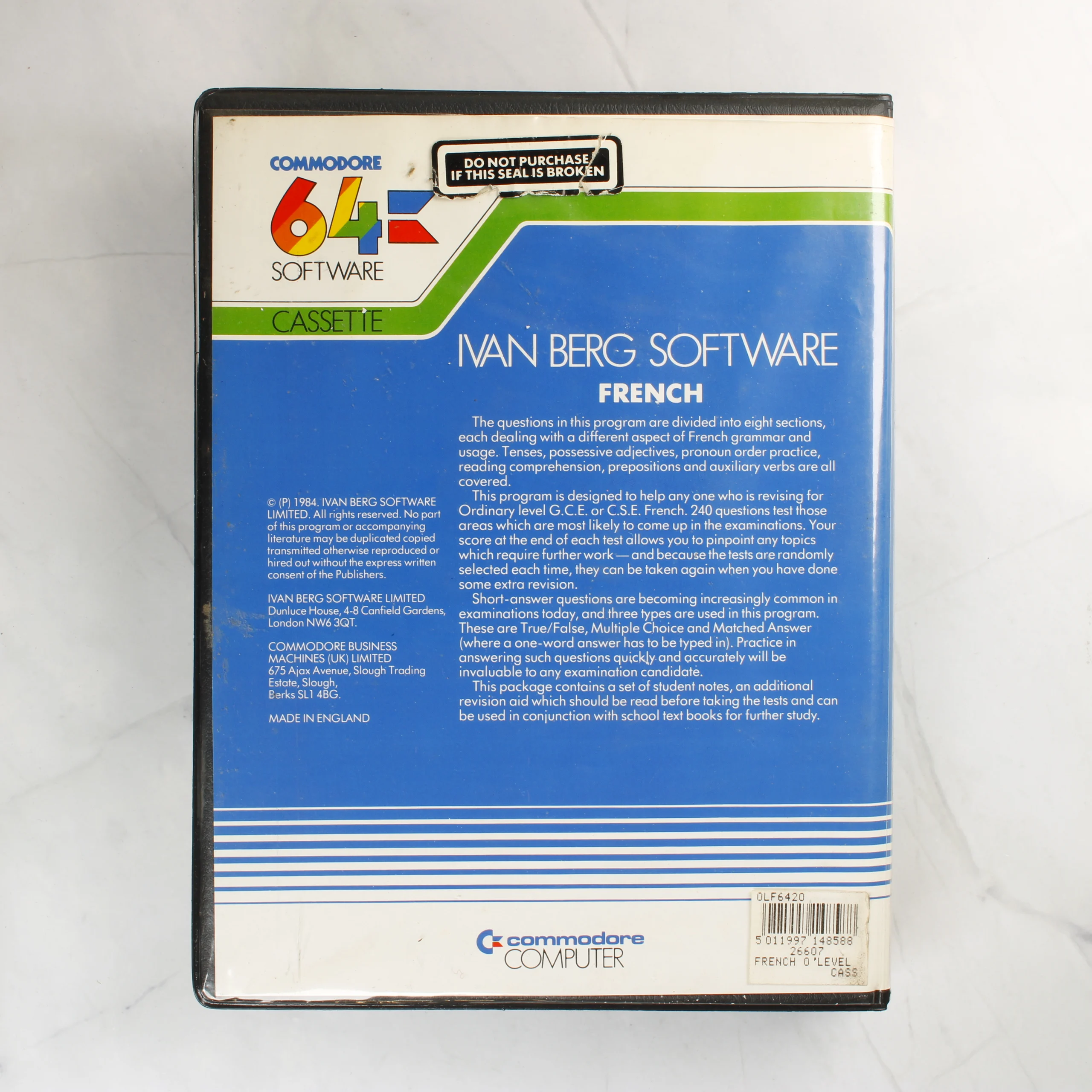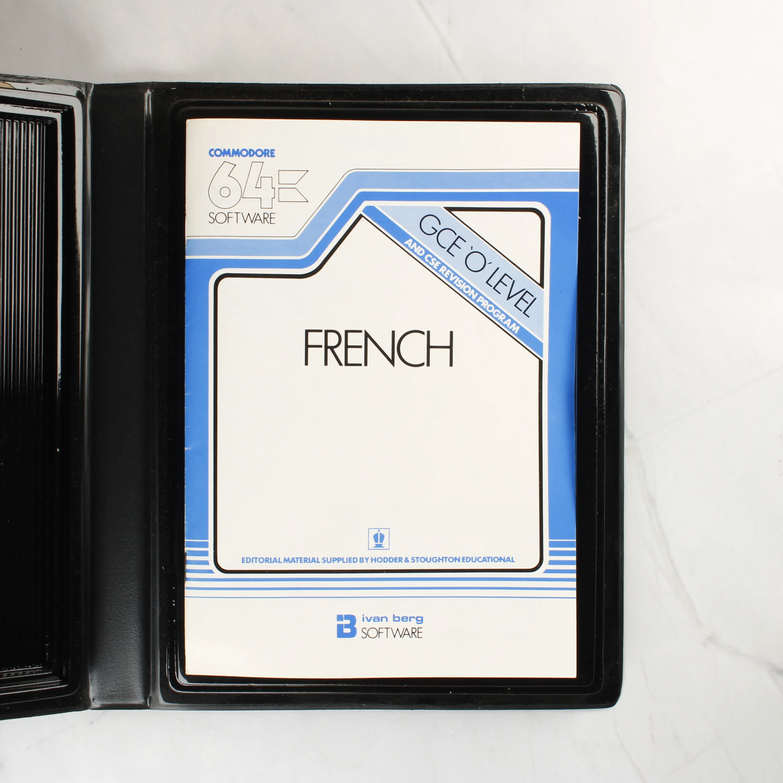 Ez a Commodore 64 platformra készült oktatószoftver az Ivan Berg Software gondozásában jelent meg 1984-ben. A csomag a GCE O-Level francia nyelvvizsgára való felkészülést segíti. A készlet egy nagyméretű, fekete műanyag tokban található, amely két fehér színű magnókazettát és egy nyomtatott használati útmutatót tartalmaz. Az egyik kazetta az operációs szoftvert, a másik az adatokat tartalmazza. A borítón kék, fehér és zöld színek dominálnak, a 'FRENCH' feliratot egy piros kör emeli ki. A tok hátoldalán részletes angol nyelvű leírás olvasható a program felépítéséről és a gyártói adatokról. A termék Angliában készült.