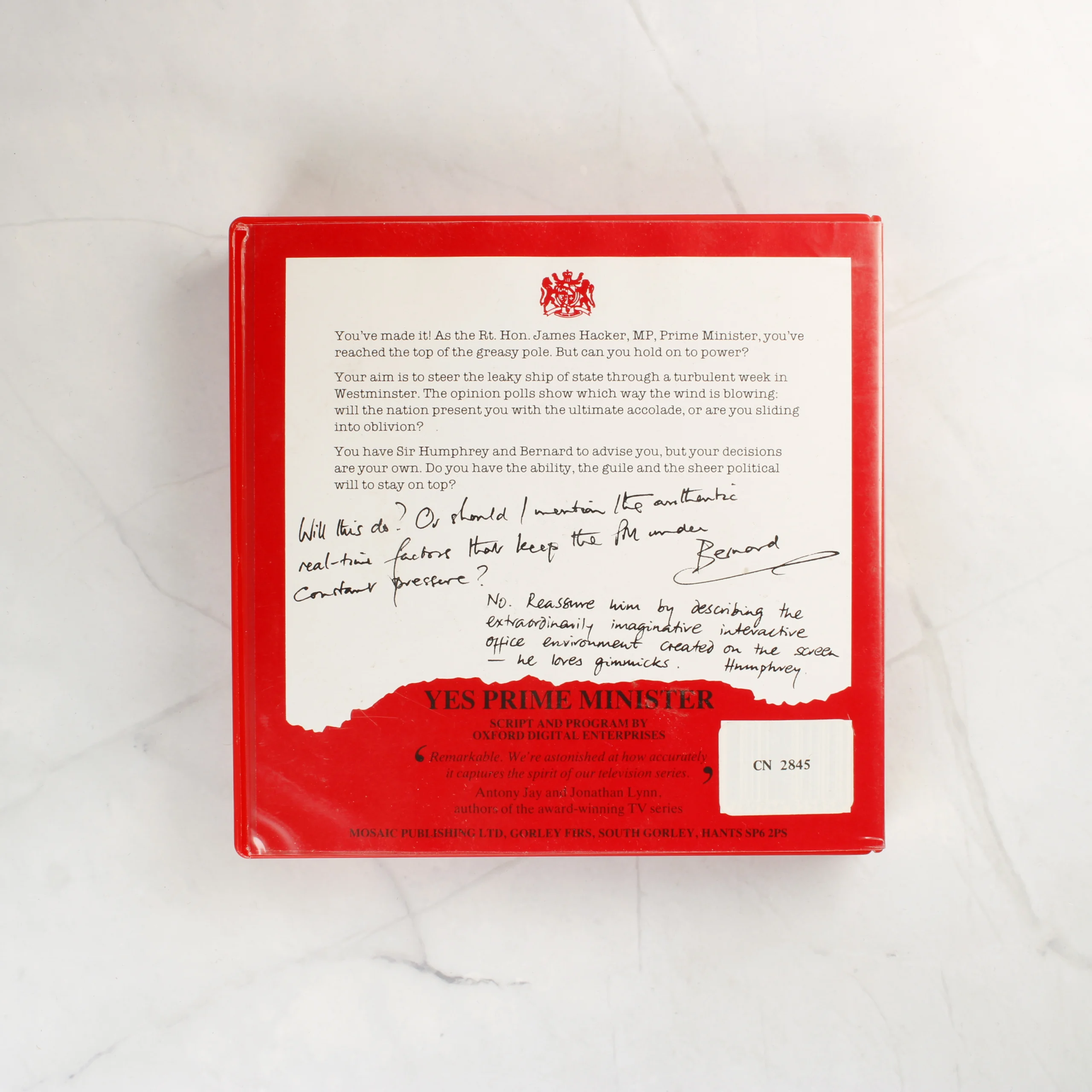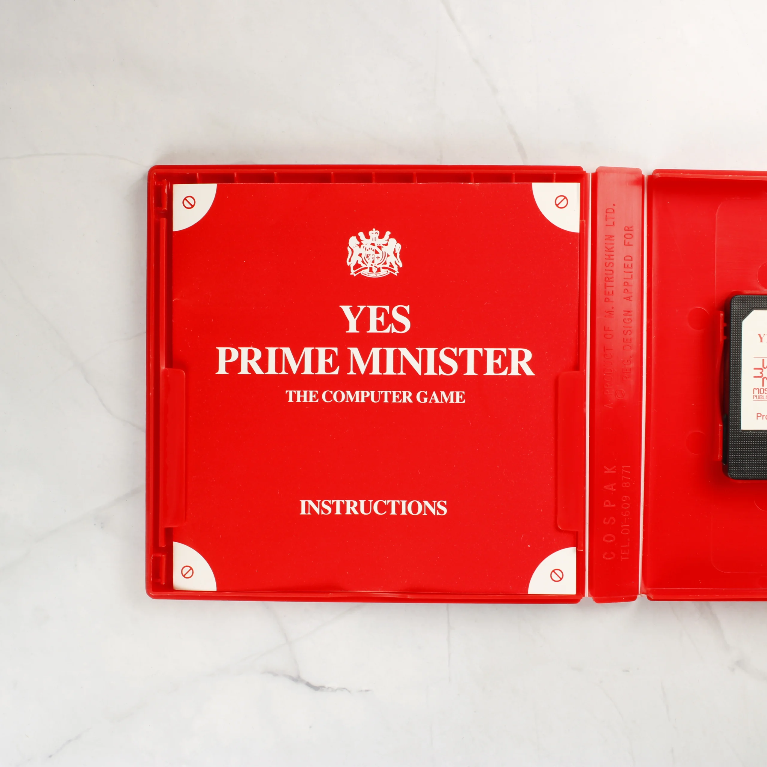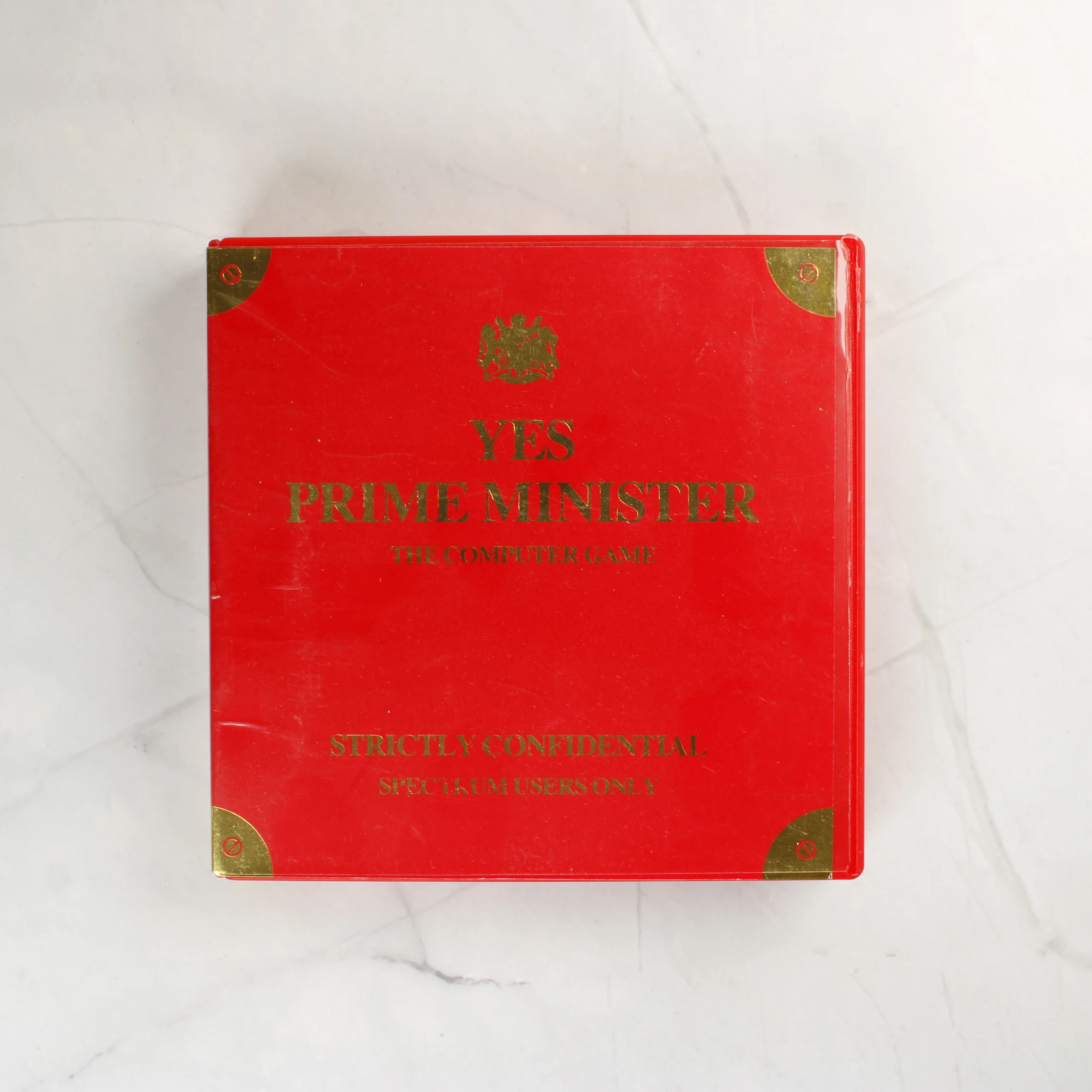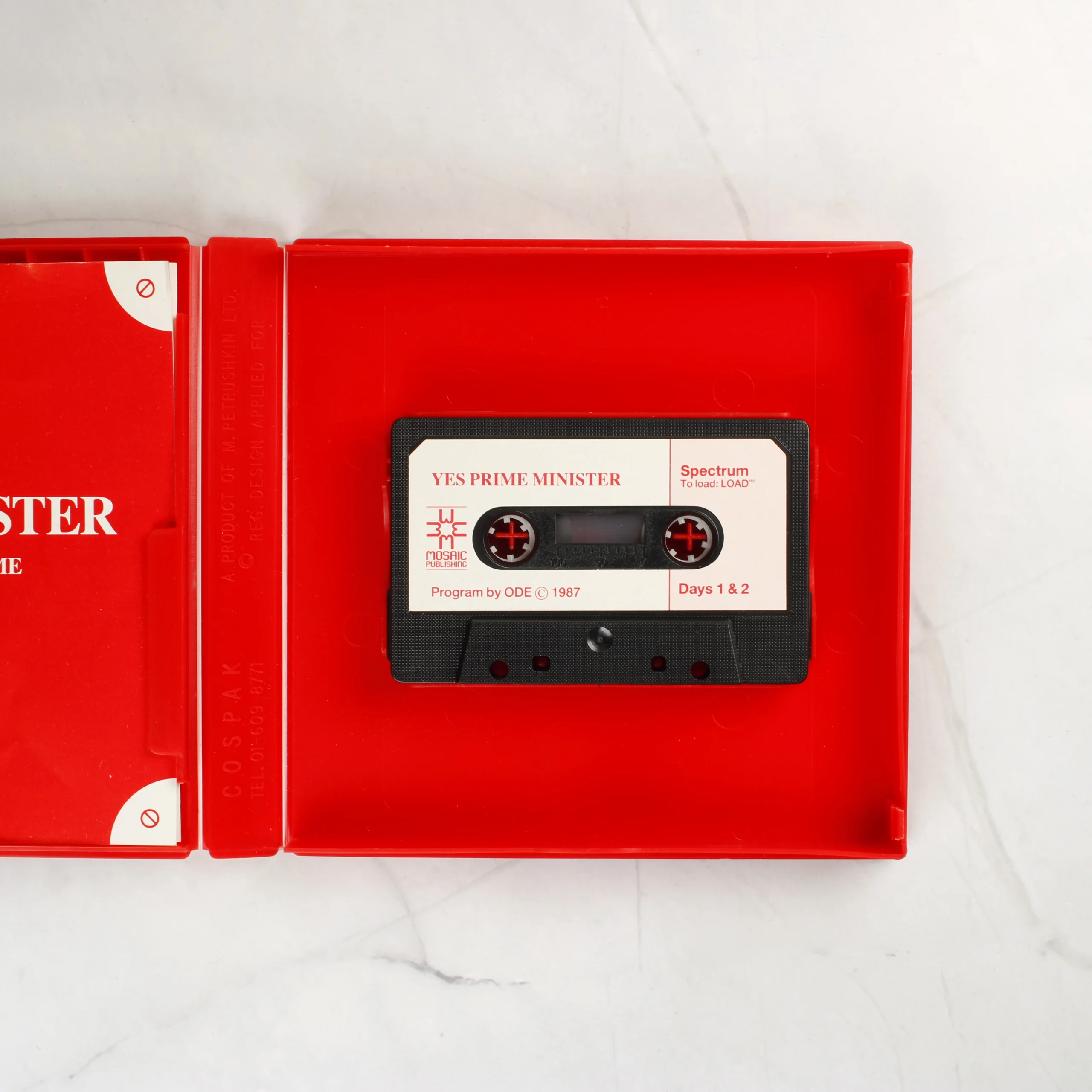 A Yes Prime Minister: The Computer Game című videójáték ZX Spectrum platformra készült kiadása. A csomag egy élénkvörös, műanyagból készült, szétnyitható tokban található, amelynek elején aranyozott feliratok és díszítőelemek láthatók. A készlet tartalmazza az eredeti fekete magnókazettát, amelyen fehér alapon piros és fekete feliratok olvashatók, valamint a piros borítójú használati útmutatót. A tok hátoldalán fehér információs blokk található a játék leírásával és fiktív kézzel írt jegyzetekkel. A termék a Mosaic Publishing gondozásában jelent meg 1987-ben. A fizikai hordozó és a dokumentáció a képek alapján megkímélt állapotban van, a műanyag tok felületén csak minimális használati nyomok és apró karcok észlelhetők.
