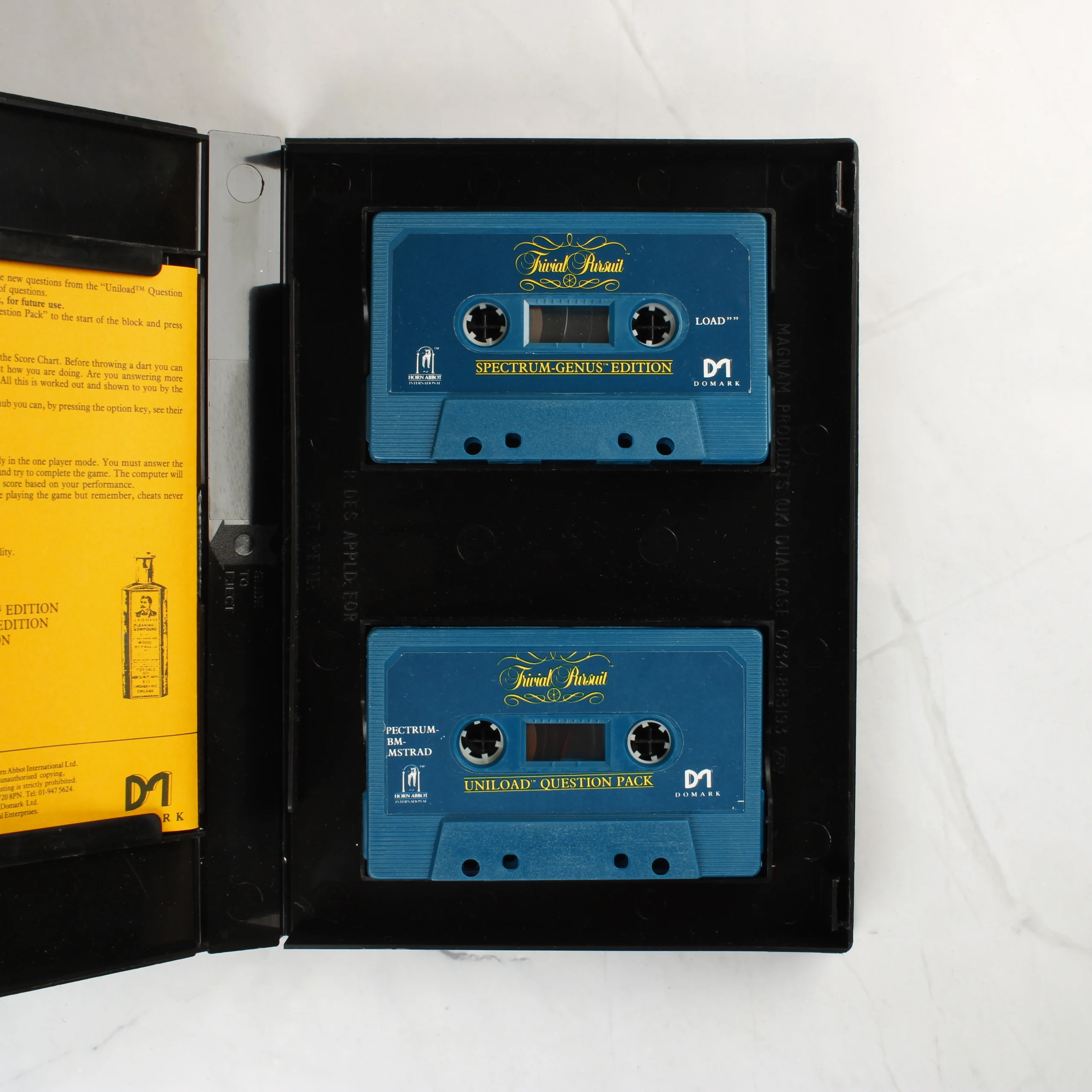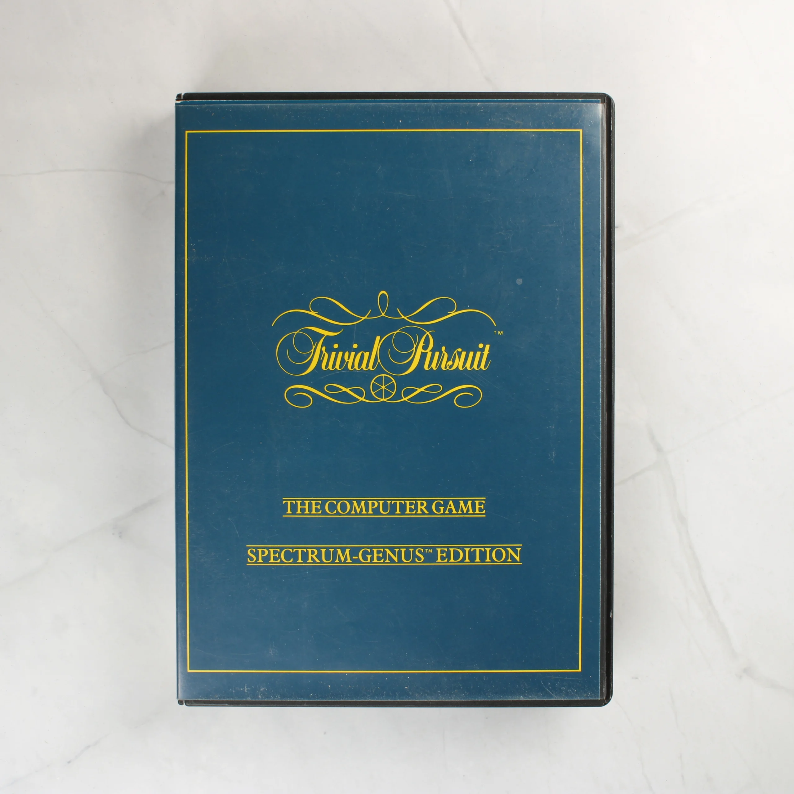 A Trivial Pursuit: The Computer Game Spectrum-Genus Edition videójáték ZX Spectrum 48K/128K számítógépekhez. A csomag egy fekete műanyag tokot tartalmaz, amelyben két kék színű kazetta található: az egyik a főprogramot, a másik az Uniload Question Pack kiegészítőt tartalmazza. A tok borítója sötétkék alapszínű, sárga feliratokkal és díszítőelemekkel. A belső oldalon egy sárga papír alapú használati útmutató vagy ismertető látható. A kazettákon a Horn Abbot és a Domark logói szerepelnek. A tok és a kazetták felületein enyhe használati nyomok és apró karcolások láthatók, de az összkép megkímélt állapotot tükröz.
