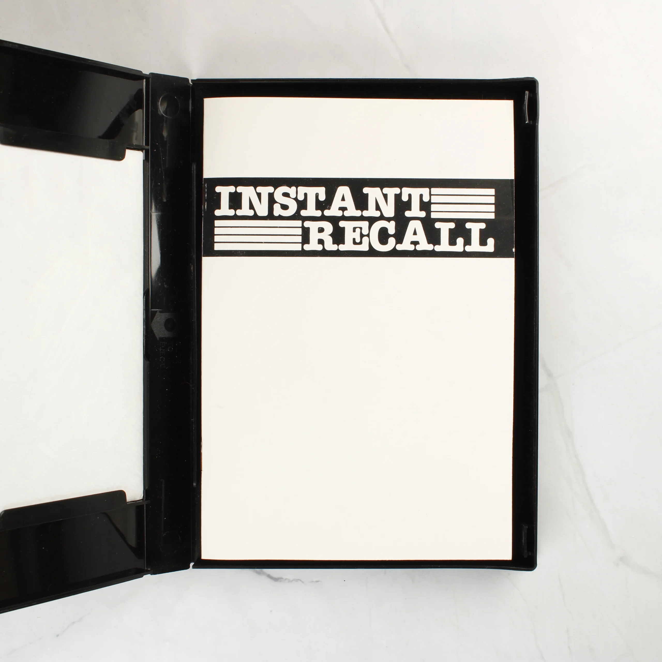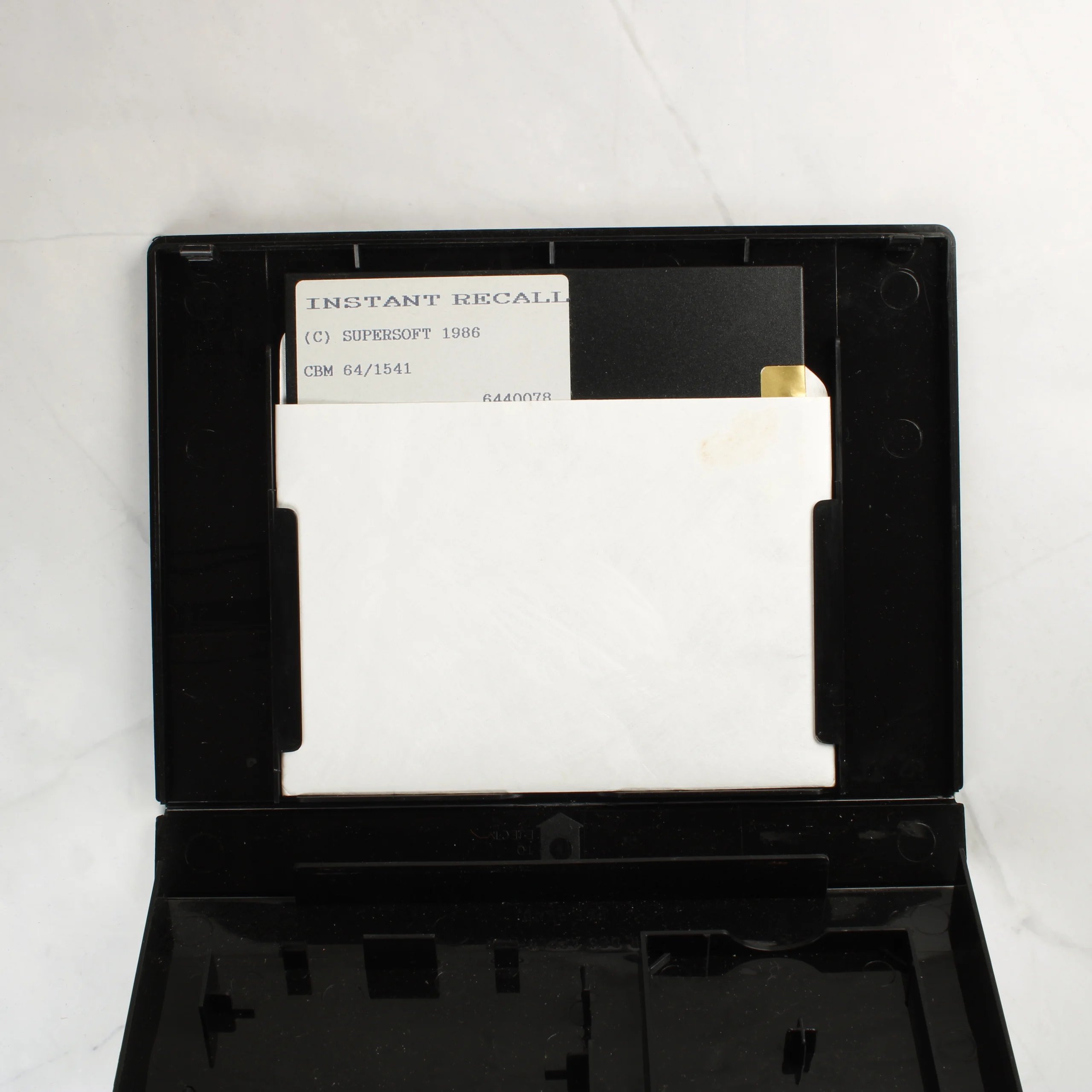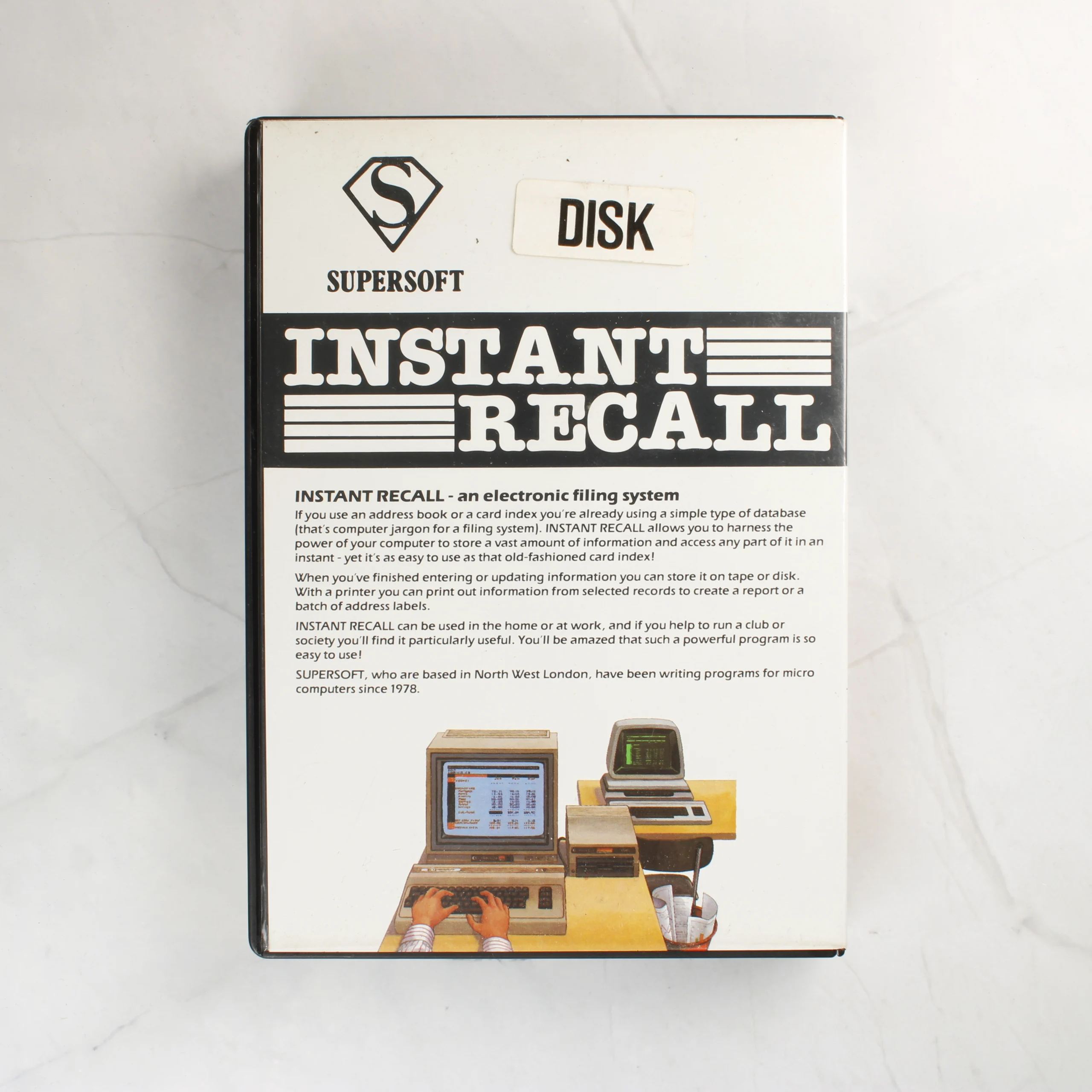 A Supersoft által kiadott Instant Recall egy elektronikus adatnyilvántartó szoftver Commodore 64 számítógéphez. A csomag egy fekete műanyag tokban található, amely tartalmazza az 5,25 colos floppy lemezt papírtokban, valamint a hozzá tartozó használati útmutatót. A borítón egy iratszekrényt ábrázoló illusztráció látható növénnyel és tűzőgéppel, felette a szoftver címe olvasható fekete sávban. A hátoldalon a program funkcióinak leírása és egy korabeli számítógépes munkaállomás grafikája szerepel. A floppy lemez címkéjén a szoftver neve, a kiadó és az 1986-os évszám látható.
