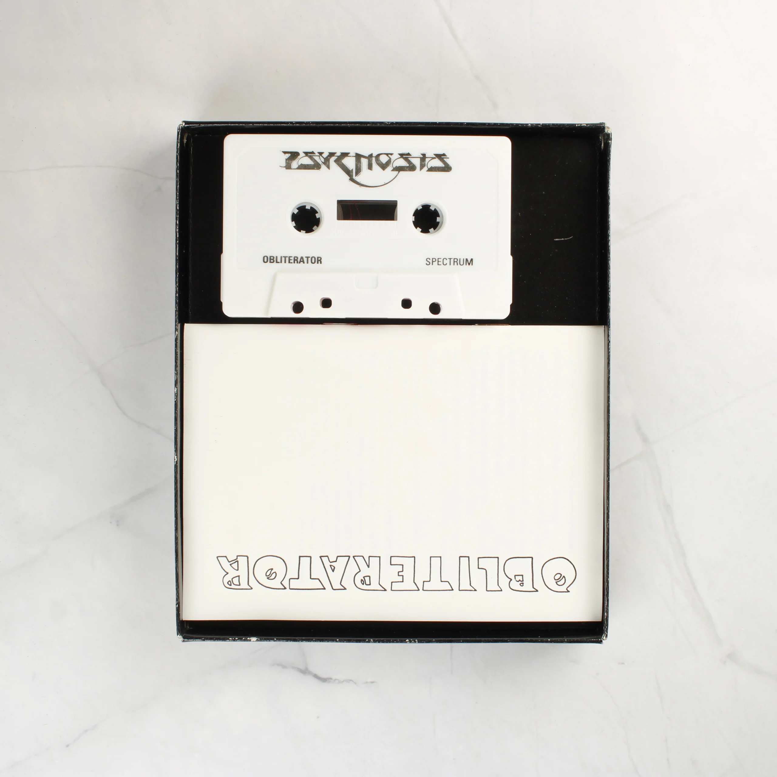 Az Obliterator egy klasszikus videójáték ZX Spectrum platformra, amelyet a Psygnosis fejlesztett és a Melbourne House adott ki. A termék egy nagyméretű, fekete kartondobozban érkezik, amelynek előlapján egy részletgazdag, sci-fi stílusú illusztráció látható egy kék tónusú idegen lényről. A doboz hátoldalán három különböző verzióból (C64, Spectrum, Amstrad) származó játékmenet-pillanatkép és a történet leírása olvasható. A csomag tartalmazza az eredeti fehér színű kazettát, amelyen fekete feliratok és a Psygnosis logója látható, valamint egy fehér borítójú kézikönyvet vagy mellékletet. A doboz sarkain és élein enyhe kopásnyomok fedezhetők fel, de a grafika és a szövegek jól olvashatók maradnak. A kazetta tiszta, fizikai sérülés nem látható rajta.