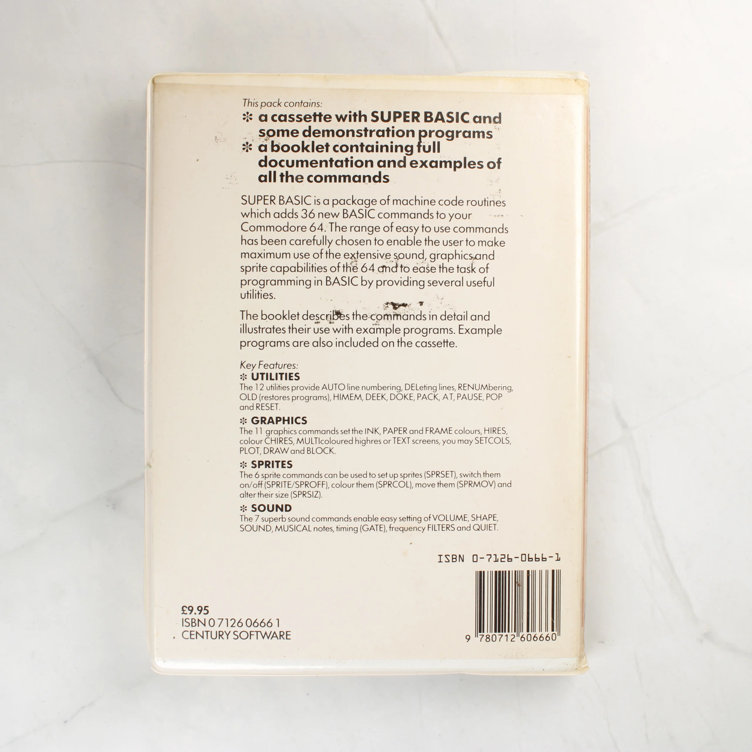A Century Software által kiadott Super Basic szoftvercsomag Commodore 64 számítógéphez. A termék egy fehér műanyag tokban található, amely tartalmaz egy mágnesszalagos kazettát és egy fekete-fehér nyomtatású használati útmutatót. A borítón piros és fehér alapszínek láthatók, rajta egy Commodore 64 billentyűzetének részletével. A csomag 36 extra BASIC parancsot kínál a programozás megkönnyítésére, érintve a grafika, hang és sprite kezelés területeit. A tok hátoldalán részletes leírás olvasható a funkciókról és a csomag tartalmáról. A kazetta világosszürke színű, piros felirattal. A kiadvány Peter Lupton és Frazer Robinson munkája.