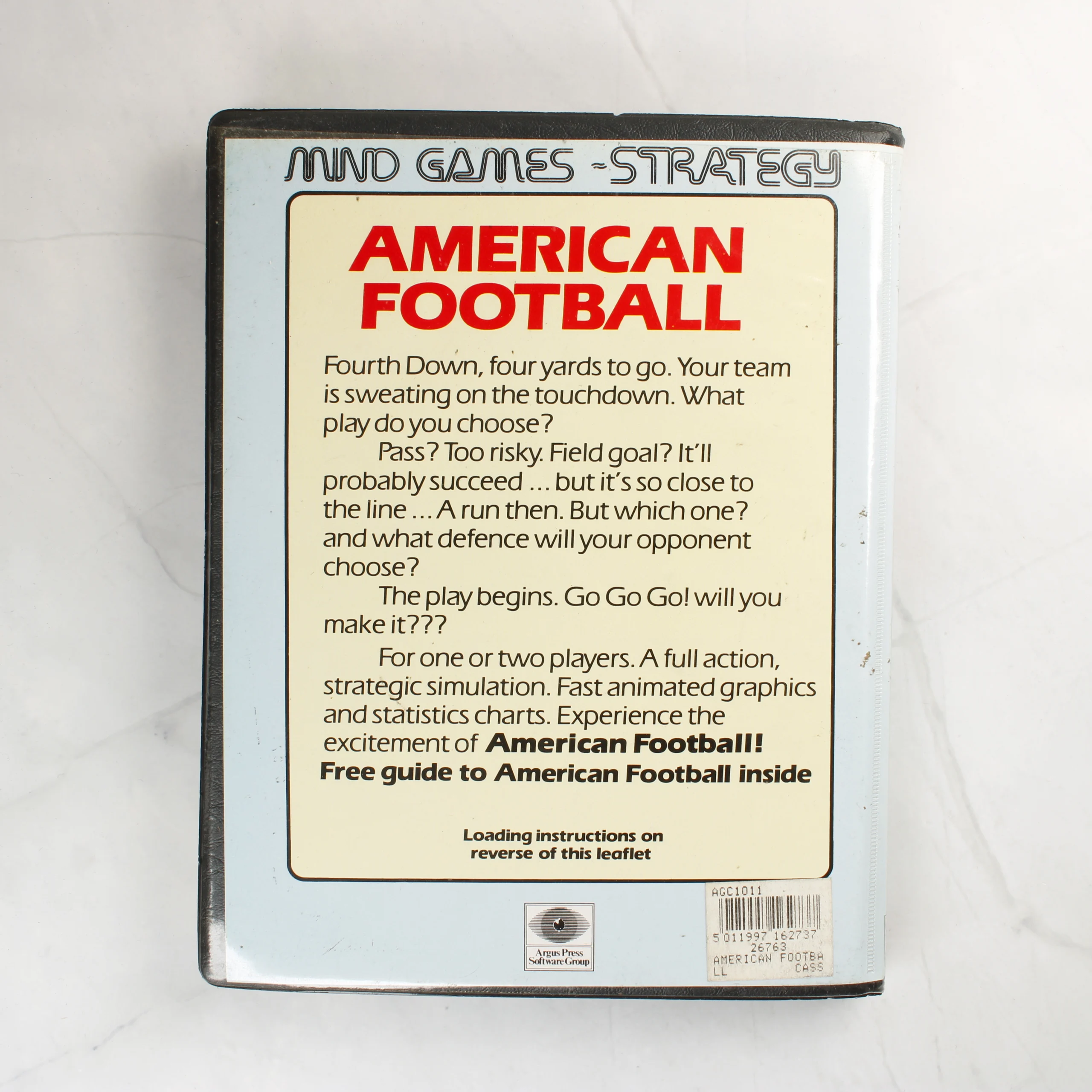 A Mind Games által kiadott American Football videójáték Commodore 64 platformra. A csomag egy fekete, műanyagból készült, könyvszerűen nyíló tokot tartalmaz, amelyben egy fehér színű adathordozó kazetta és egy fekete-fehér illusztrációkkal ellátott használati útmutató található. A borítón színes grafika látható, amely amerikai futballjátékosokat ábrázol akció közben. A tok elején egy régi árcímke maradványa látható. A hátoldalon a játék leírása és a betöltési útmutató olvasható angol nyelven. A kazetta címkéje tiszta, kék felirattal és a kiadó logójával ellátott. A belső műanyag tálca ép, stabilan tartja a kazettát. A termék az Argus Press Software Group gondozásában jelent meg 1984-ben.