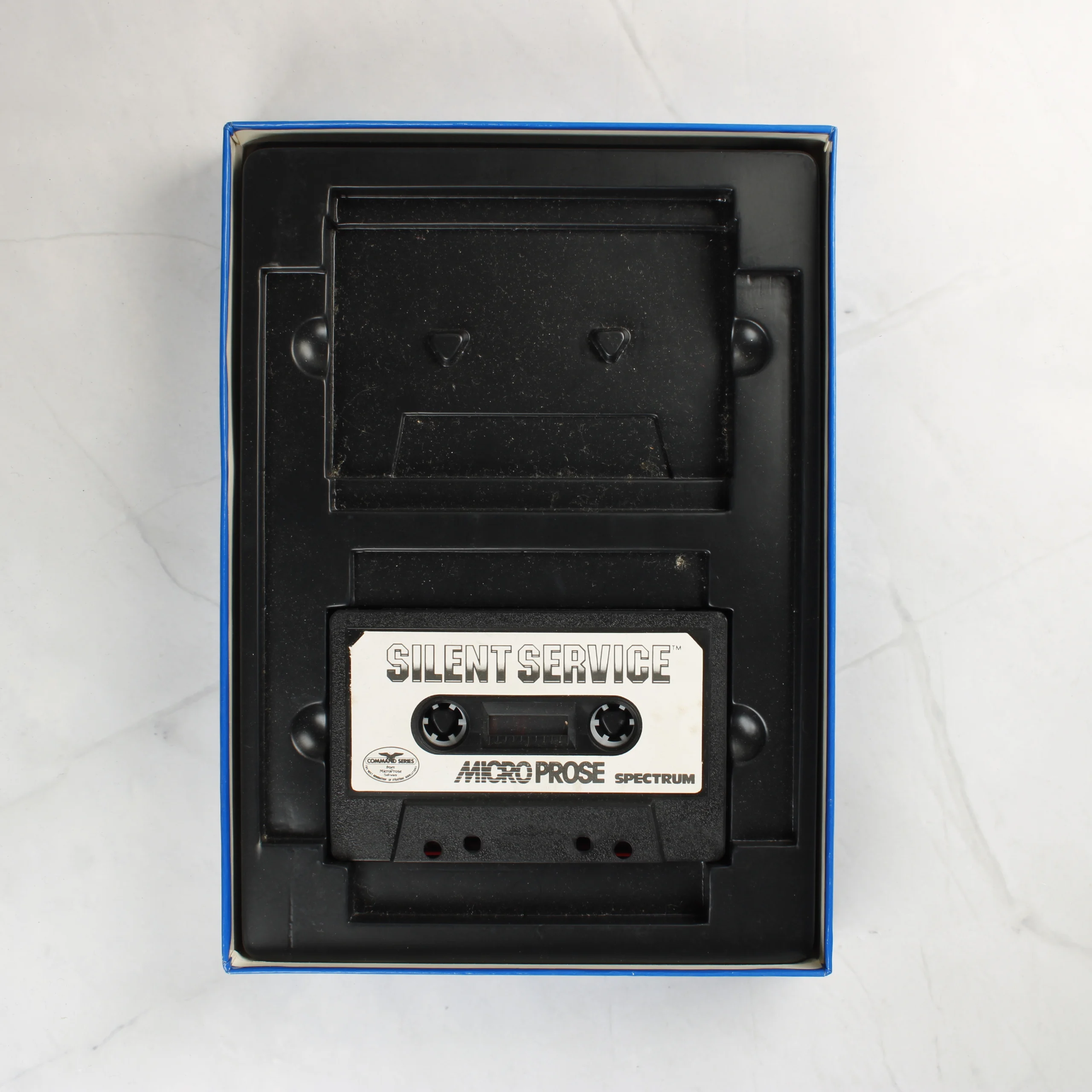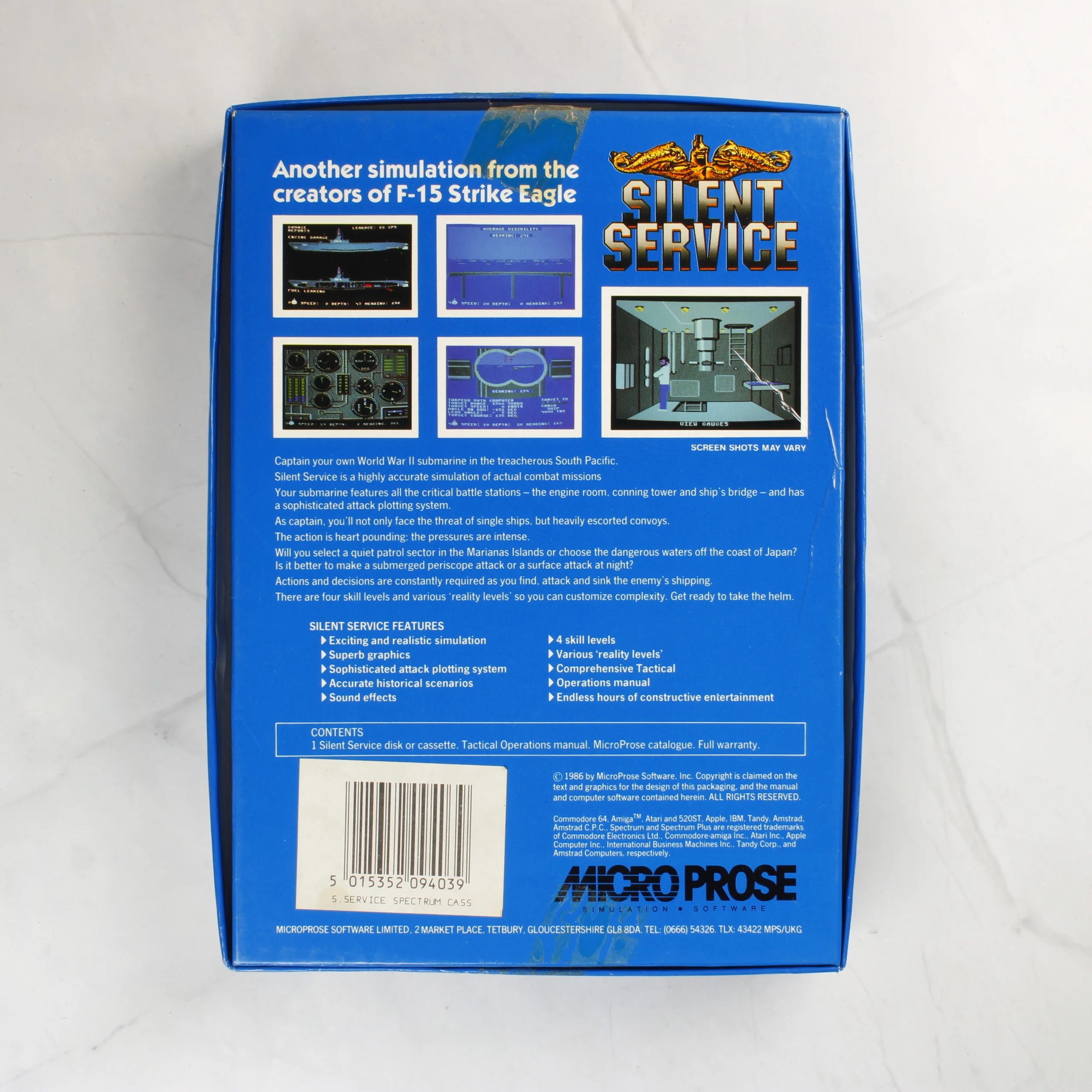 A Silent Service című tengeralattjáró-szimulátor videójáték ZX Spectrum platformra készült kiadása. A csomag tartalmazza az eredeti kék színű kartondobozt, amelyen a MicroProse logója és egy tengeralattjárót ábrázoló illusztráció látható. A dobozban egy fekete műanyag tálca található, amelyben egy darab mágnesszalagos kazetta helyezkedik el fehér címkével. A készlet része továbbá egy 'Tactical Operations Manual' feliratú, fehér borítós használati útmutató is. A doboz elején egy aranyszínű matrica jelzi a Spectrum 48/128k kompatibilitást. A hátoldalon angol nyelvű leírás és képernyőmentések láthatóak a játékmenetből.