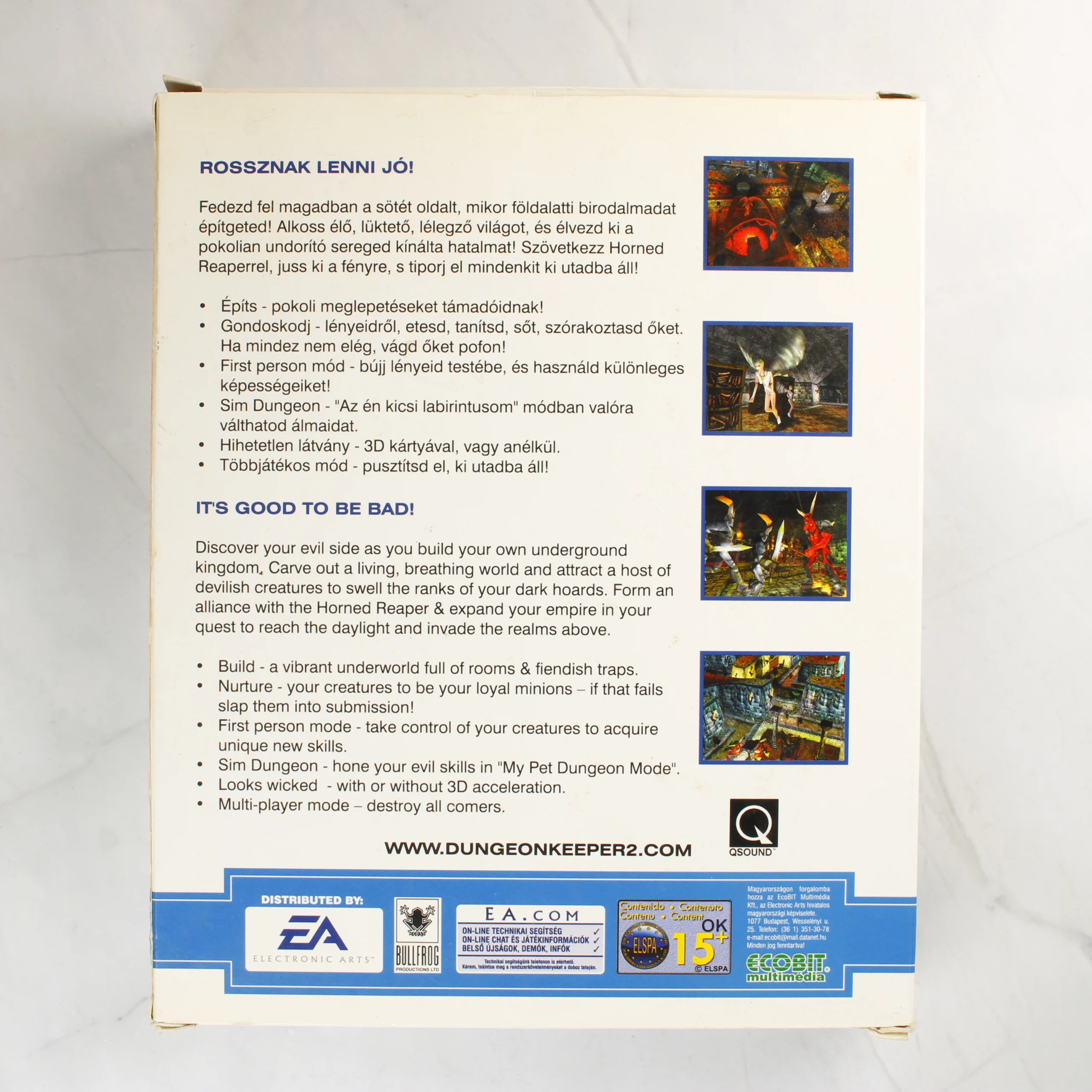 A Dungeon Keeper 2 videójáték PC-re kiadott Classics változata, eredeti kartondobozos csomagolásban. A fehér alapszínű doboz elején a játék logója és két központi karaktere látható, a bal felső sarokban magyar nyelvű kézikönyvre utaló jelzéssel. A hátoldalon magyar és angol nyelvű leírás, valamint játékmenet-pillanatképek szerepelnek. A csomag tartalmazza a két darab telepítőlemezt (Disc 1 és Disc 2) átlátszó műanyag tasakokban, valamint több darab fekete-fehér és színes nyomású felhasználói kézikönyvet. A kiadvány az Electronic Arts és a Bullfrog Productions gondozásában jelent meg, az Ecobit Multimedia magyarországi forgalmazásában.