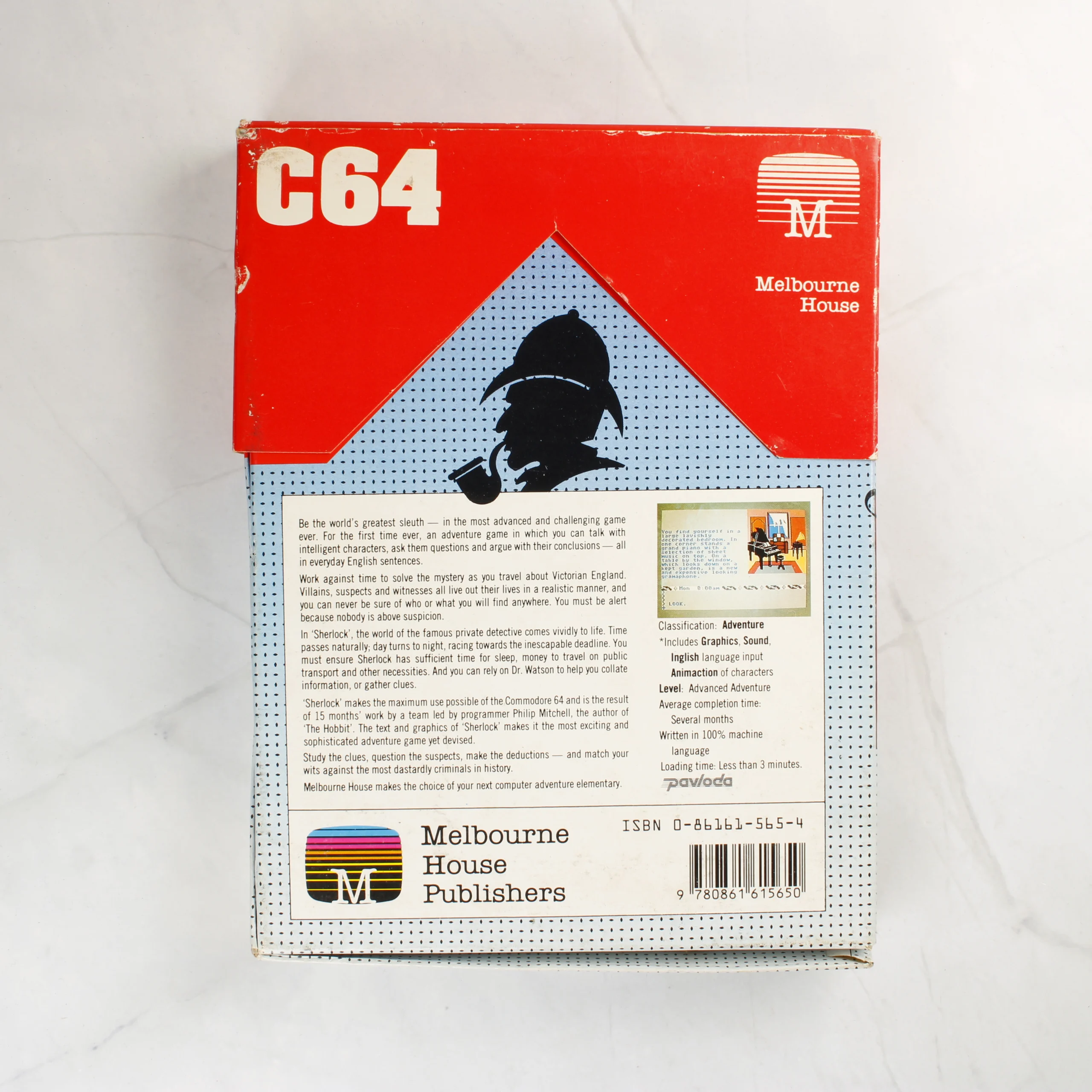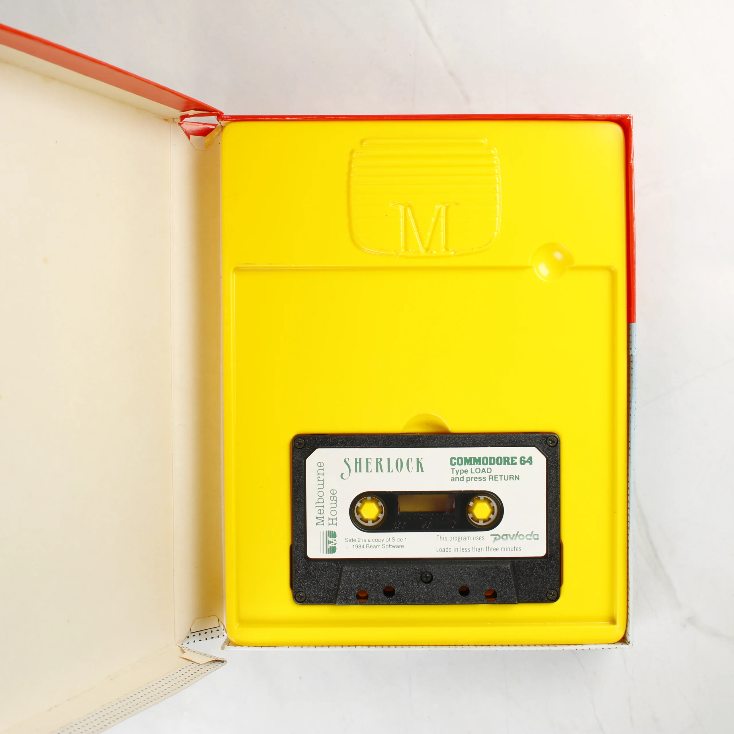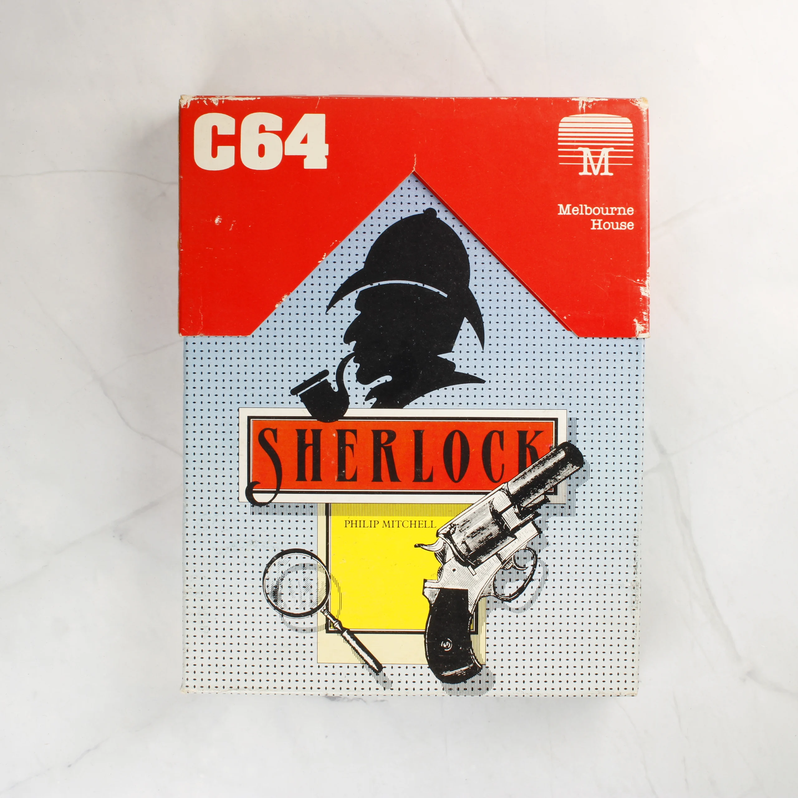 A Melbourne House által kiadott Sherlock című videójáték Commodore 64 platformra. A csomagolás egy piros és kék mintás kartondoboz, amelyen Sherlock Holmes sziluettje, egy nagyító és egy revolver látható. A doboz belsejében egy sárga műanyag tálca található, amelyben egy fekete színű magnetofonkazetta helyezkedik el. A kazetta címkéje fehér, zöld és fekete feliratokkal ellátott. A doboz hátoldalán angol nyelvű leírás, egy képernyőkép és a technikai adatok olvashatók. A termékhez tartozik egy illusztrált használati útmutató is, amelynek borítója megegyezik a külső doboz grafikájával.