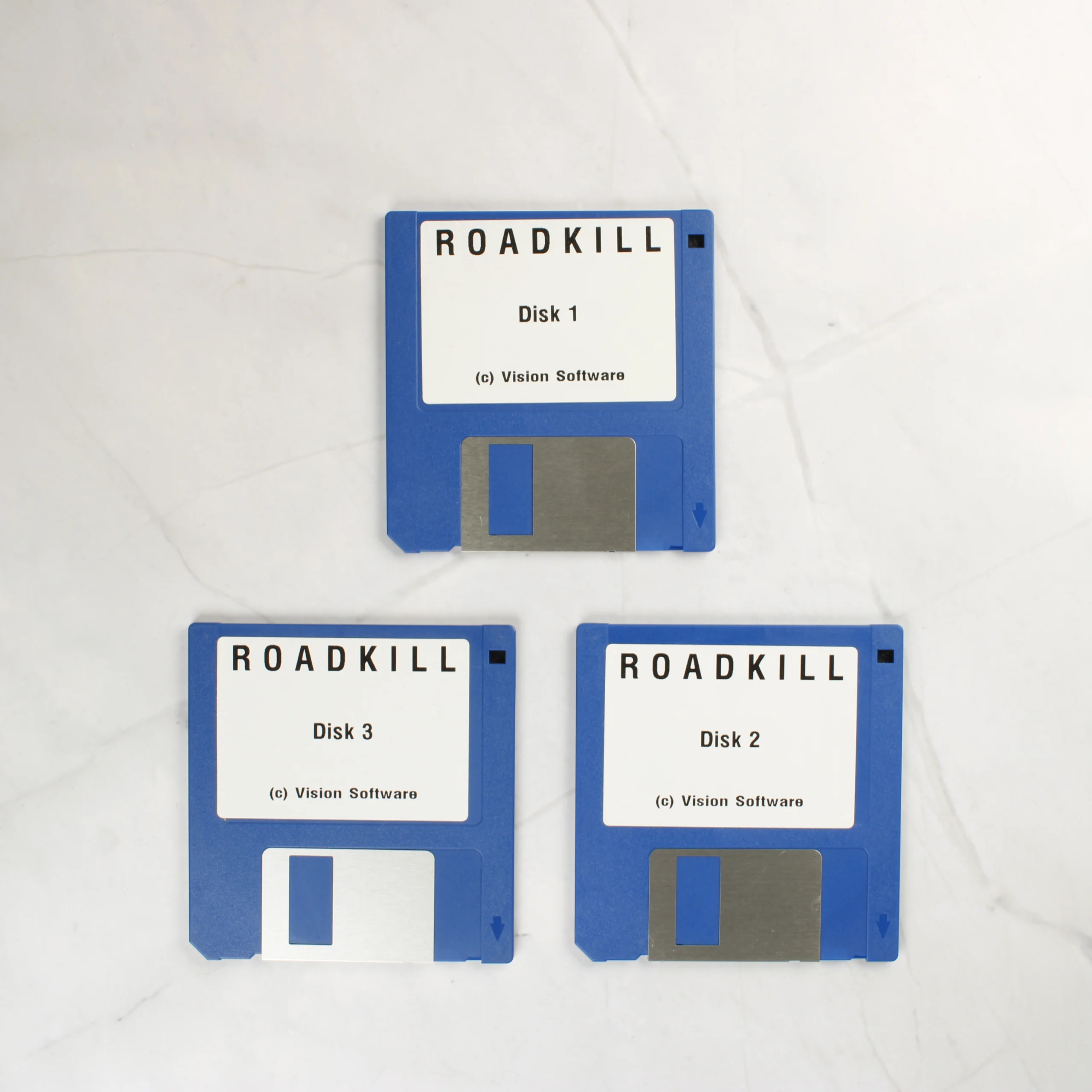 A Roadkill című videójáték Amiga 1200-as verziója, eredeti kartondobozos kiadásban. A csomag három darab kék színű, 3,5 colos floppy lemezt tartalmaz, amelyeken fehér címke látható a játék címével és a lemez sorszámával. A doboz előlapján egy lángnyelvekkel díszített versenyautó és rakéták láthatók robbanások közepette, valamint a Vision és az Acid Software logói. A hátoldalon angol nyelvű leírás és hat darab színes képernyőkép mutatja be a játékmenetet. A doboz élei mentén kopások és kisebb benyomódások tapasztalhatók, de a grafika jól kivehető és a színek élénkek.