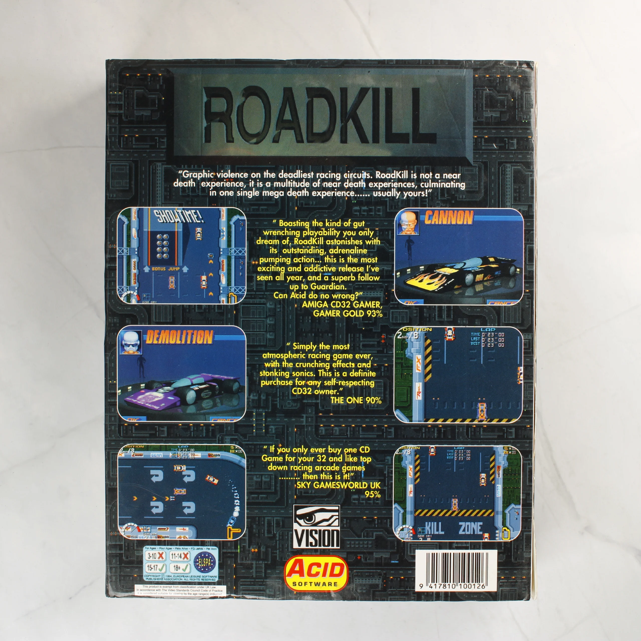 Roadkill, Amiga 1200, videójáték, retro, Vision, Acid Software, floppy lemez, versenyzős játék