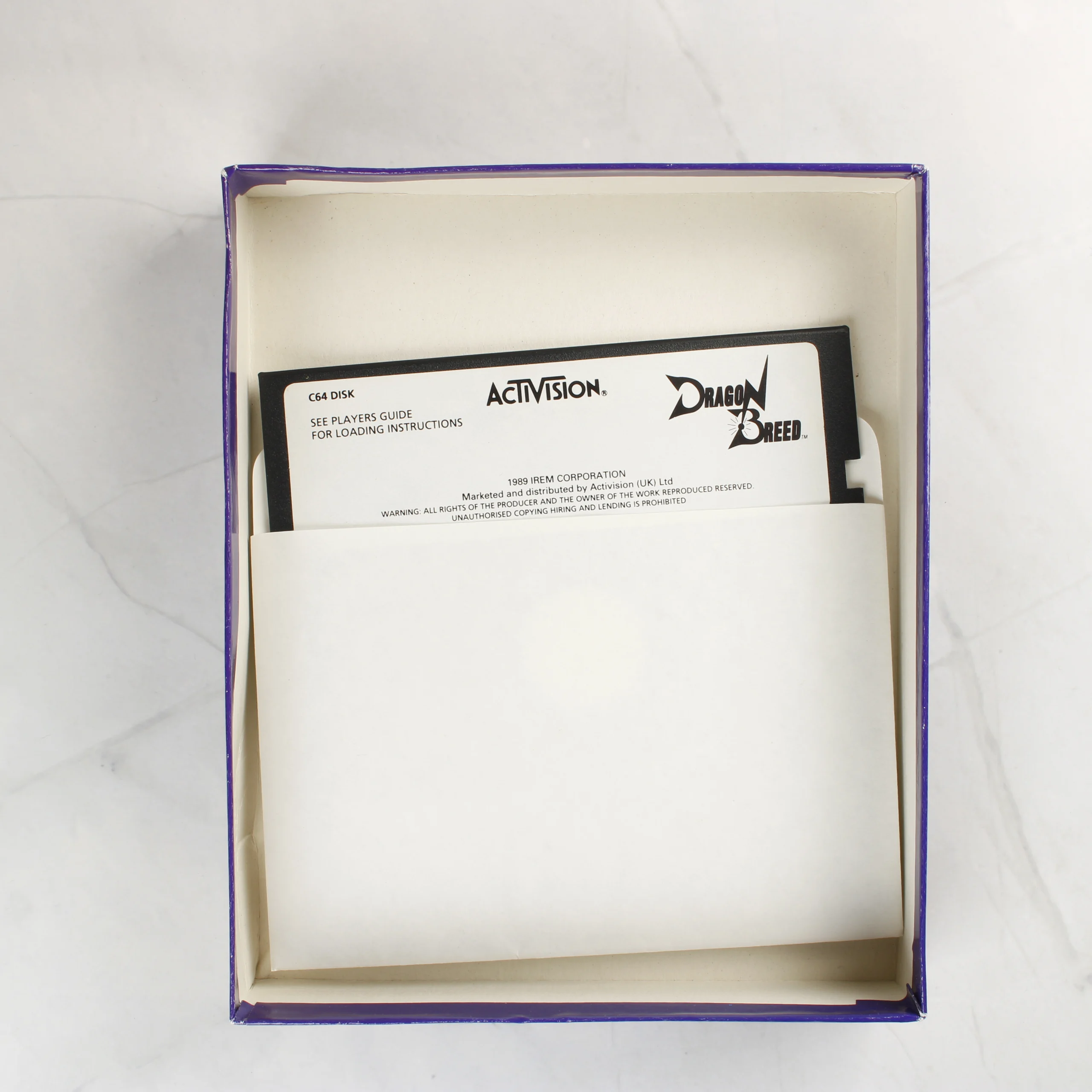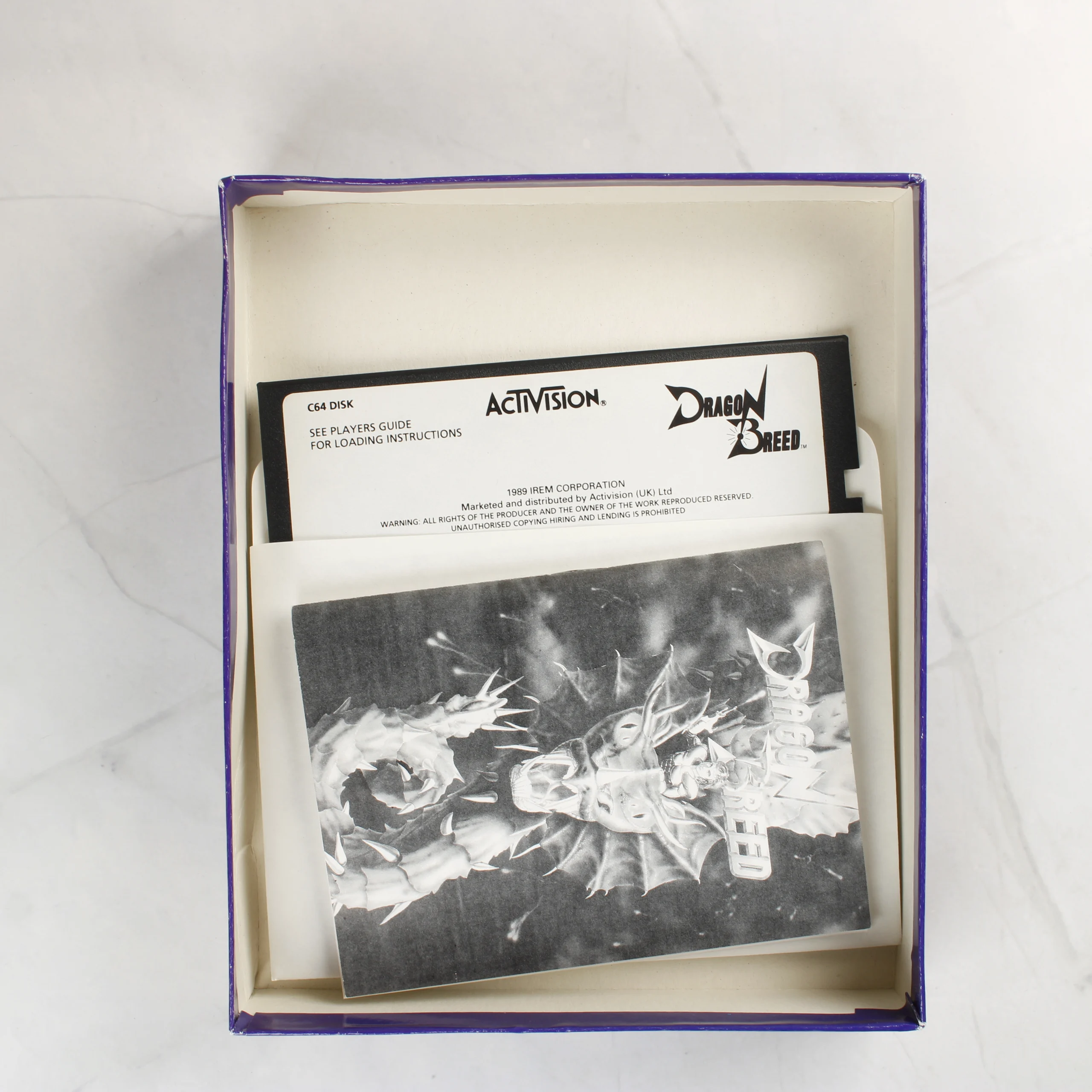 A Dragon Breed című videójáték Commodore 64 platformra készült kiadása eredeti kartondobozban. A csomag tartalmaz egy 5,25 colos floppy lemezt fehér papírtokban, valamint egy fekete-fehér illusztrációval ellátott használati útmutatót. A doboz elején színes grafika látható, amely egy sárkányon lovagló harcost ábrázol, az Activision logójával és a CBM 64 DISC felirattal. A hátoldalon a játék történetének leírása és képernyőmentések találhatók. A doboz élei mentén látható kopások és fehér foltok jelzik a használatot és az életkort. A floppy lemez címkéje tiszta, a feliratok jól olvashatóak. A belső papírtok és az útmutató enyhén sárgult, de ép állapotú.