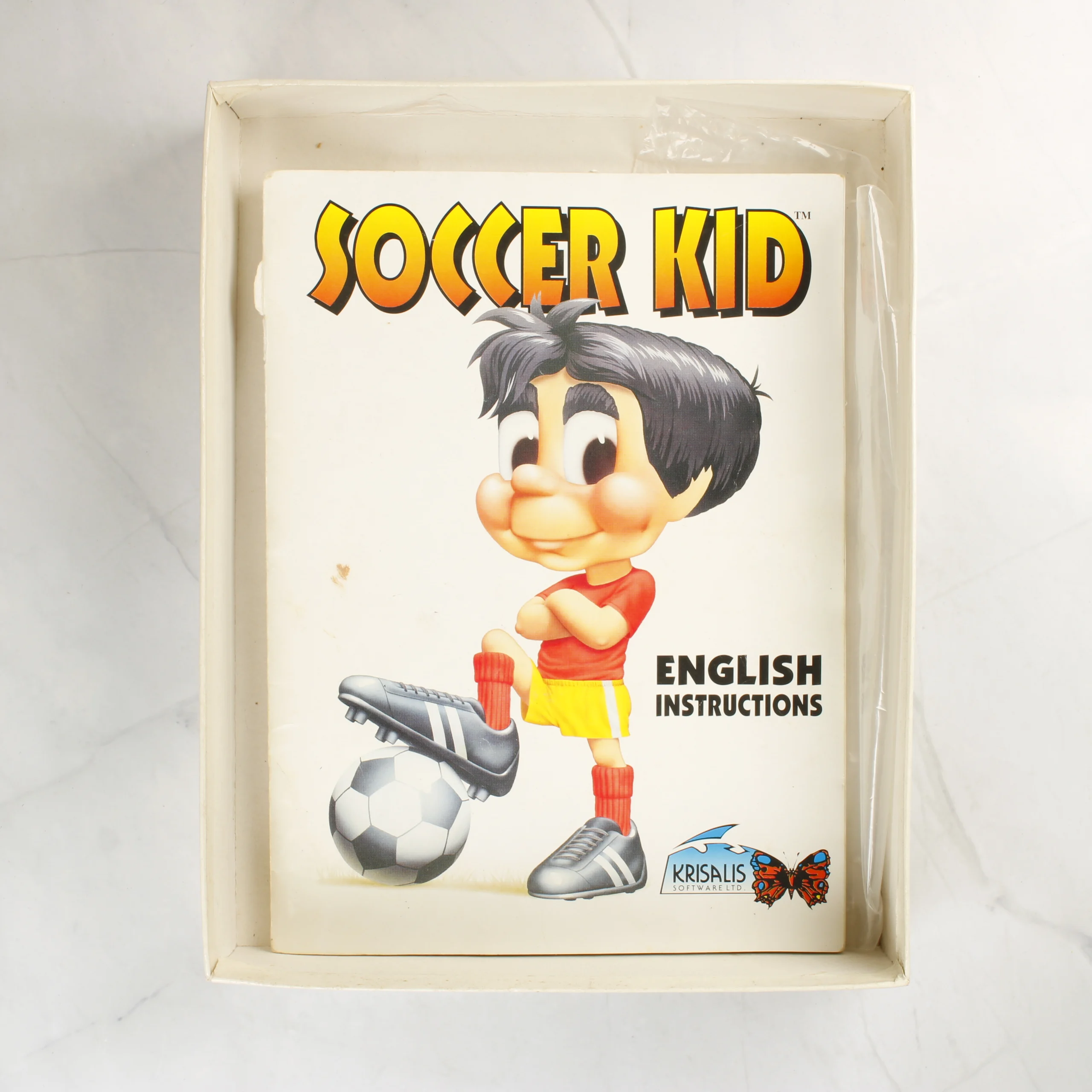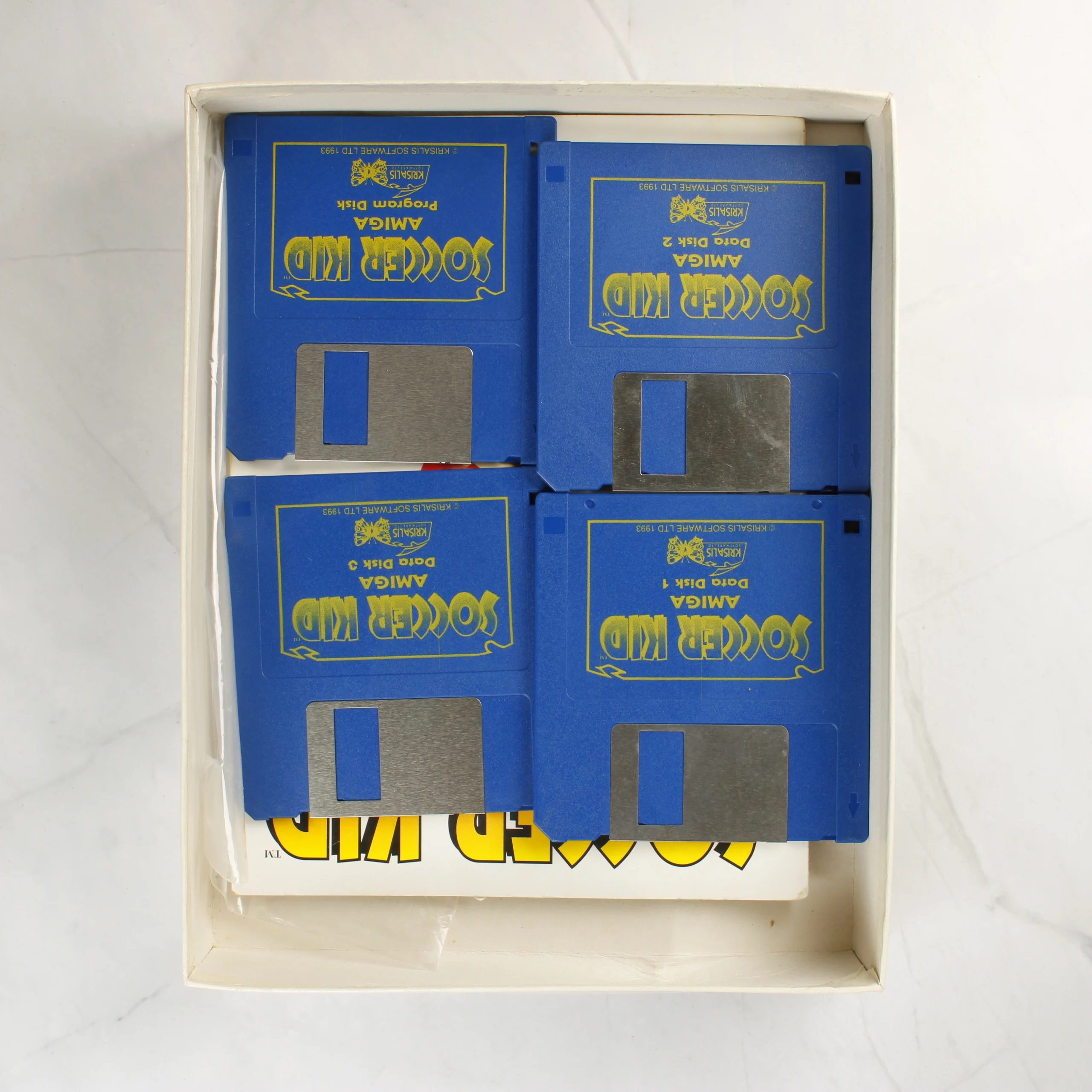 A Soccer Kid című videójáték Amiga platformra készült kiadása eredeti dobozában. A csomag tartalmazza a négy darab kék színű, 3,5 colos floppy lemezt, amelyek a programot és az adatokat tárolják. A lemezeken sárga feliratú Krisalis Software címkék láthatóak. A készlet része továbbá egy angol nyelvű használati útmutató is, amelynek borítóján a játék főhőse látható egy futballabdával. A külső kartondoboz fehér alapszínű, rajta a játék színes logója és a rendszerkövetelmények szerepelnek. A doboz és a kézikönyv felületén kisebb használati nyomok és elszíneződések figyelhetőek meg.