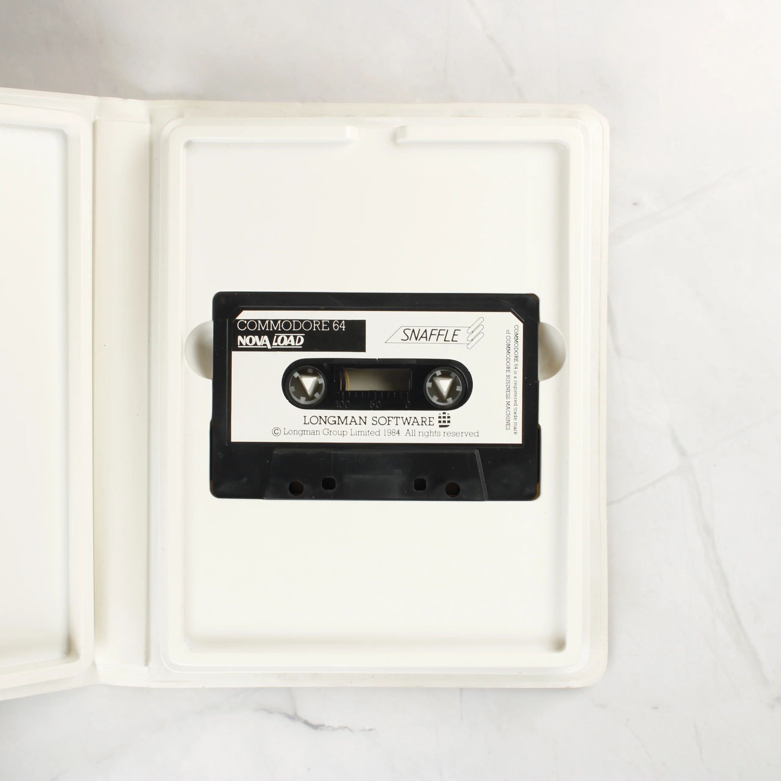 A Snaffle egy Commodore 64 platformra megjelent szókirakó videójáték, amelyet a Longman Software adott ki. A csomag egy fehér, műanyag tokot tartalmaz, amelyben egy fekete színű magnókazetta és egy fekete-fehér nyomtatott használati útmutató található. A tok előlapján színes illusztráció látható, amely egy betűkkel teli játékteret ábrázol zöld háttér előtt. A hátoldalon a játék leírása, a kiadó adatai és egy vonalkód szerepel. A kazetta címkéje fehér, rajta a játék címe és a kiadó logója olvasható. A termék fizikai állapota megkímélt, a műanyag tok és a papír alapú mellékletek épek, jelentősebb sérülés nem látható rajtuk.