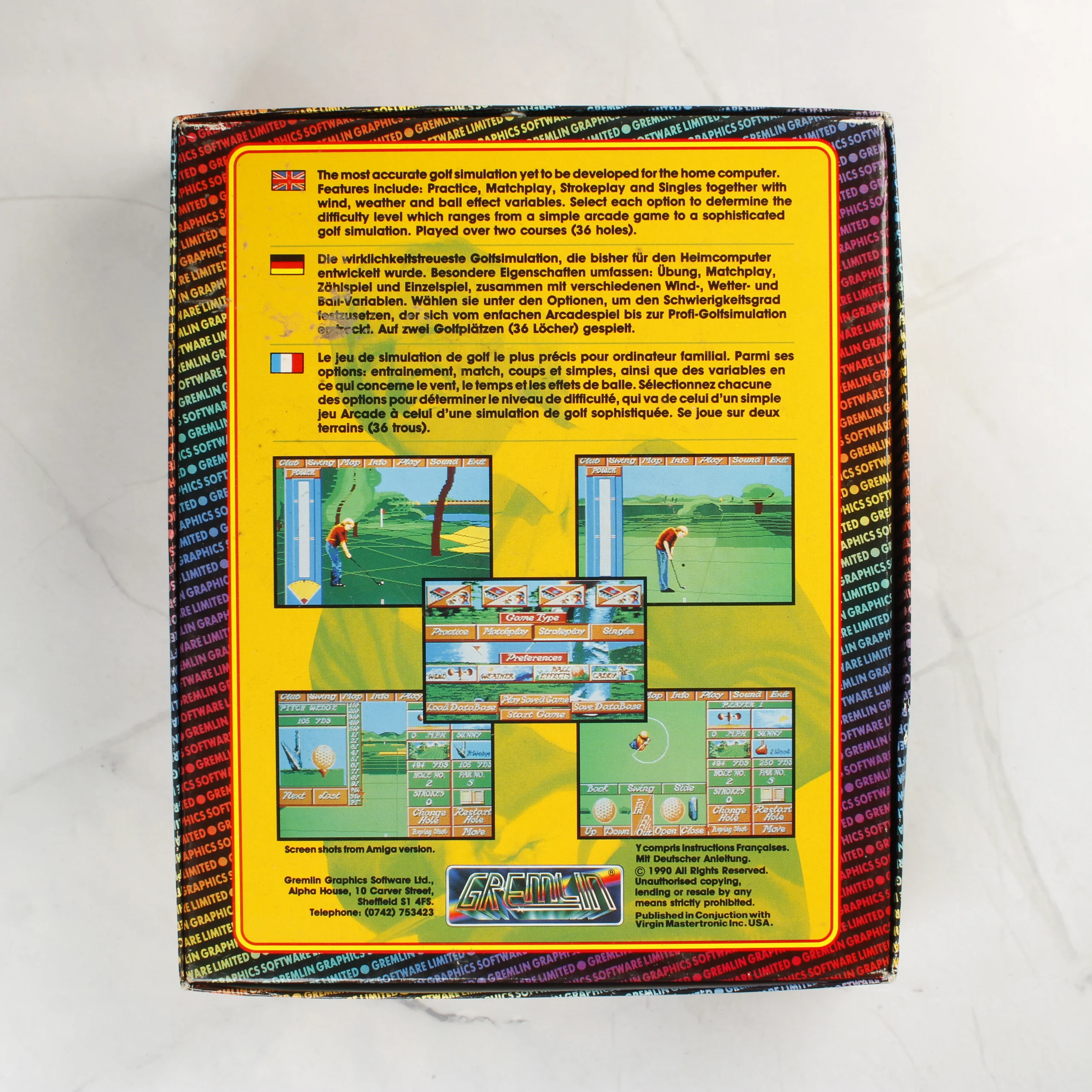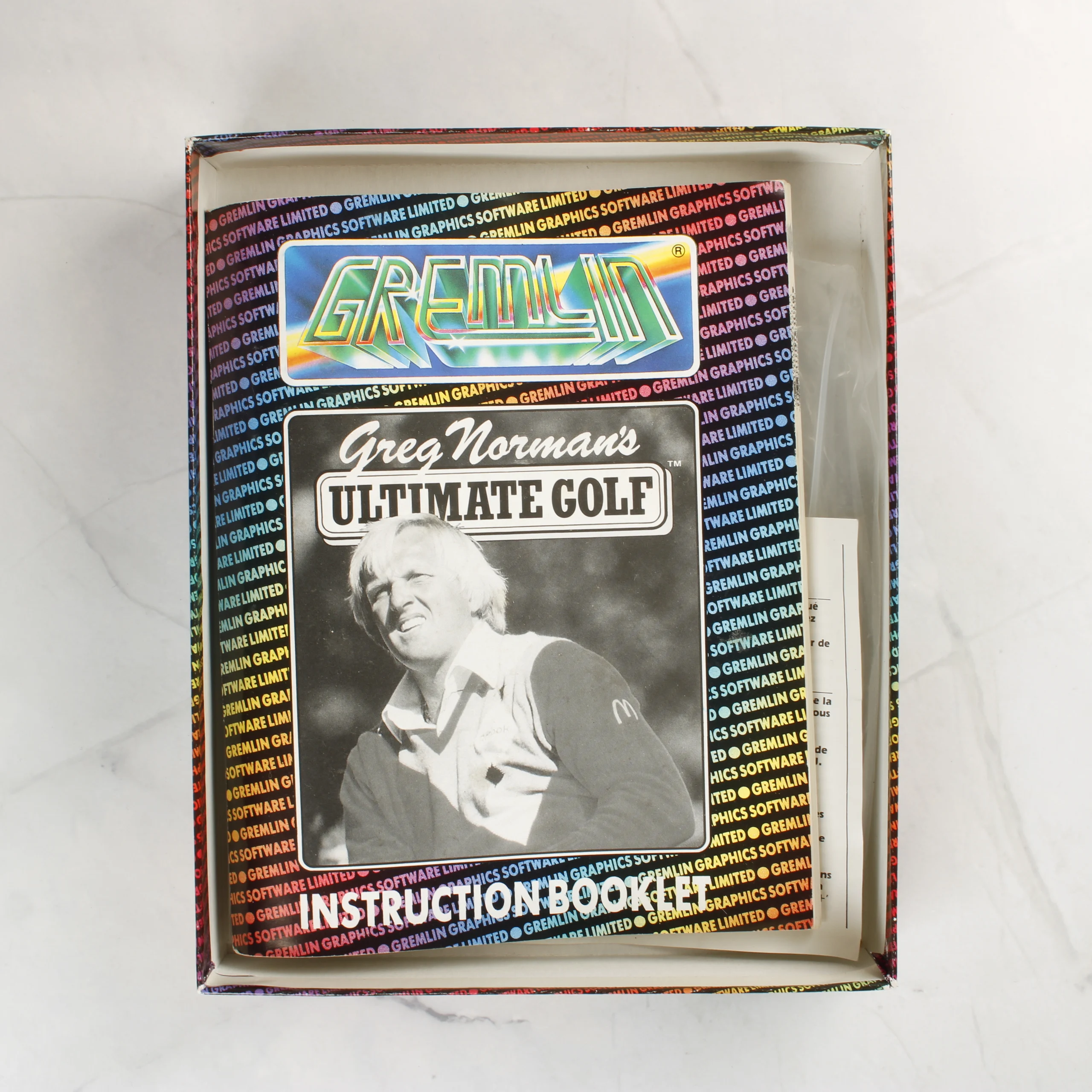 A Greg Norman's Ultimate Golf videójáték Atari ST platformra készült kiadása. A csomag tartalmazza az eredeti színes kartondobozt, amelyen a híres golfozó látható akció közben. A doboz belsejében egy kék színű, 3,5 colos floppy lemez található, amelyen a Gremlin Graphics logója és a játék címe szerepel. Mellékelve van továbbá egy fekete-fehér borítójú használati útmutató füzet és egy többnyelvű betétlap is. A doboz hátoldalán angol, német és francia nyelvű leírás olvasható a játék funkcióiról, valamint több színes képernyőkép mutatja be a játékmenetet. A csomagolás és a tartozékok koruknak megfelelő állapotban vannak, a papír alapú részeken enyhe kopás látható a széleken.