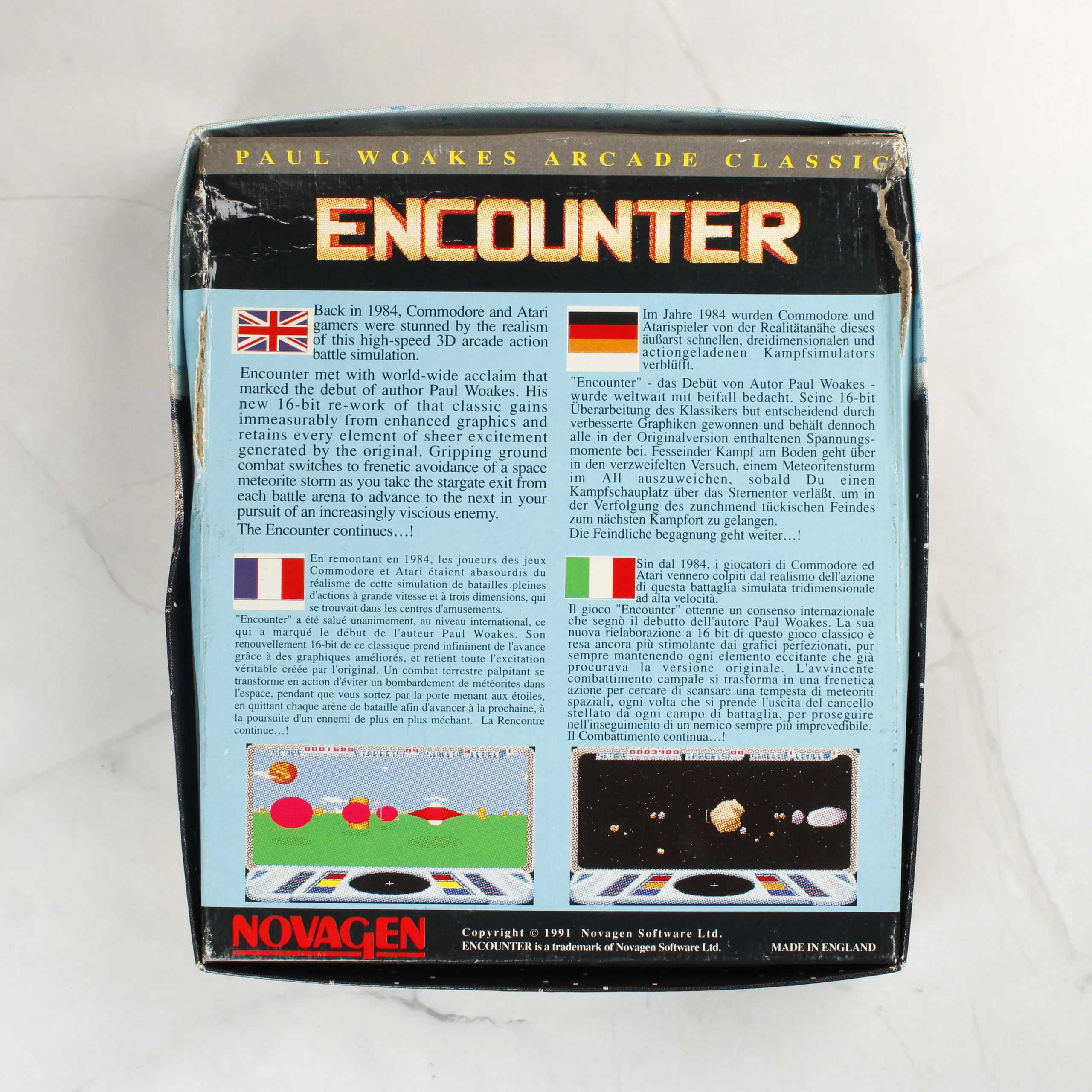 Az Encounter egy Paul Woakes által készített 3D-s arcade akciójáték Amiga számítógépre, amelyet a Novagen Software Ltd. adott ki 1991-ben. A csomag tartalmazza az eredeti kartondobozt, két darab kék színű, 3,5 colos floppy lemezt és a hozzá tartozó használati útmutatót. A doboz elején színes, pixeles grafika látható, amely egy vörös bolygót és egy zöld űrhajót ábrázol a világűrben. A hátoldalon négy nyelven olvasható a játék leírása, valamint két képernyőkép mutatja be a játékmenetet. A szoftver az 1984-es klasszikus 16 bites felújított változata.