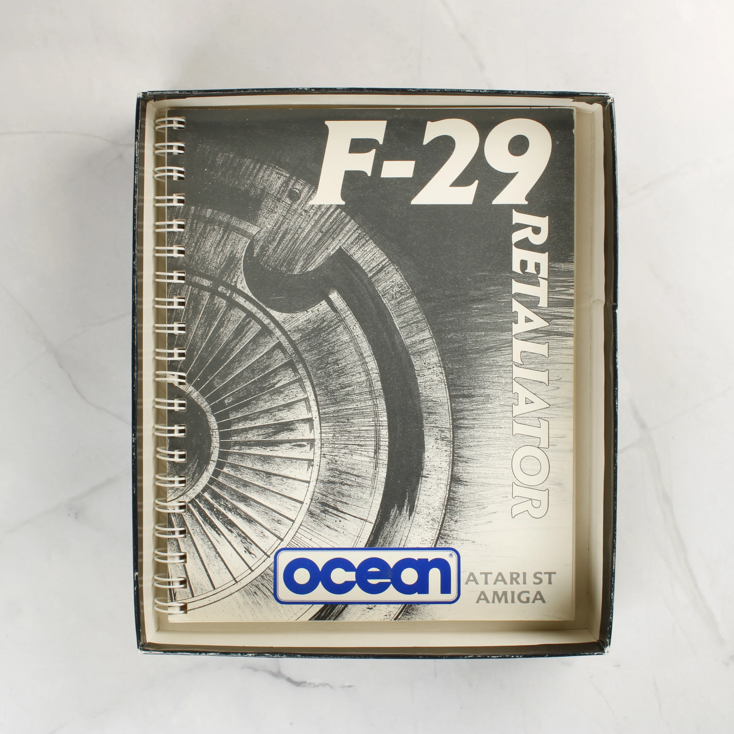 Az F-29 Retaliator egy klasszikus repülőgép-szimulátor videójáték Amiga platformra, az Ocean Software gondozásában. A csomag tartalmazza az eredeti kartondobozt, amelyen egy vadászgép látható akció közben, valamint a hátoldalán többnyelvű leírás és képernyőmentések találhatók. A doboz belsejében egy spirálkötésű, fekete-fehér illusztrációkkal ellátott kézikönyv és két darab kék színű, 3,5 colos floppy lemez található. A lemezeken fehér felirattal szerepel a játék címe és a kiadó logója. A csomagolás és a tartozékok koruknak megfelelő állapotban vannak, a doboz élein és sarkain látható kopásokkal és kisebb benyomódásokkal.