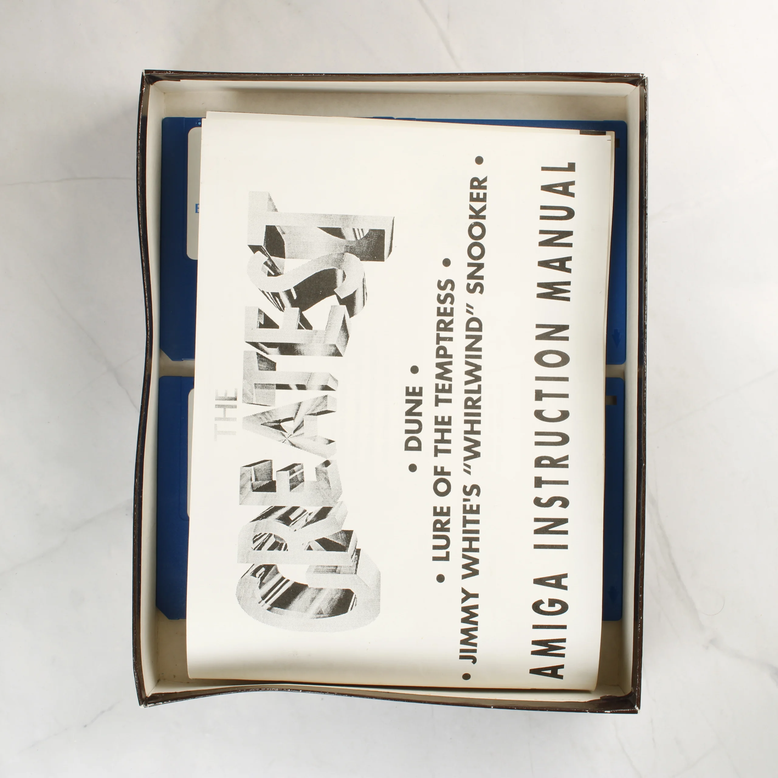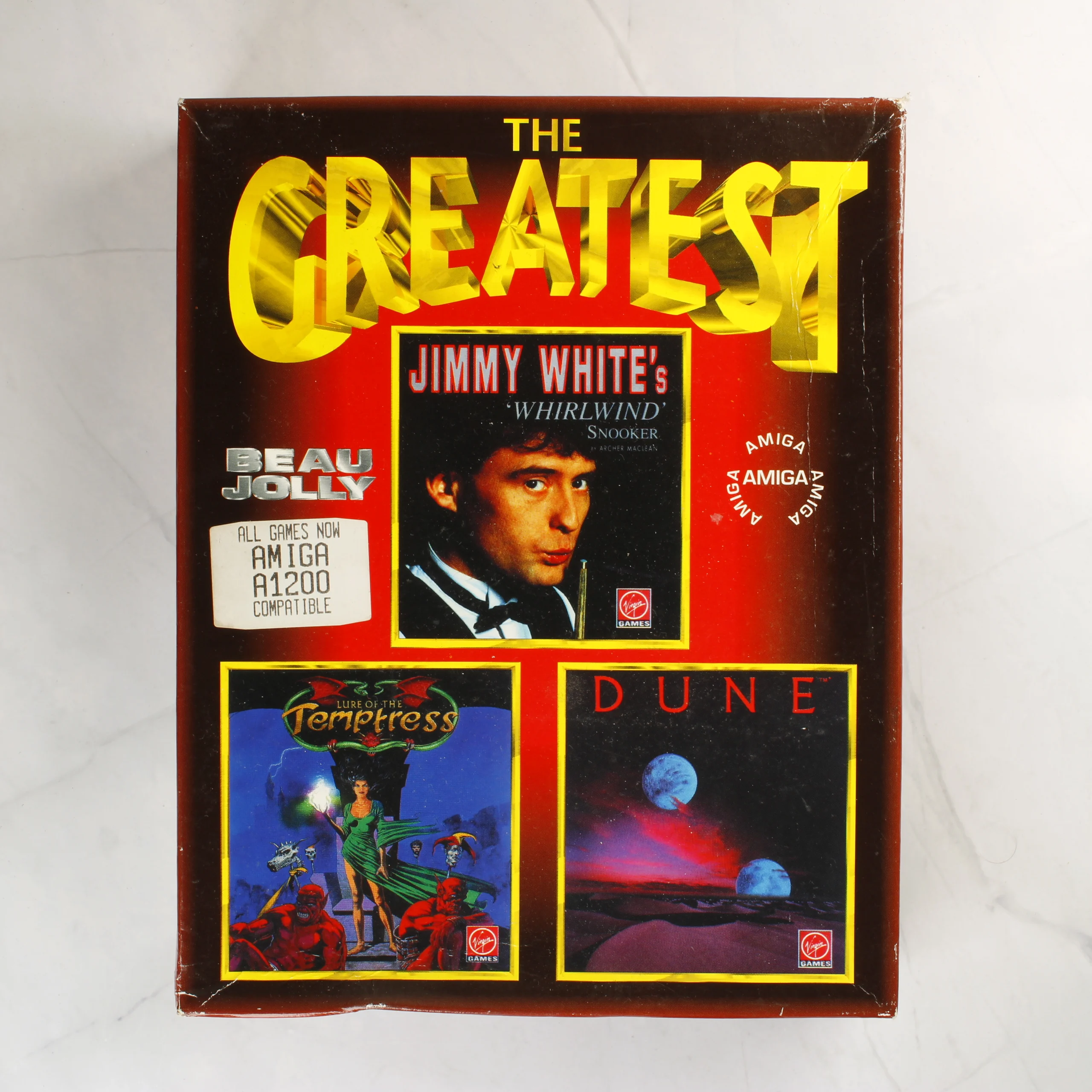 A Beau Jolly által kiadott The Greatest című videójáték-válogatás Amiga platformra. A csomag három klasszikus címet tartalmaz: Dune, Lure of the Temptress és Jimmy White's 'Whirlwind' Snooker. A készlet összesen nyolc darab kék színű, 3,5 colos floppy lemezt tartalmaz, amelyek fehér címkével vannak ellátva. A lemezeken jól olvasható a játékok címe és a lemez sorszáma. A csomag részét képezi egy fekete-fehér nyomtatású, angol nyelvű használati útmutató is. A külső kartondoboz színes, fényes felületű, az elején a játékok borítóképei láthatóak. A dobozon egy fehér matrica jelzi az Amiga 1200 kompatibilitást. A termék használt, a doboz élein és sarkain kopásnyomok, valamint enyhe deformáció látható. A belső papír alkatrészek és a lemezek esztétikailag megkímélt állapotban vannak.