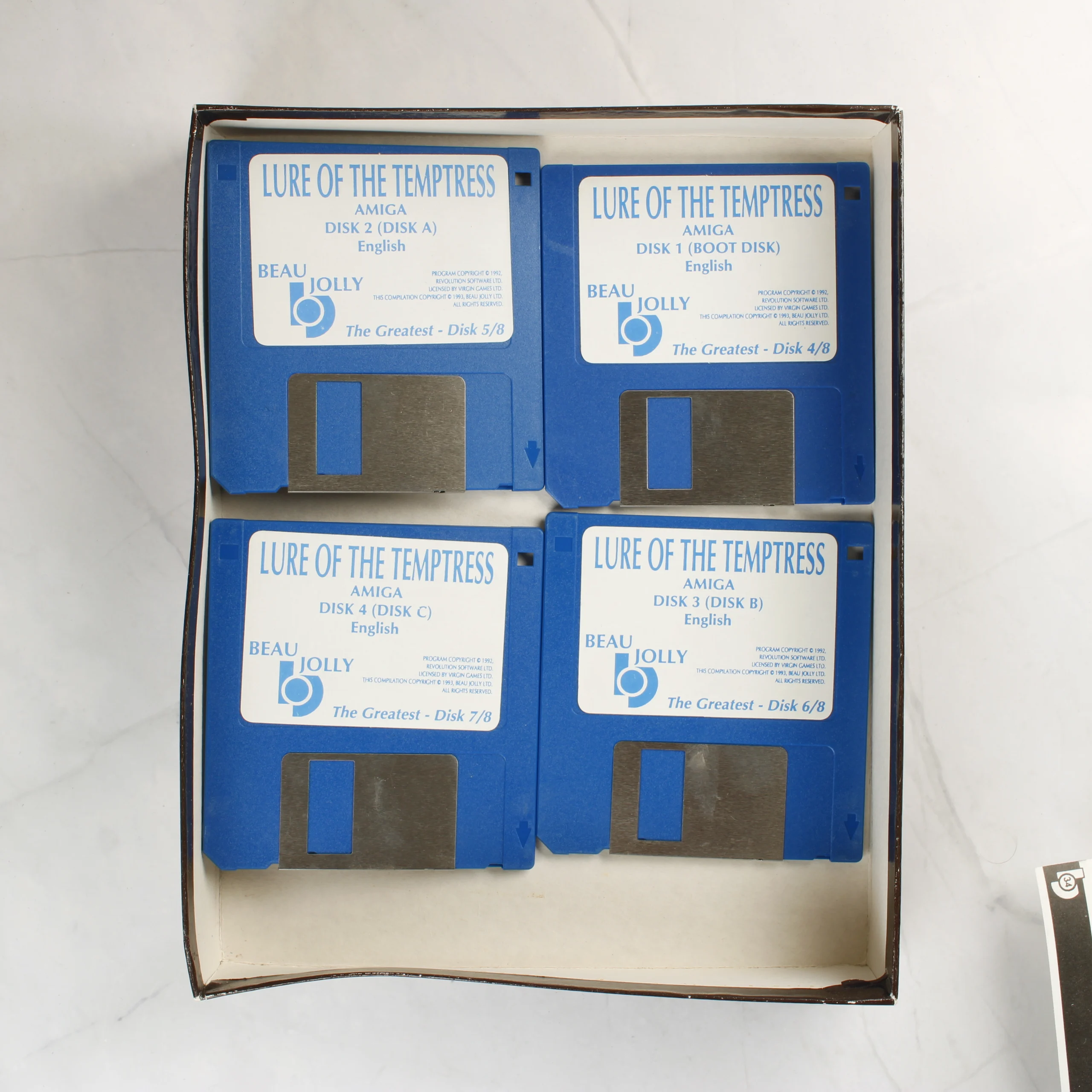 The Greatest Beau Jolly válogatás Amiga számítógépre. Tartalmazza a Dune, Lure of the Temptress és Jimmy White's Snooker játékokat 8 darab floppy lemezen.