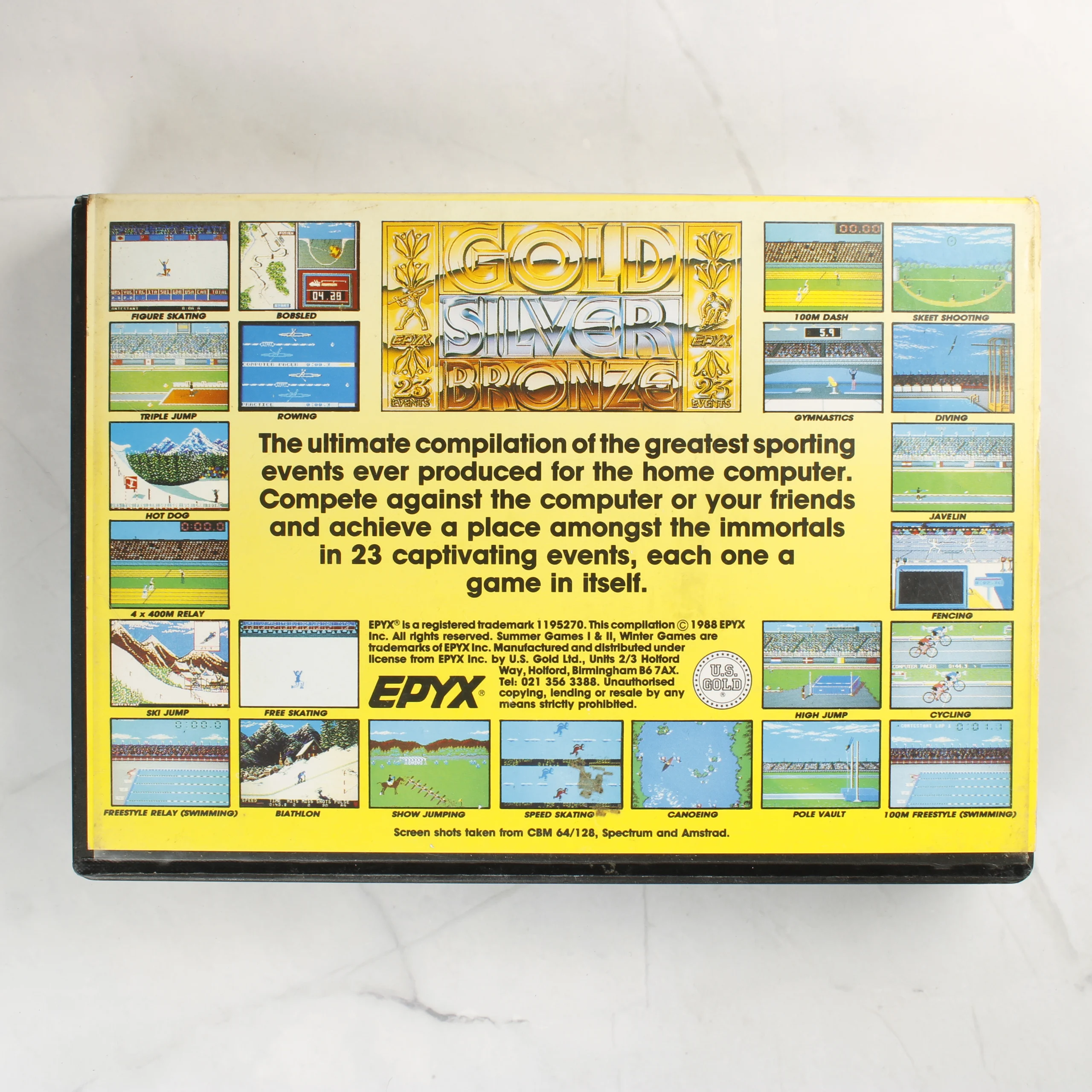 Ez a Commodore 64/128 platformra készült videójáték-válogatás az Epyx 'Gold, Silver, Bronze' gyűjteménye, amely a Summer Games I, Summer Games II és Winter Games sportjátékokat tartalmazza. A csomag egy fekete műanyag tokban található, amelyben három darab 5,25 colos floppy lemez kapott helyet fehér papírtokokban. A borító sárga alapszínű, fémes hatású arany, ezüst és bronz feliratokkal, valamint a játékokból vett illusztrációkkal díszített. A hátoldalon számos színes képernyőkép látható a különböző sportágakról, mint például a műkorcsolya, bob, távolugrás és vívás. A kiadványt az U.S. Gold terjesztette 1988-ban. A tok és a lemezek állapota megkímélt, a papírtokokon enyhe sárgulás és használati nyomok fedezhetők fel.