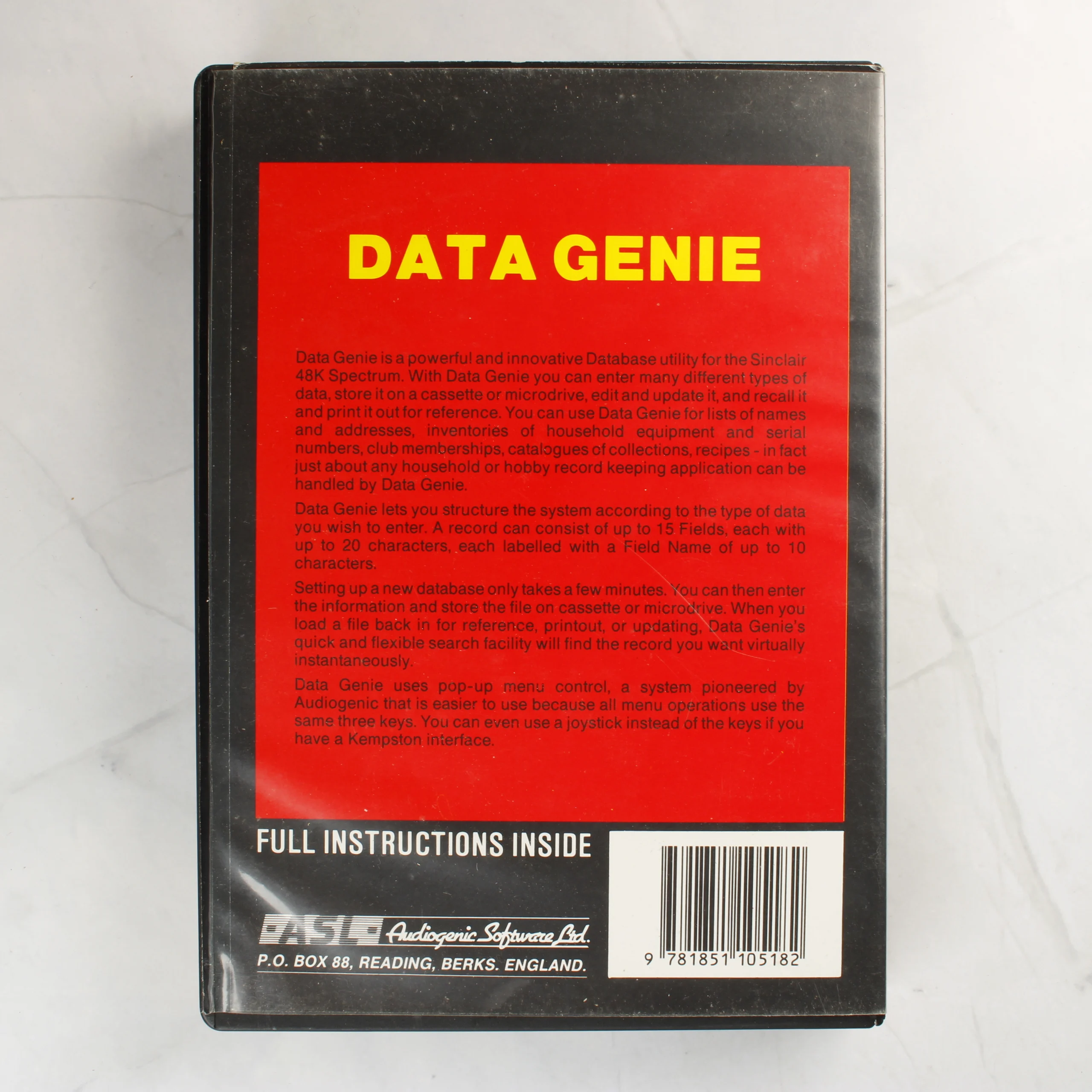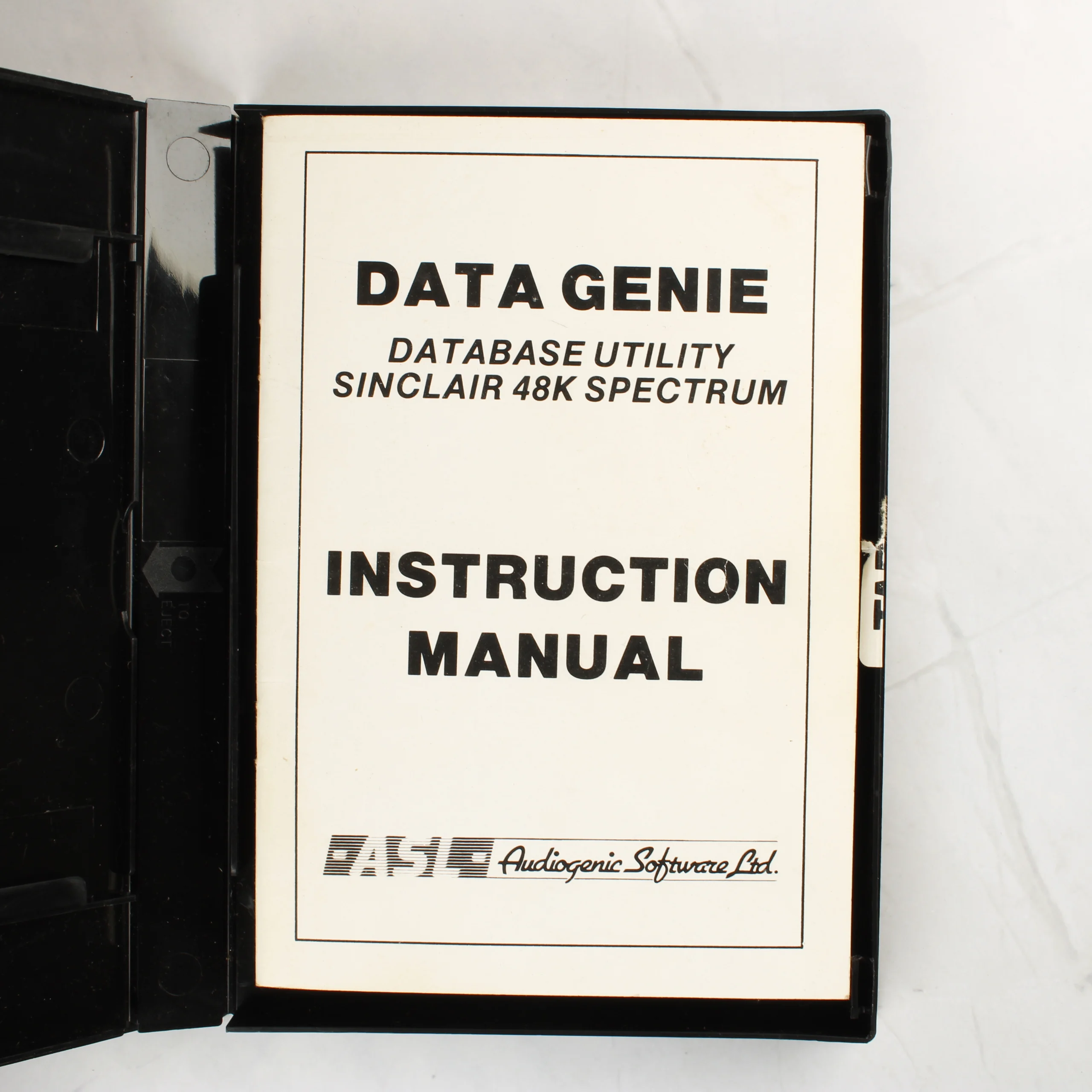 A Data Genie egy adatbázis-kezelő szoftver Sinclair 48K Spectrum számítógéphez, amelyet az Audiogenic Software Ltd. adott ki. A csomag egy fekete műanyag tokból áll, amelyben egy eredeti magnókazetta és egy nyomtatott használati útmutató található. A borító élénkvörös alapszínű, sárga feliratokkal és egy képernyőfotóval, amely a szoftver menürendszerét szemlélteti. A tok elején kék és arany színű matricák jelzik a Microdrive kompatibilitást és a Spectrum Plus 2, illetve 128 verziók meglétét. A kazetta fekete házas, kék-fehér címkével ellátott, rajta a szoftver címe és a kiadó logója látható. A használati útmutató fehér papírra nyomtatott, fekete betűkkel.