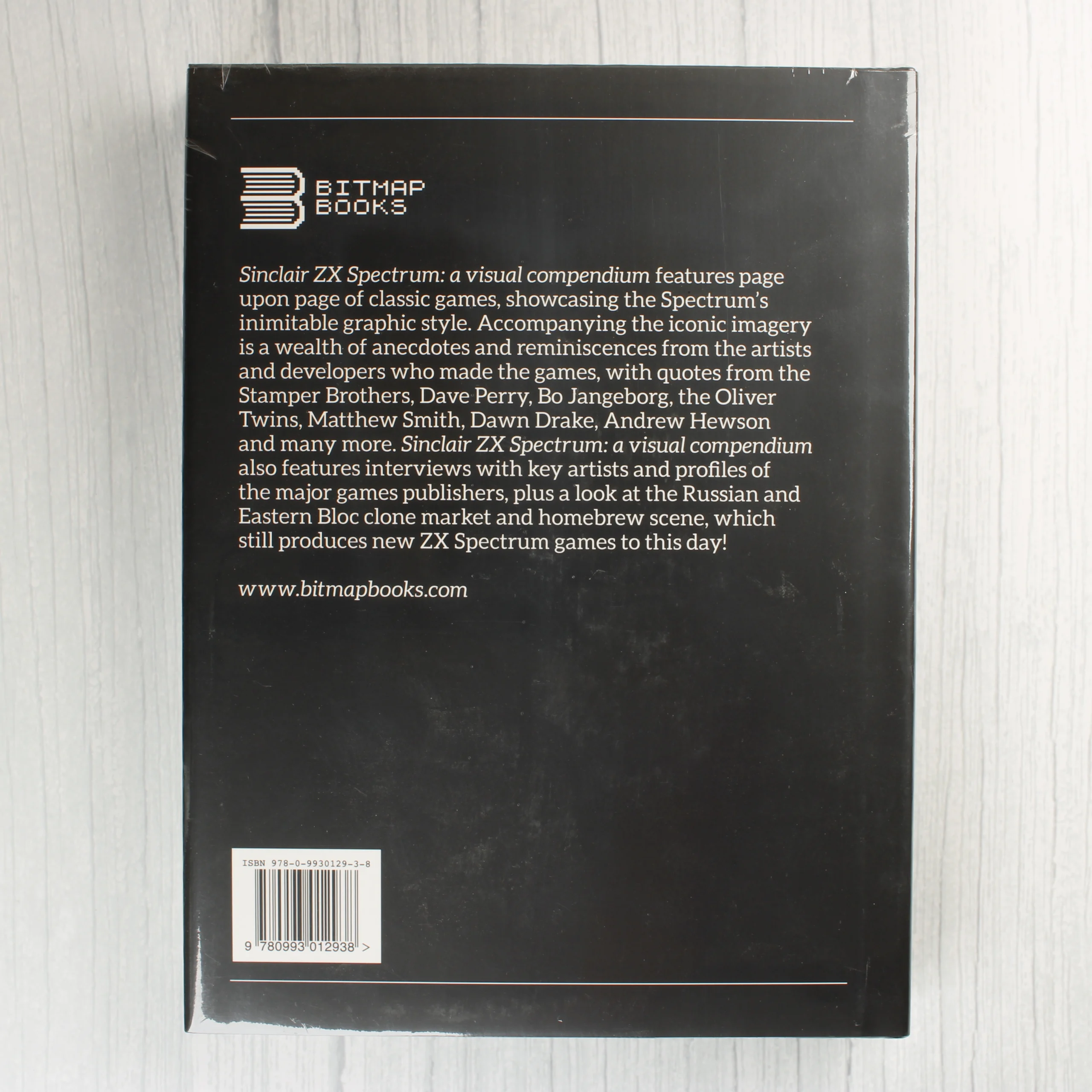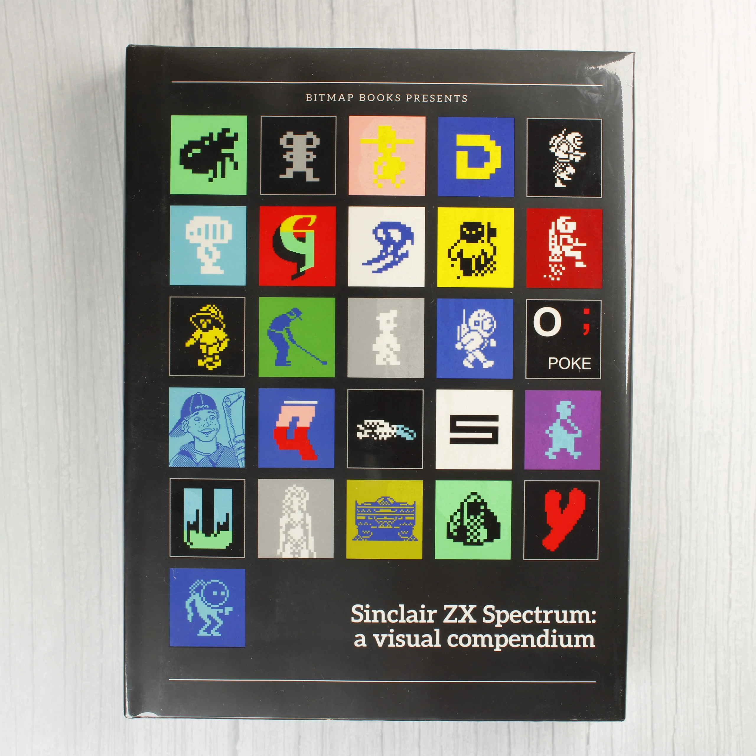 A Bitmap Books által kiadott Sinclair ZX Spectrum: a visual compendium egy keménytáblás könyv, amely a klasszikus számítógépes játékok vizuális világát mutatja be. A fekete borítón huszonhat darab színes négyzet látható, amelyekben ikonikus 8-bites karakterek és grafikai elemek kaptak helyet pixel art stílusban. A hátoldalon fehér betűkkel olvasható a kiadvány ismertetője, amely interjúkat és fejlesztői visszaemlékezéseket ígér. A könyv fényes felületű védőfóliával vagy bevonattal rendelkezik, amelyen némi ujjlenyomat és felületi tükröződés látható. A sarkok és élek épek, a kötés szorosnak tűnik. A hátoldal alsó részén jól látható a vonalkód és az ISBN azonosító.
