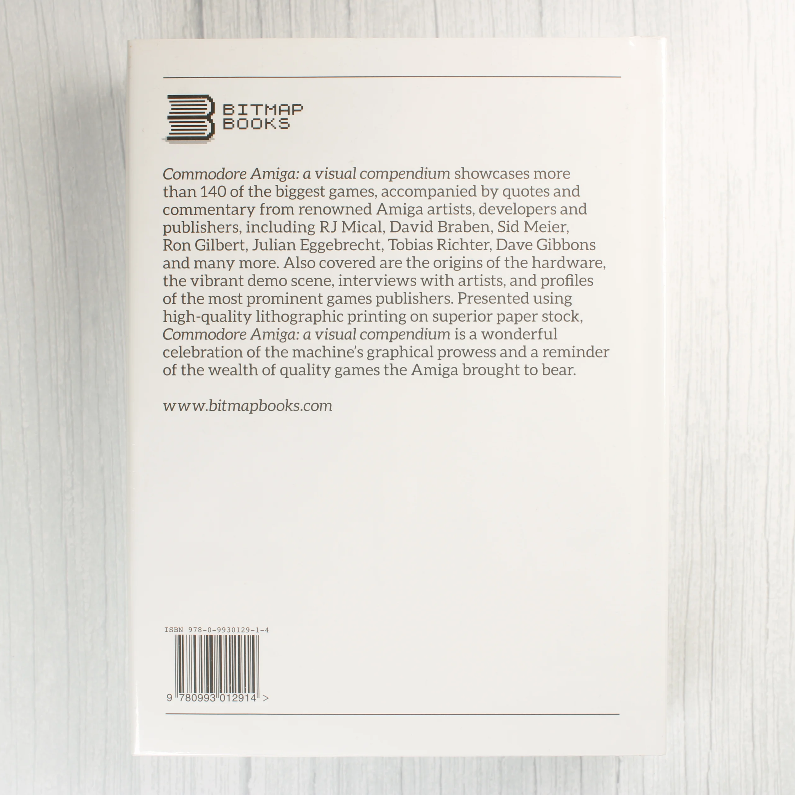 A Commodore Amiga: a visual compendium egy keménytáblás művészeti könyv a Bitmap Books kiadásában. A fehér borítón huszonhat darab színes, négyzet alakú illusztráció látható, amelyek ikonikus Amiga videójátékok karaktereit, járműveit és logóit ábrázolják pixel art stílusban. A borító alsó részén a cím olvasható sötétkék betűkkel. A hátoldalon a kiadó logója és egy angol nyelvű ismertető szöveg található, amely a könyv tartalmát részletezi, beleértve a játékokat, fejlesztői interjúkat és a demoscene világát. A könyv gyári védőfóliában van, ami megvédi a felületet a külső behatásoktól. A sarkok épek, a kötés szorosnak tűnik. A hátoldal alján jól látható az ISBN azonosító és a vonalkód. A kiadvány prémium minőségű papírra készült, litográfiai nyomtatással.