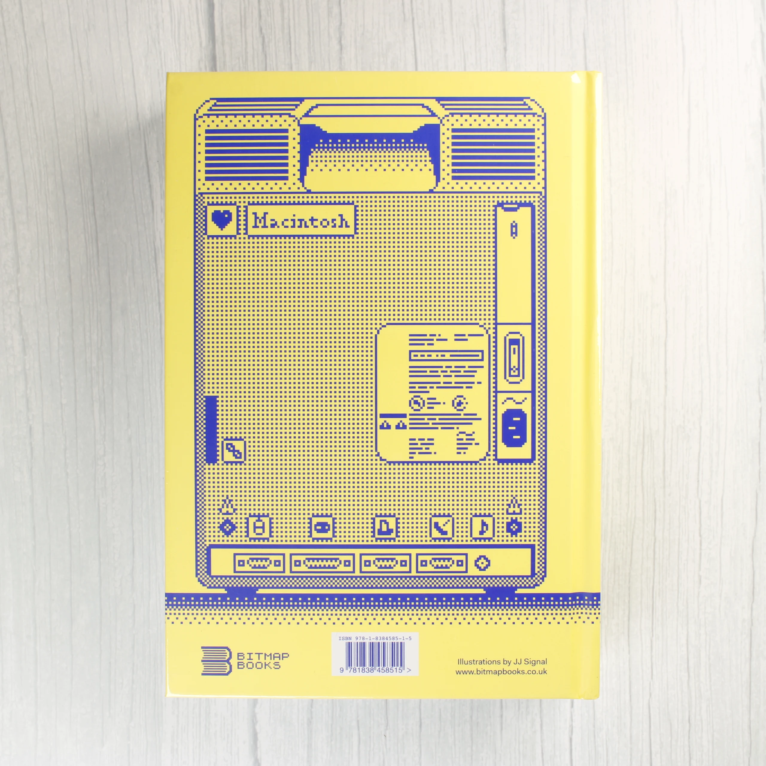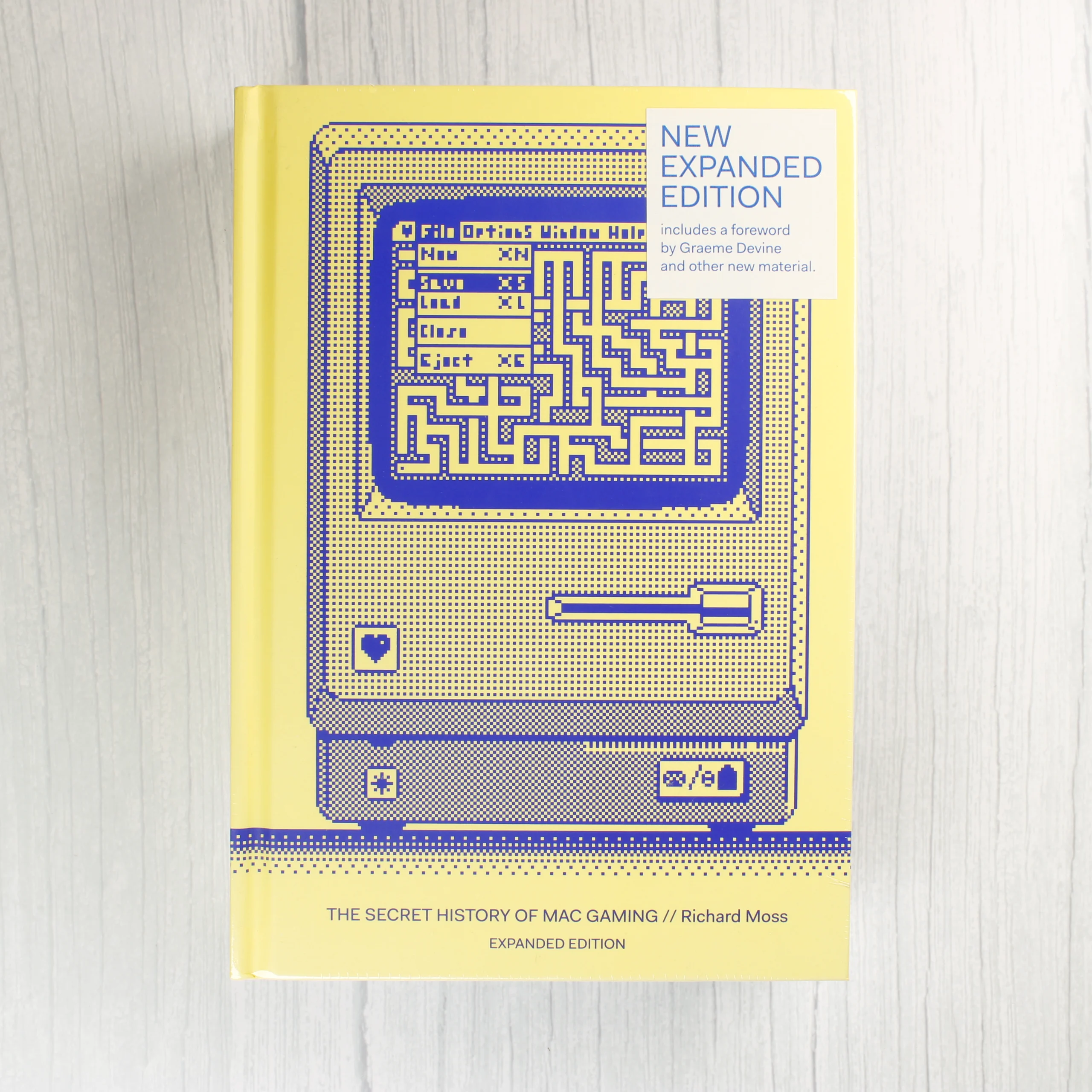 A The Secret History of Mac Gaming című könyv bővített kiadása, Richard Moss tollából. A keménytáblás kötet borítója élénksárga alapszínű, rajta egy klasszikus Macintosh számítógép kék színű, pixeles stílusú illusztrációja látható. Az előlapon egy fehér matrica jelzi az új, bővített kiadást, amely Graeme Devine előszavát is tartalmazza. A hátoldalon a számítógép hátulnézeti rajza szerepel a csatlakozókkal, valamint a Bitmap Books logója és az ISBN vonalkód. A könyv állapota kiváló, a sarkok épek, a felület tiszta és sérülésmentes. A grafikai elemek élesek, a színek telítettek.