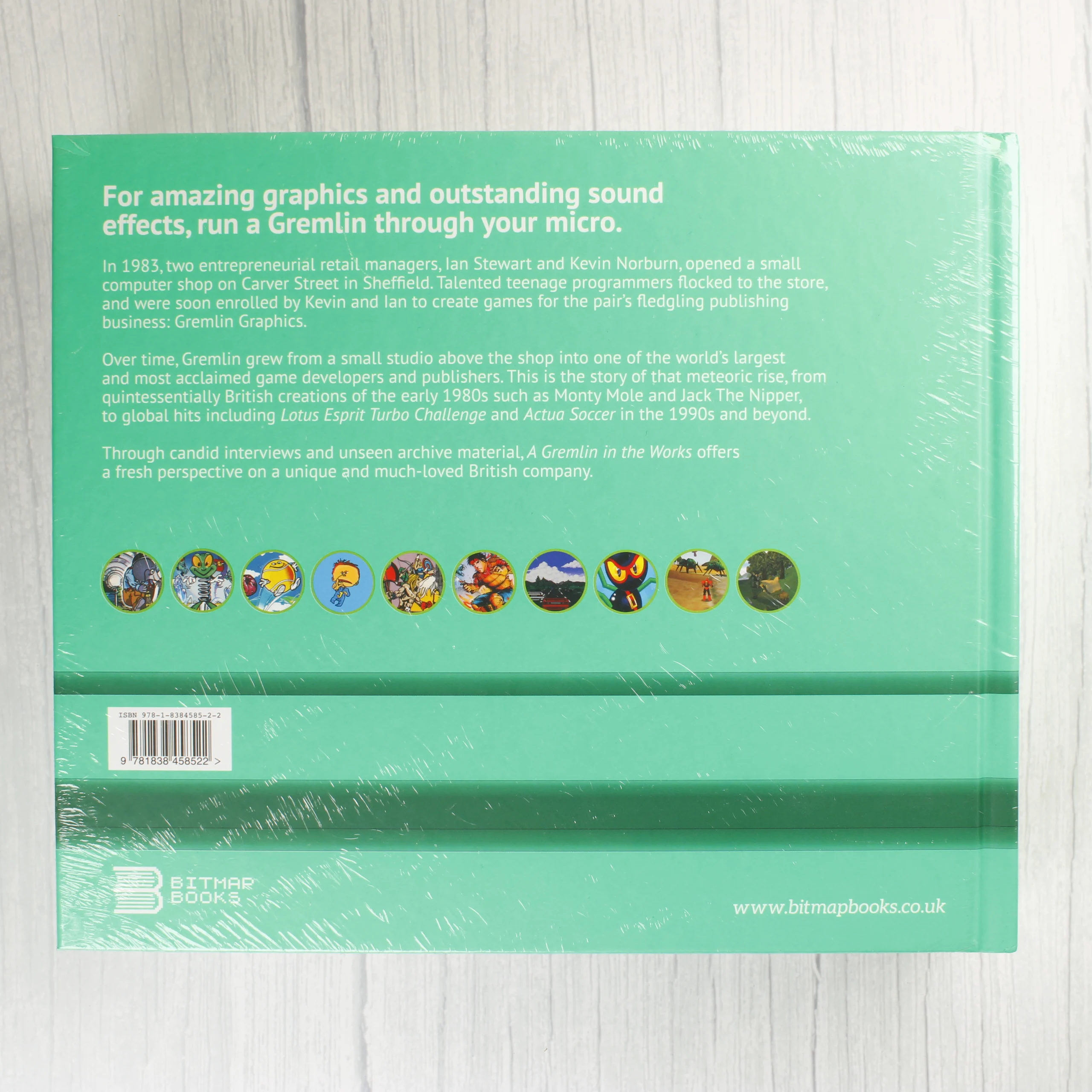 A Gremlin in the Works keménytáblás könyv a Gremlin Graphics történetéről, gyári fóliázott állapotban a Bitmap Books kiadásában.