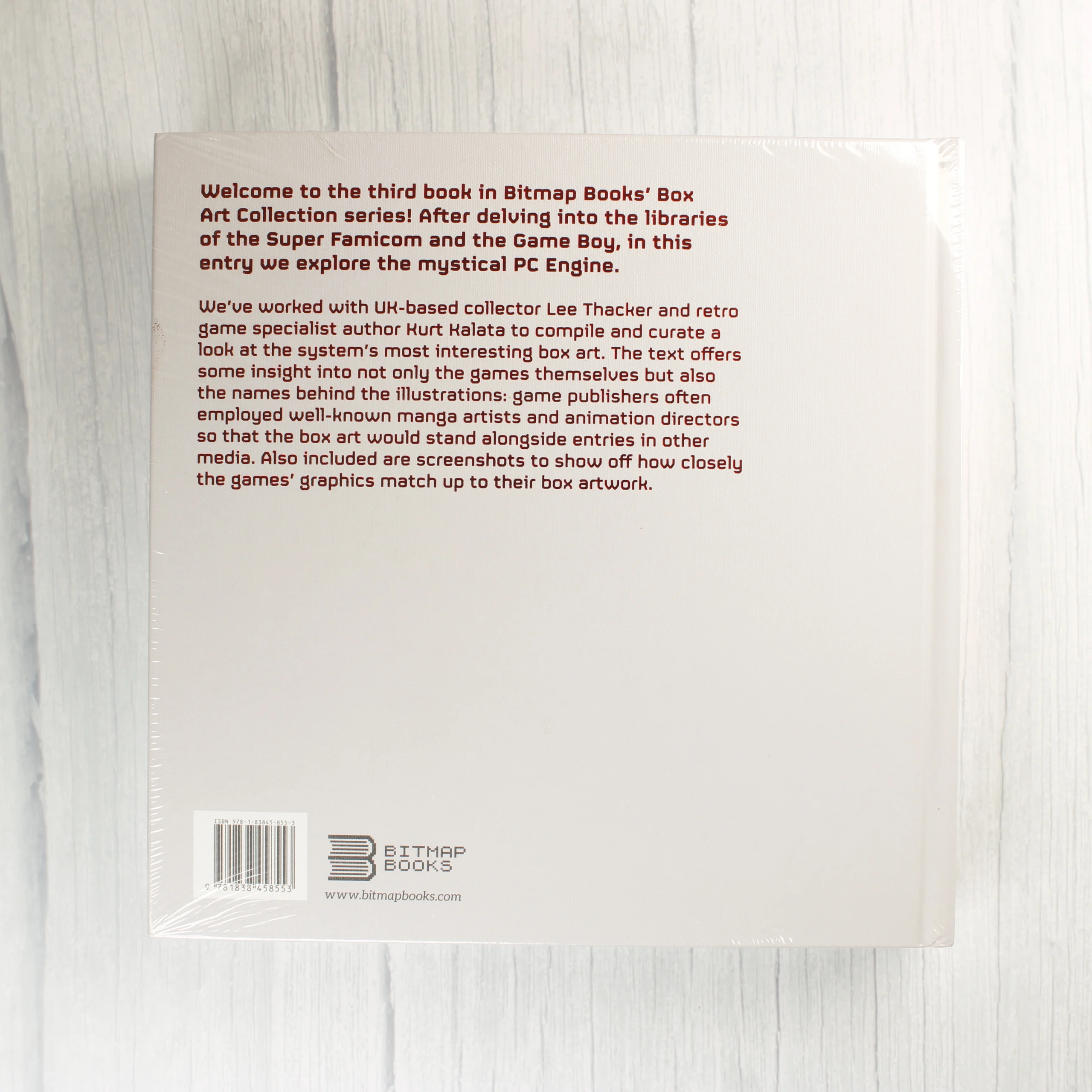 A Bitmap Books által kiadott PC Engine: The Box Art Collection egy keménytáblás művészeti könyv, amely a klasszikus videójáték-konzol borítógrafikáit mutatja be. A kötet fehér borítóval rendelkezik, amelyen bordó színű, dombornyomott hatású feliratok láthatóak angol és japán nyelven. A kiadvány gyári védőfóliában van, ami megőrizte a borító épségét és tisztaságát. A hátoldalon angol nyelvű ismertető szöveg olvasható a tartalomról, valamint látható a kiadó logója, weboldala és az ISBN vonalkód. A könyv négyzetes formátumú, masszív kötésű, és láthatóan kiváló, bontatlan állapotban van.