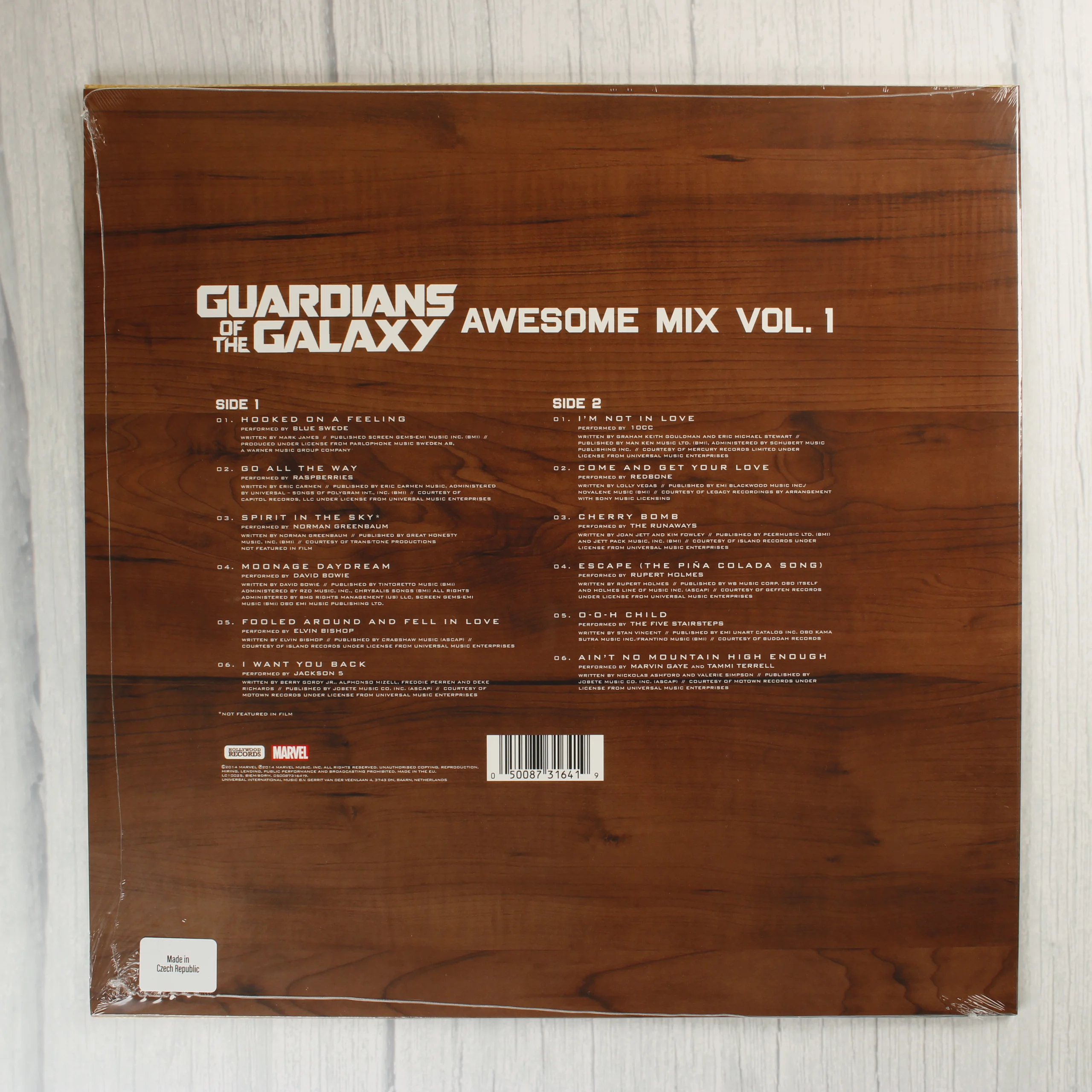 A Guardians of the Galaxy: Awesome Mix Vol. 1 című filmzene bakelit lemez kiadása. A borító előlapján egy magnókazetta grafikája látható egy lejátszóban, a jobb felső sarokban a Marvel logóval és a film címével. A hátoldal sötétbarna, faerezetes mintázatú, amelyen a két oldalon található zeneszámok listája olvasható fehér betűkkel. A termék gyári védőfóliában van, a fólián egy fehér 'Made in Czech Republic' matrica és egy vonalkód látható. A csomagolás ép, a sarkok és élek sértetlenek.