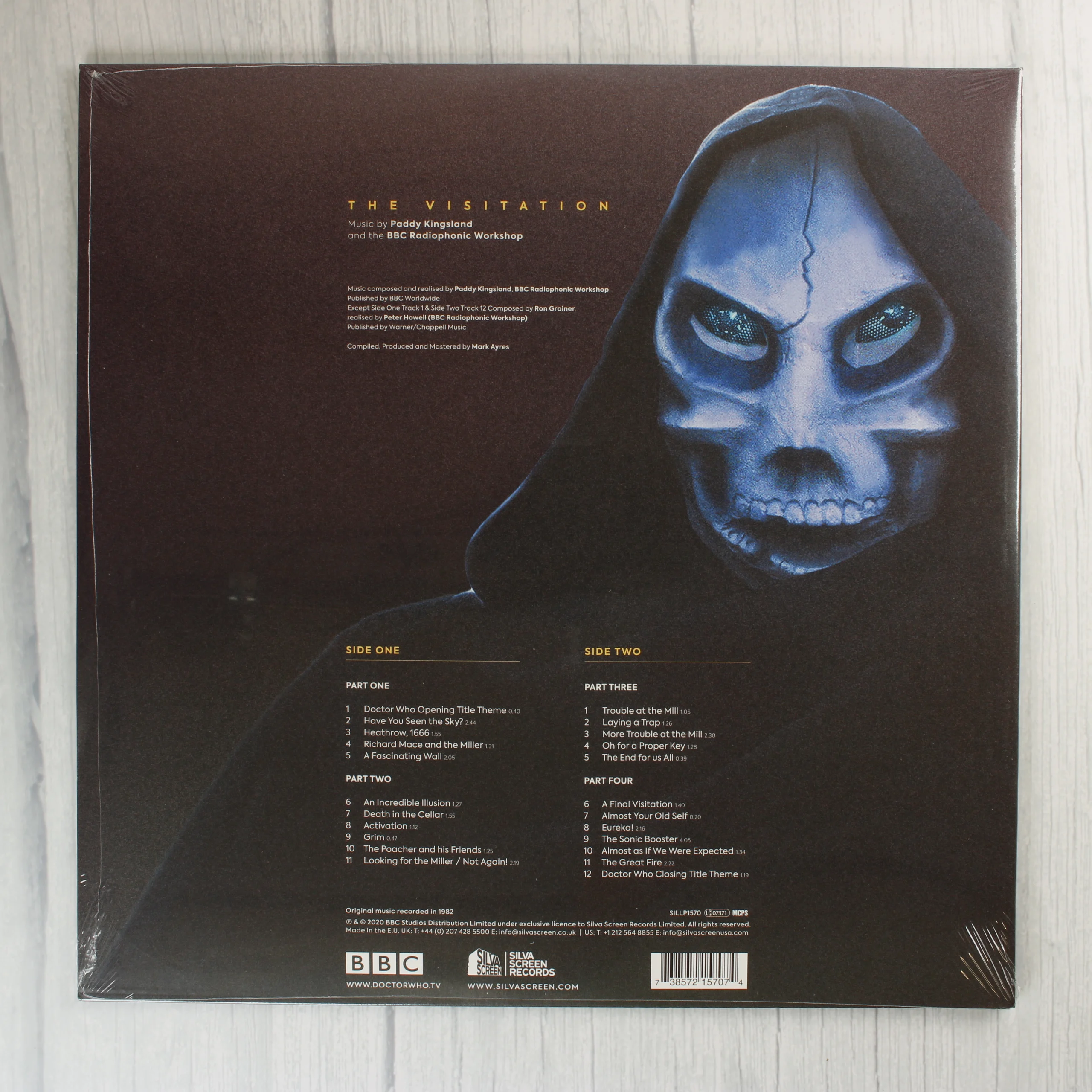 A Doctor Who: The Visitation című televíziós sorozat eredeti filmzenéjét tartalmazó bakelit lemez. A kiadvány Paddy Kingsland és a BBC Radiophonic Workshop munkáját tartalmazza. A borító előlapján a sorozat karakterei láthatóak lángoló háttér előtt, míg a hátoldalon a részletes számlista és egy nagyméretű maszkos alak grafikája szerepel. A termék gyári védőfóliában van, a jobb felső sarokban egy kerek matrica jelzi, hogy ez egy limitált kiadású, átlátszó zöld színű bakelit lemez. A Silva Screen Records gondozásában megjelent album borítója ép, a sarkok és élek sértetlenek a fólia alatt.