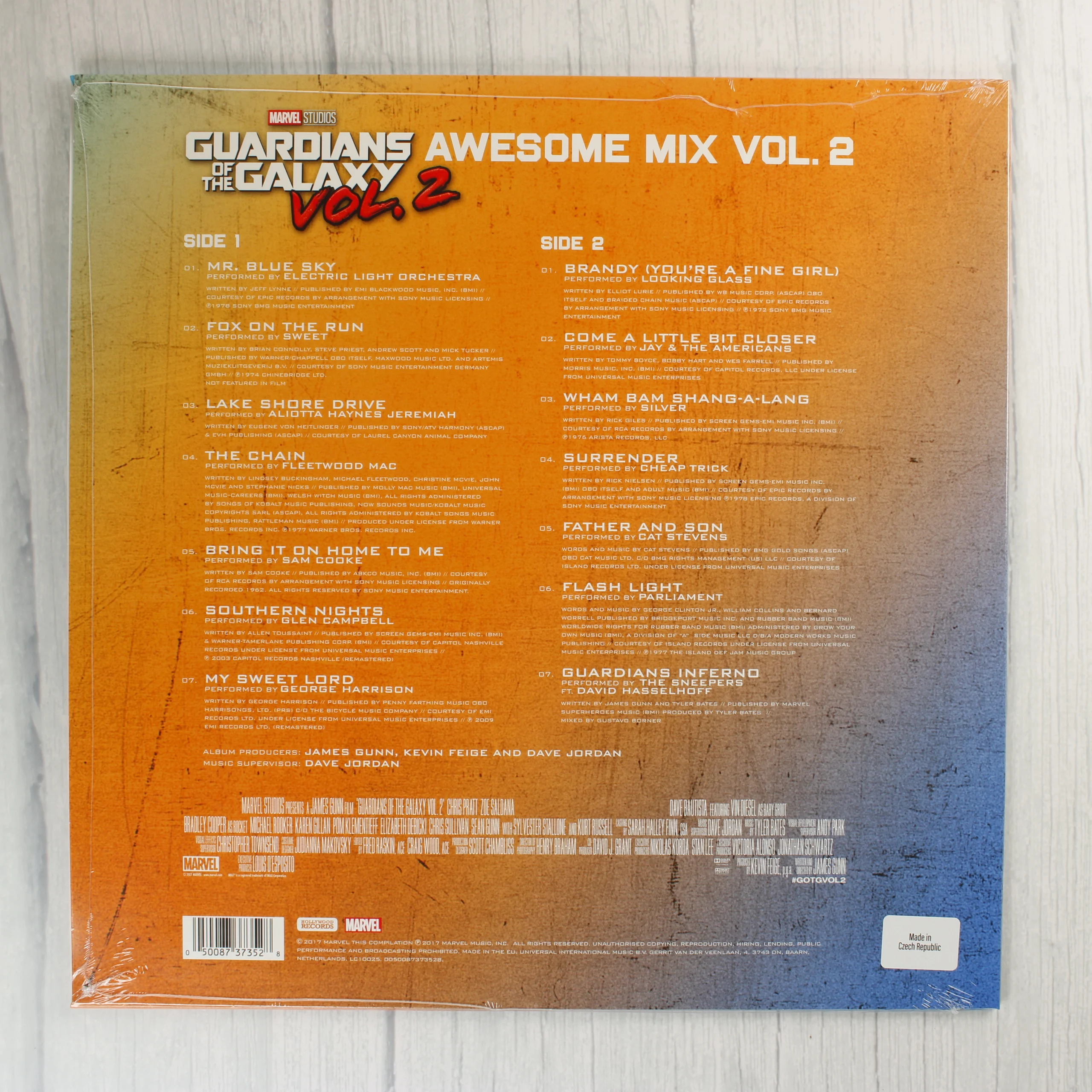 A Marvel Studios Guardians of the Galaxy Vol. 2 filmzenéje bakelit lemezen. A borító előlapján egy Awesome Mix Vol. 2 feliratú magnókazetta grafikája látható narancssárga és kék tónusú háttér előtt. A hátoldalon a Side 1 és Side 2 dalainak listája olvasható, többek között az Electric Light Orchestra, a Fleetwood Mac és George Harrison előadókkal. A kiadvány gyári védőfóliában van, a fólián egy Made in Czech Republic feliratú matrica látható. A csomagolás ép, a sarkok és élek sértetlenek. A termék teljesen új, bontatlan állapotú.