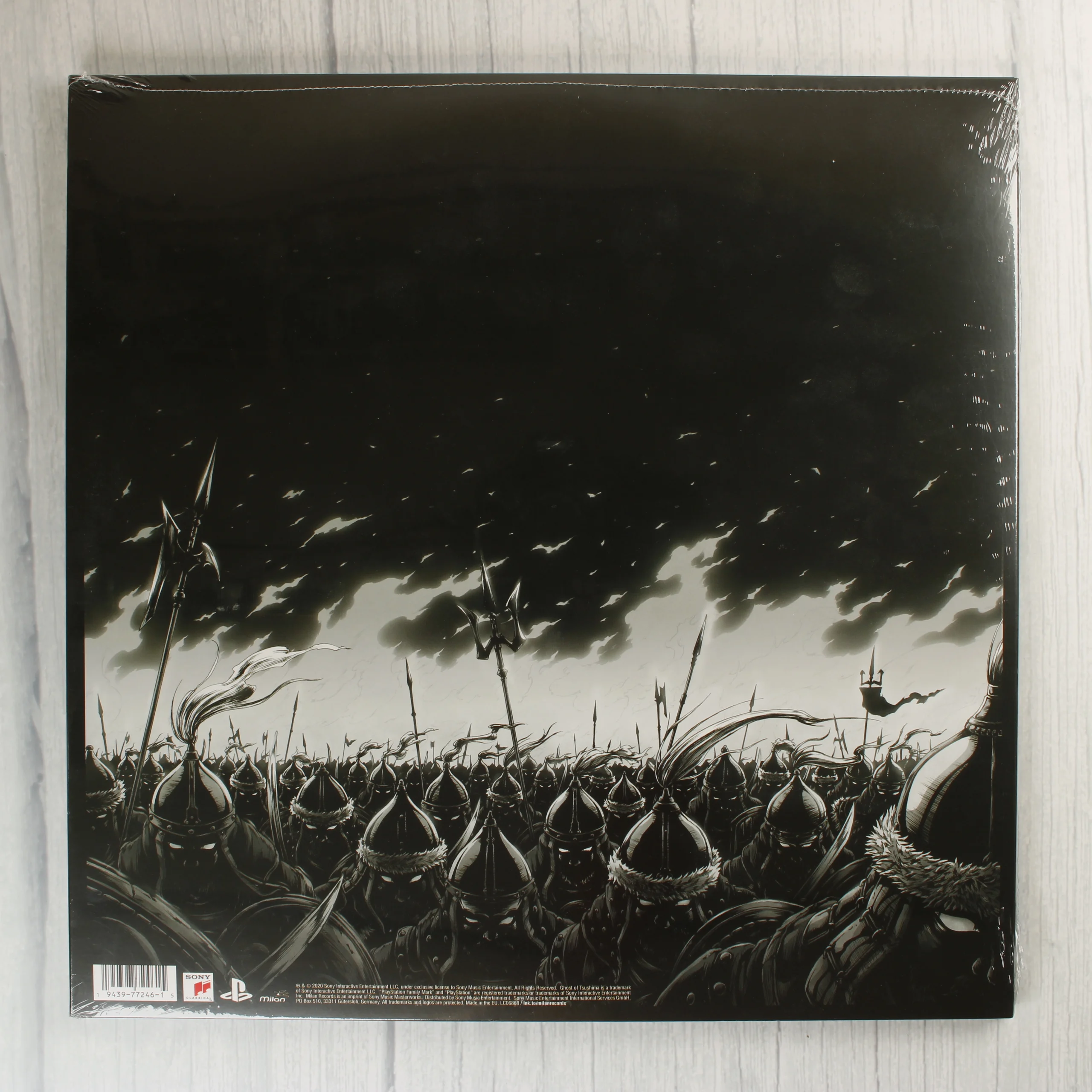 A Ghost of Tsushima videójáték zenéjét tartalmazó bakelit lemez, gyári bontatlan csomagolásban. A borító elején egy maszkos szamuráj látható fekete-fehér, illusztrált stílusban, két vörös juharlevéllel díszítve. A hátsó borítón egy sötét tónusú, lándzsás sereget ábrázoló grafika szerepel. A kiadványon látható a Sony Interactive Entertainment, a PlayStation és a Milan Records logója. A csomagolást védő fólia ép, a sarkok és élek sértetlenek. A termék fizikai állapota kiváló, használat nyomai nem láthatóak rajta.