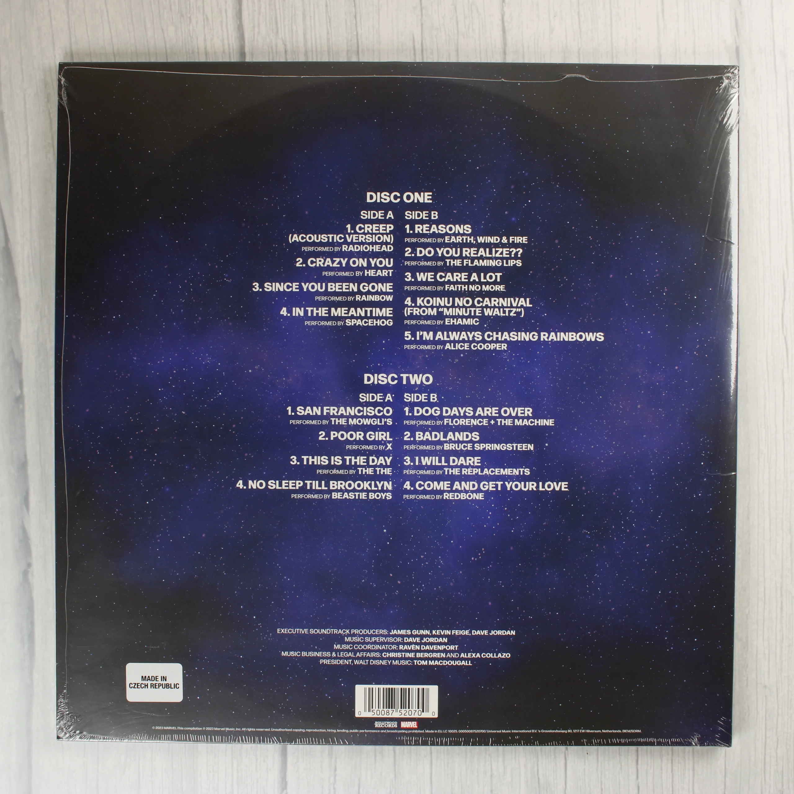 A Guardians of the Galaxy Vol. 3 című film eredeti filmzenéjét tartalmazó dupla bakelit lemez. A borító előlapján a film főszereplői láthatóak egy naplementés, űrbéli tájon, felettük a film logójával és a Marvel Studios felirattal. A hátoldalon a két lemez teljes számlistája olvasható csillagos égbolt háttér előtt, olyan előadókkal, mint a Radiohead, a Heart, a Beastie Boys és Bruce Springsteen. A kiadvány gyári védőfóliában van, a hátoldalán látható a vonalkód, a gyártási hely (Csehország) és a közreműködő producerek névsora. A csomagolás ép, tiszta, gyűjtői állapotú.