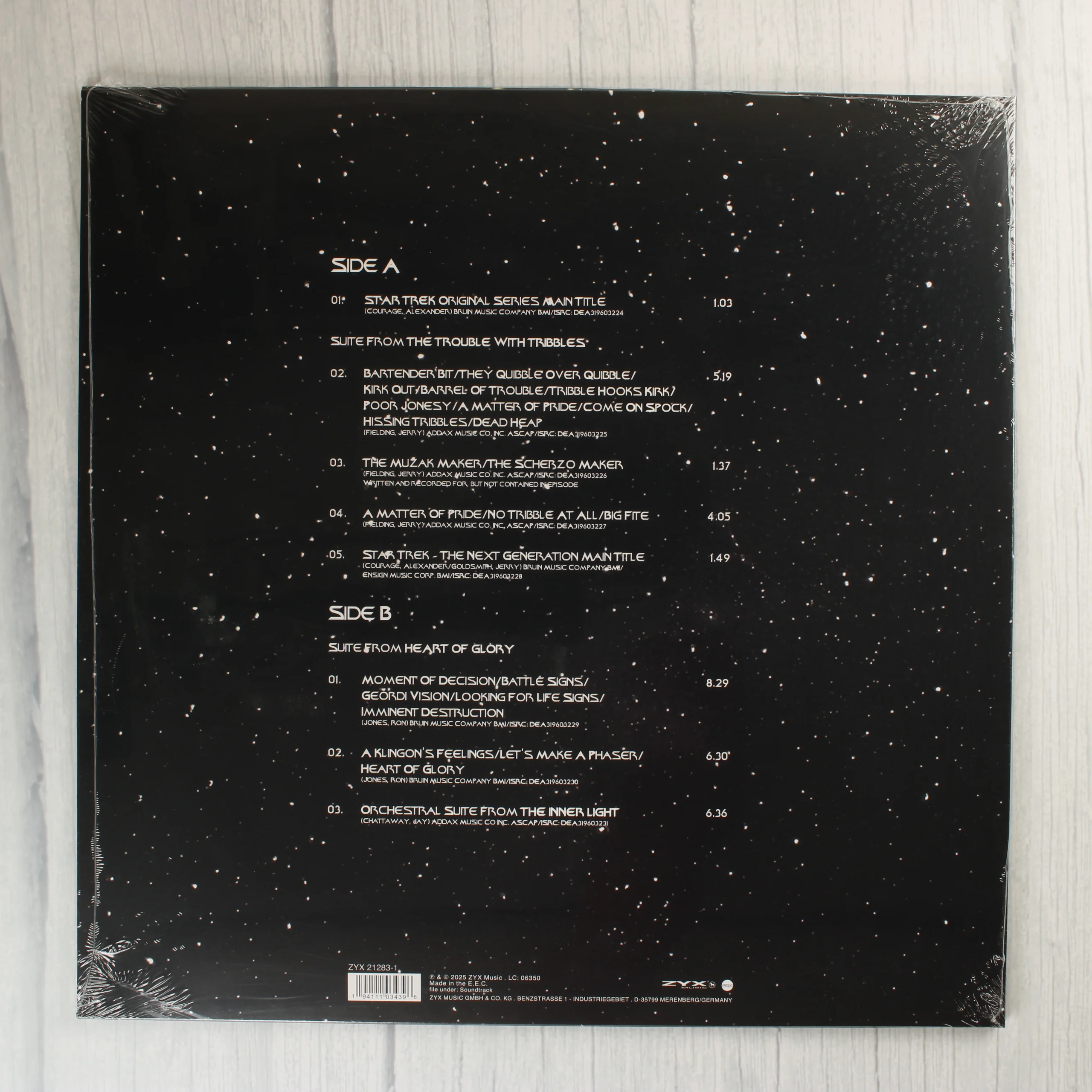 A Star Trek sorozat 30. évfordulója alkalmából kiadott eredeti filmzene válogatás első kötete bakelit lemezen. A borító előlapján a franchise ikonikus kapitányai és űrhajói láthatóak csillagos háttér előtt. A kiadvány gyári védőfóliában van, bontatlan állapotú. A hátsó borítón a két oldalon (Side A és Side B) található zeneszámok listája olvasható, beleértve az eredeti sorozat és a Next Generation főcímzenéit, valamint különböző epizódok szvitjeit. A lemez a GNP Crescendo Records és a ZYX Music gondozásában jelent meg, a borítón a Limited Coloured Vinyl felirat jelzi a különleges kiadást. A csomagolás ép, a sarkok és élek épek, használati nyom nem látható.