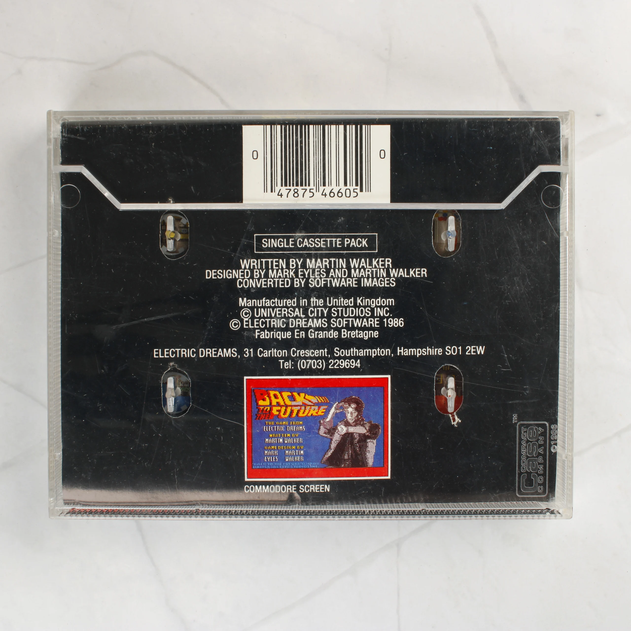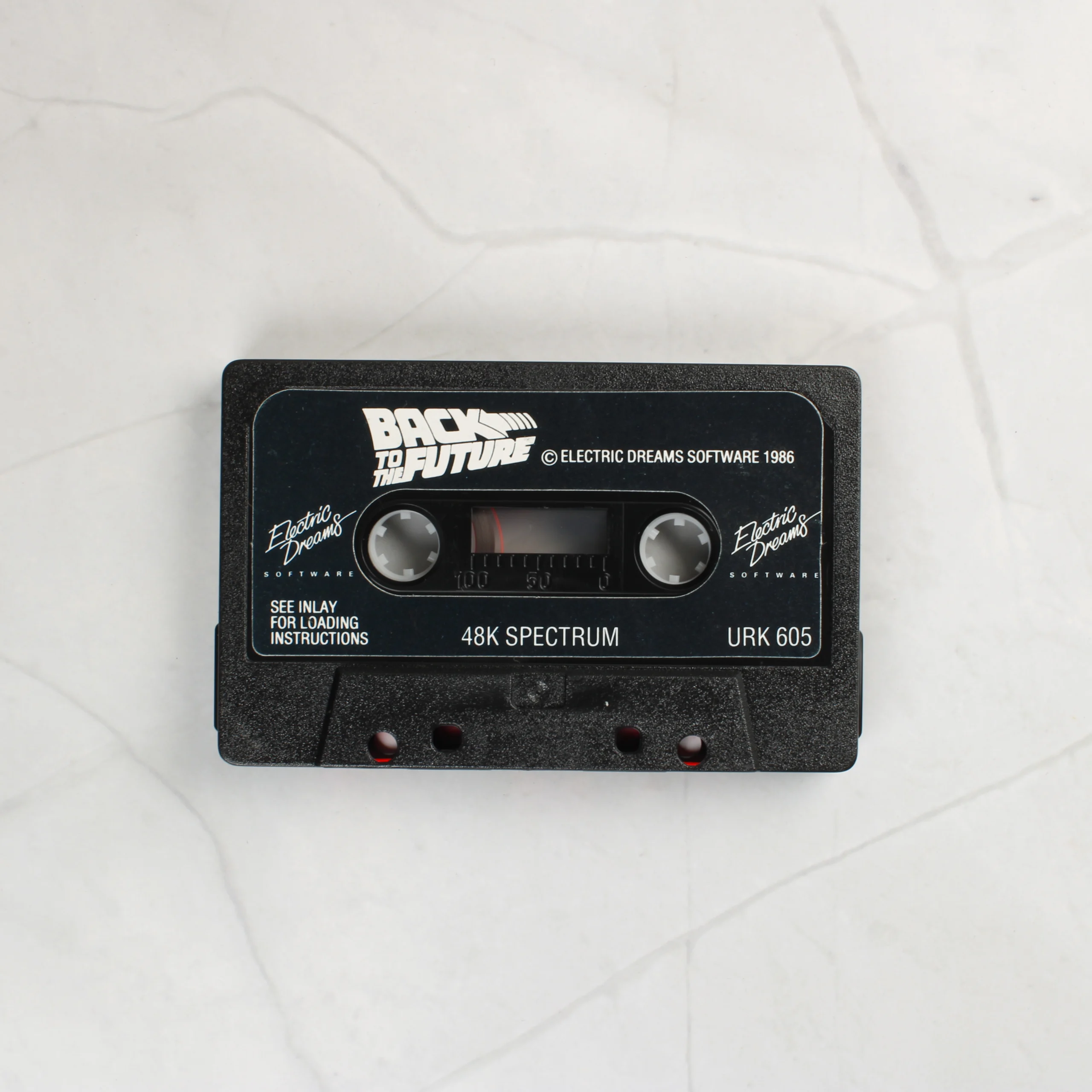 A Back to the Future videójáték ZX Spectrum 48K számítógépre kiadott változata. A csomag egy normál méretű, átlátszó műanyag tokot tartalmaz, amelyben a játékot tartalmazó fekete színű kazetta és a színes borító található. A borító előlapján a film ikonikus jelenete látható Marty McFly-jal és a DeLorean autóval, valamint az Electric Dreams Software logója. A hátoldalon a játék készítőinek nevei, a kiadás éve (1986) és egy Commodore képernyőkép szerepel. A kazettán fehér feliratok jelzik a címet, a platformot és a katalógusszámot. A műanyag tok felületén használatból eredő apró karcok és kopások láthatóak, de a papírborító és a kazetta címkéje épp állapotban van.
