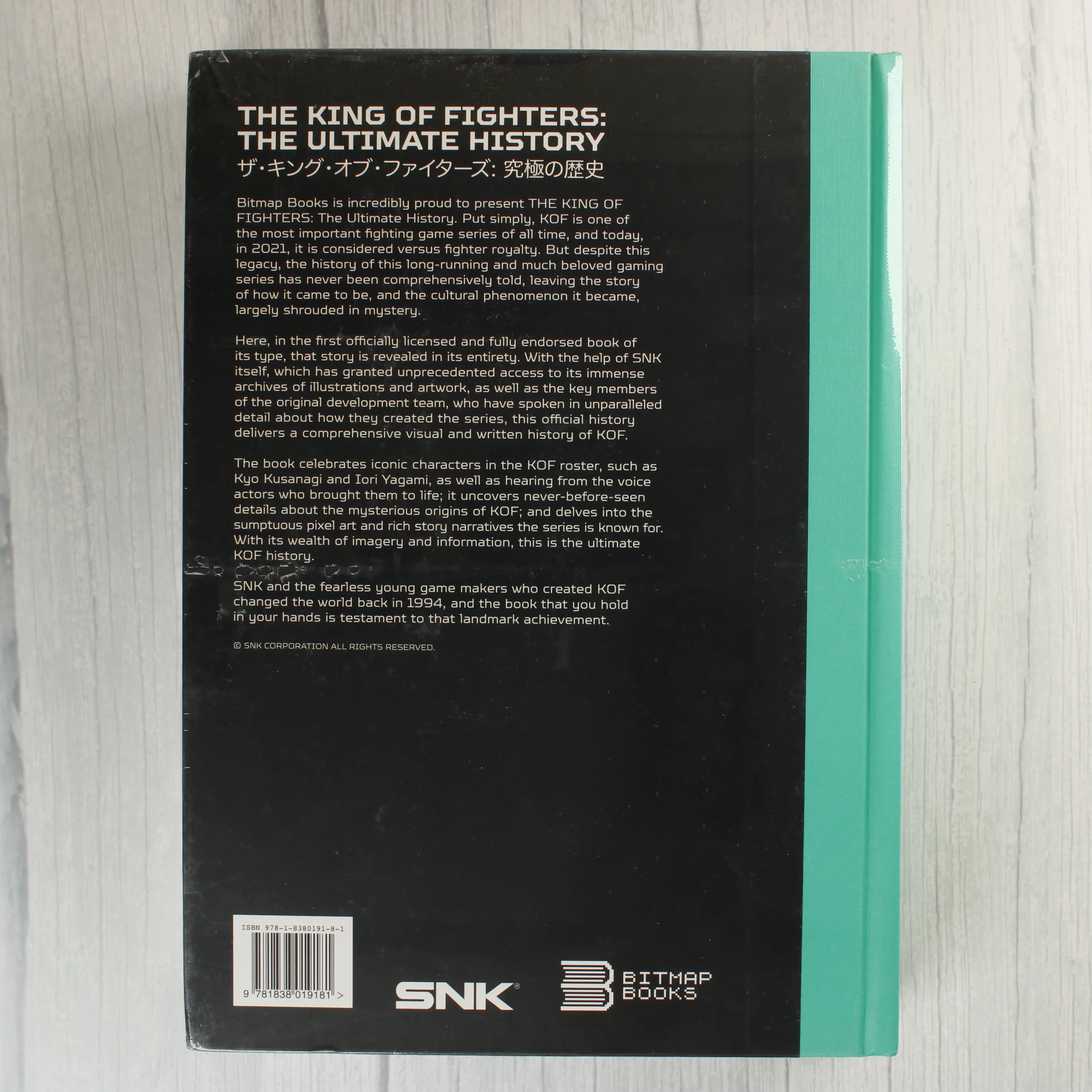 Ez a keménytáblás könyv a The King of Fighters videójáték-sorozat hivatalos történetét mutatja be. A borítón Kyo Kusanagi és egy másik karakter látható illusztrált stílusban, a bal oldalon pedig egy türkizkék sáv fut végig a címmel és az SNK logójával. A kiadványt a Bitmap Books jelentette meg az SNK-val együttműködésben. A hátsó borítón angol nyelvű összefoglaló olvasható a sorozat 1994-es indulásáról és kulturális hatásáról. A termék gyári védőfóliában van, amelyen egy kék SNK Official Licensed Product matrica látható. A fólia sértetlen, a sarkok épek, a könyv állapota kiváló, használat nyomai nem látszanak rajta.