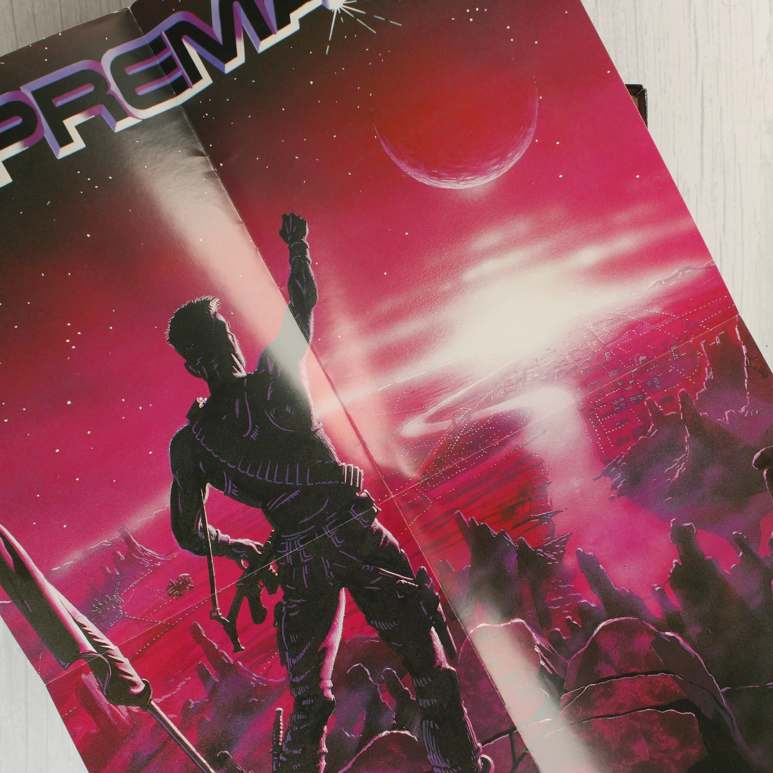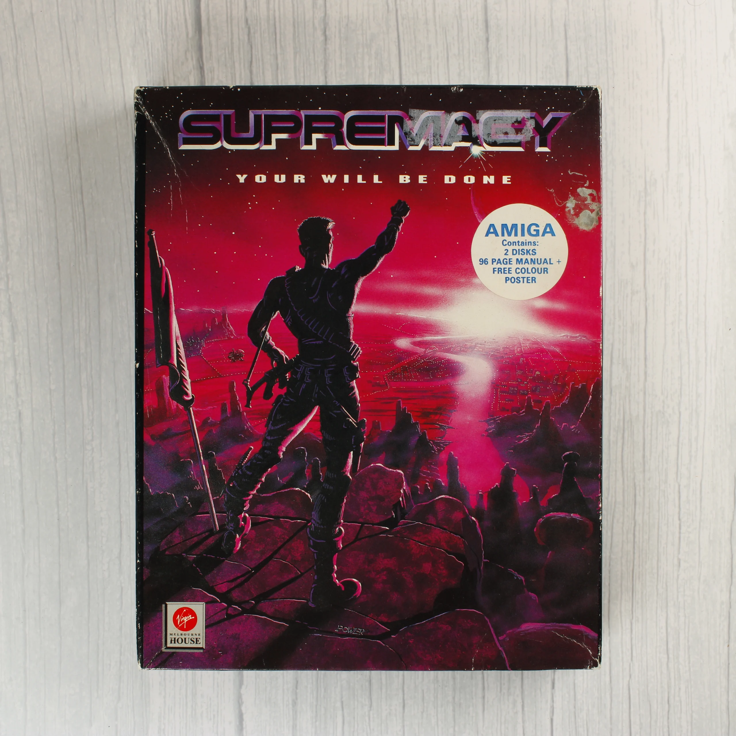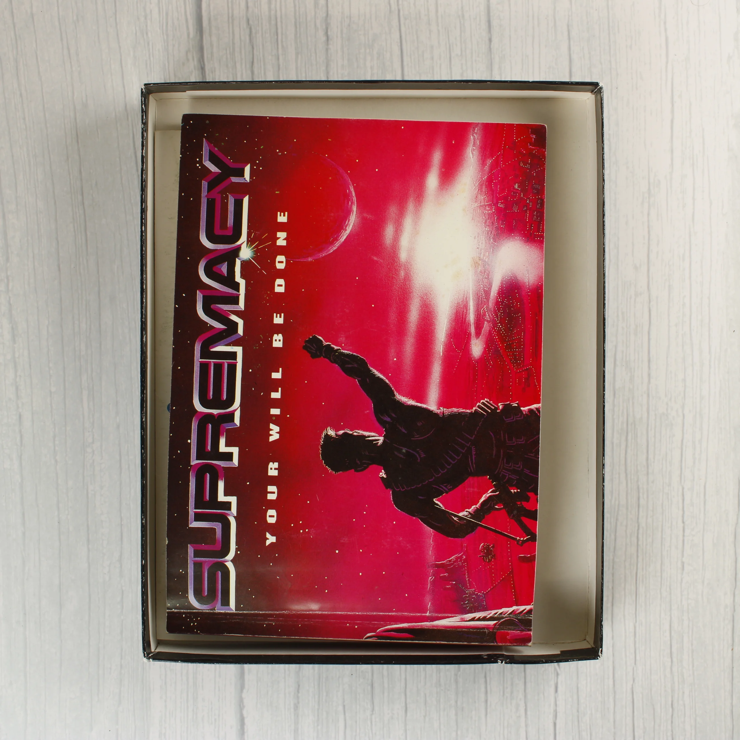 A Supremacy: Your Will Be Done című videójáték Amiga platformra kiadott változata. A csomag egy nagyméretű, színes illusztrációval ellátott kartondobozt tartalmaz, amelyben két darab kék színű, 3,5 colos floppy lemez található. A készlet része továbbá egy többnyelvű használati útmutató és egy színes poszter is. A doboz elején egy futurisztikus tájat néző alak látható, a hátoldalon pedig képernyőmentések és angol nyelvű leírás mutatja be a játékmenetet. A kiadvány a Virgin Mastertronic és a Melbourne House gondozásában jelent meg 1990-ben. A doboz élei mentén kisebb kopások láthatóak, a sarkok enyhén benyomódtak, de a grafika ép és a színek élénkek. A floppy lemezek címkéi tiszták és épek.